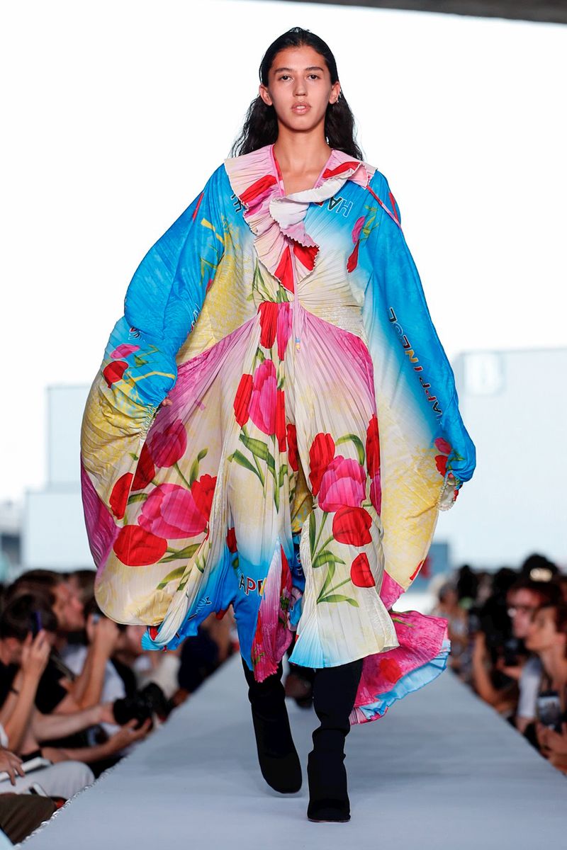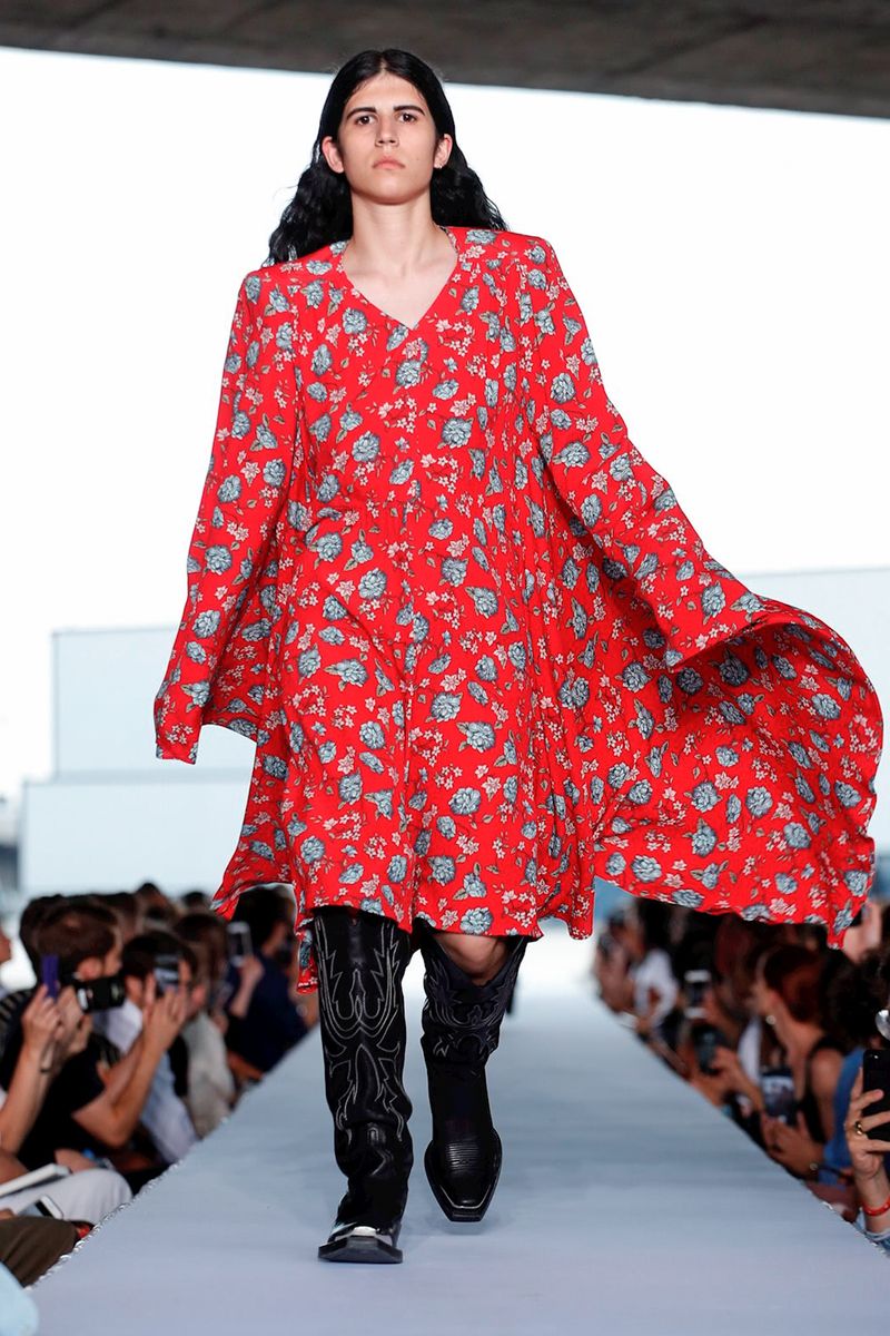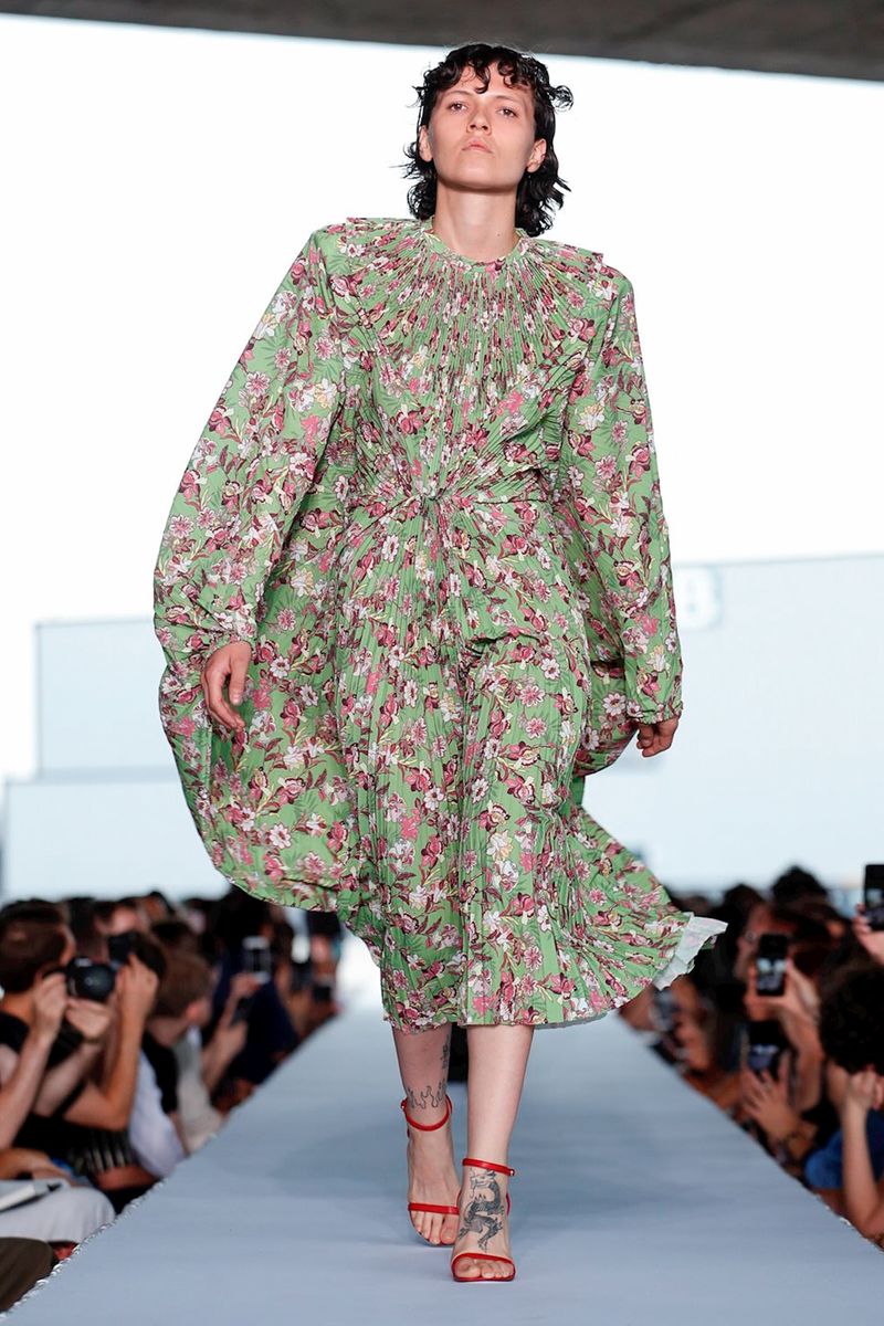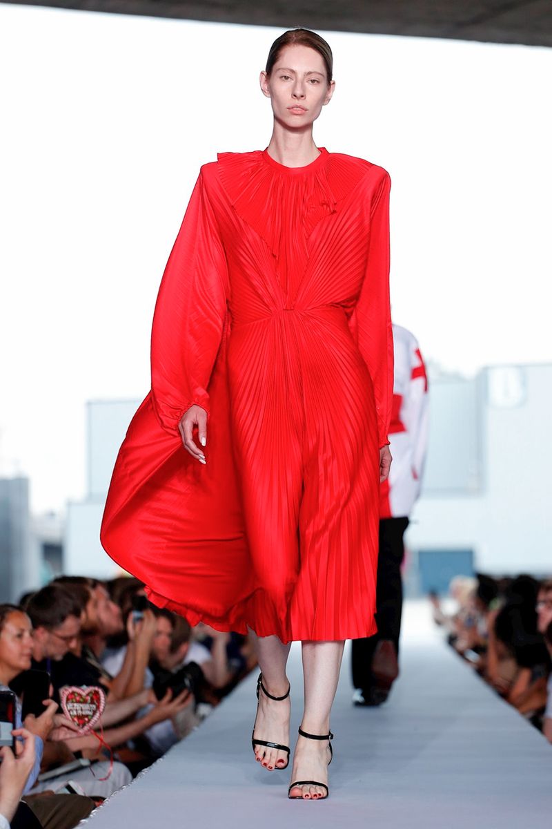 As the designer’s 10th show — Chardonnay was served at the preshow bar; Lebkuchenherzen iced gingerbread hearts served as the show invitation — the collection, with its mix of street, normcore, techno-goth and punk — including spiky Reeboks — also read like his greatest hits, with the familiar oversized jackets, pleated starburst floral dresses, fringed East European-peasant scarf looks, hoodies and reworked denim.