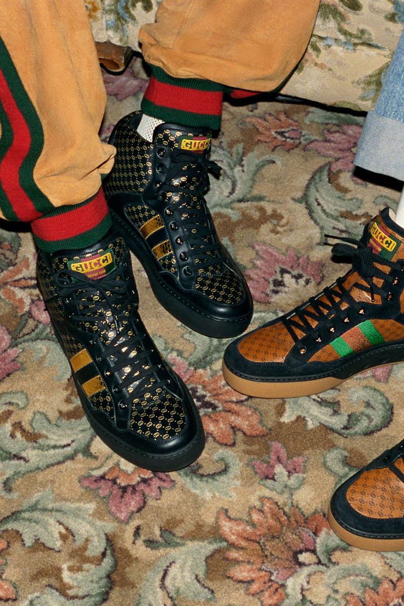 The pieces feature the gold Gucci logo and interlocking GG motifs, and are worn with Web stripe trimmed sweatshirts in chenille jersey.