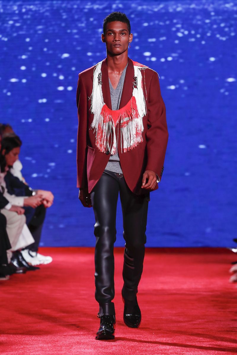 Inspired by the classic American film JAWS. Fringe benefits: exotic menswear details over blazers on sport coats with leather hot pants.