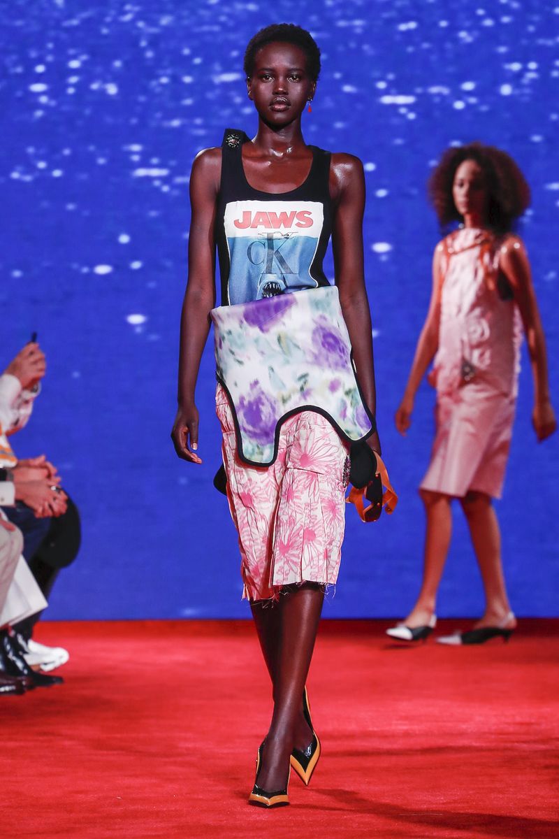 But Simons’s allusions to both movies were quite literal. Jaws’s famous poster was stamped with the cK logo and printed on tanks and tees, the latest example of the merch trend that has swept across the upper echelons of fashion.