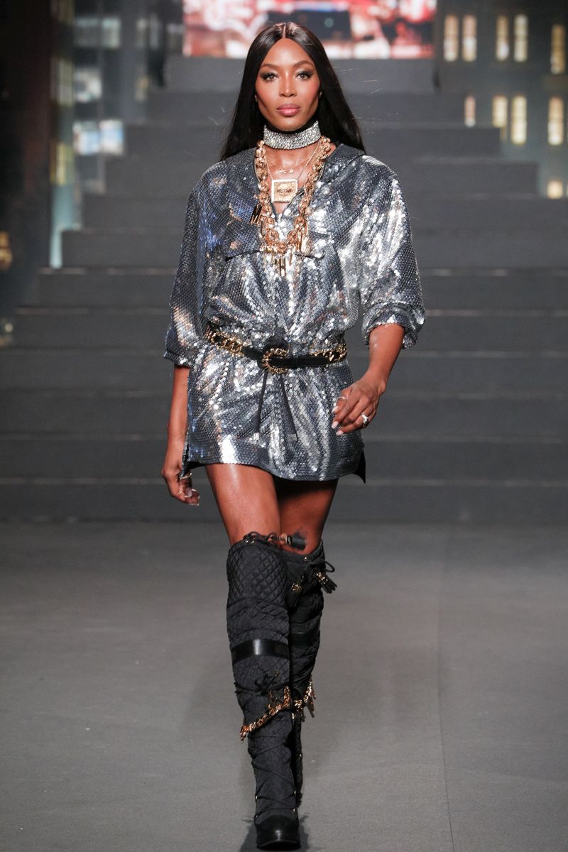 Having in the runway Naomi Campbell, legendary and iconic top model, embraces a silver sequins blouse tied with a black leather belt with high-heels boots from the new season.