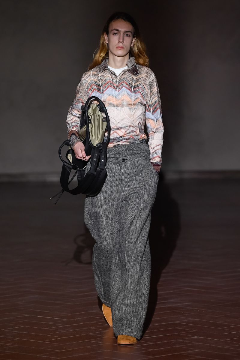 The new men’s footwear collection, meanwhile, went from Michael Jackson-inspired trompe l’oeil black-and-white sock boots, paired with the brand’s first tuxedo, to waders with sharp pleats that were wide enough to tuck pants into. Men’s bags also made an appearance, including a black nylon style suspended within a brown leather harness, worn hoisted on the shoulder like a ghetto blaster.