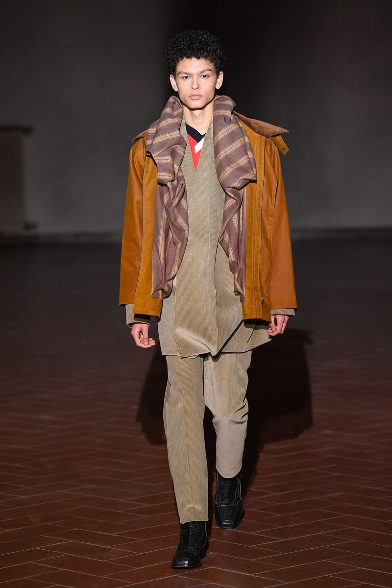 Guests arriving at the Santa Maria Novella basilica in the dark were handed torches to help lead them outside to the Large Cloister, with a crossfire of beams picking out details of the frescoes and garden, and eventually the clothes as the models passed by to the sound of ghoulish chants. It lent a spooky vibe, with the plays on volumes, pleats and slashed garments evoking Renaissance dress. But it also made it hard to see the details.