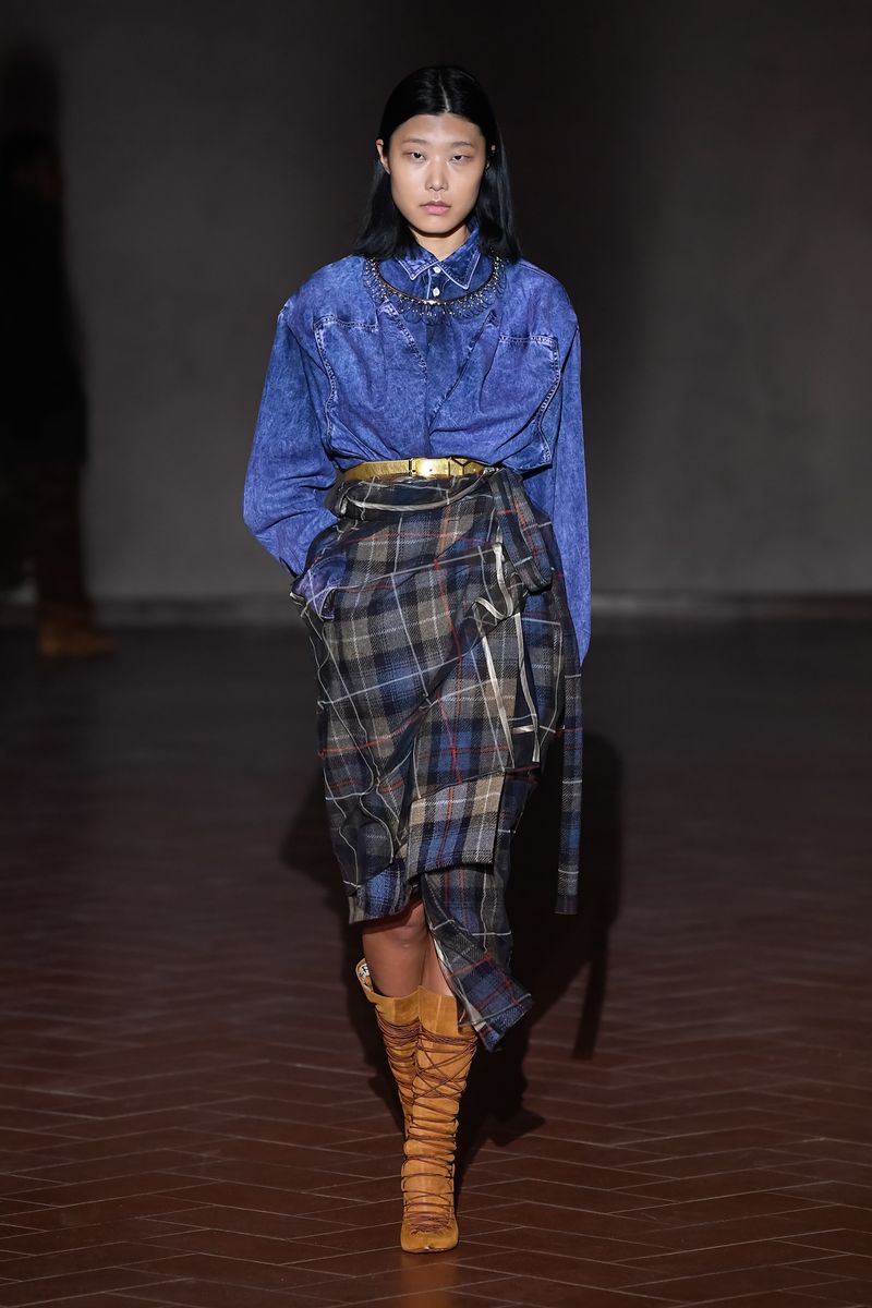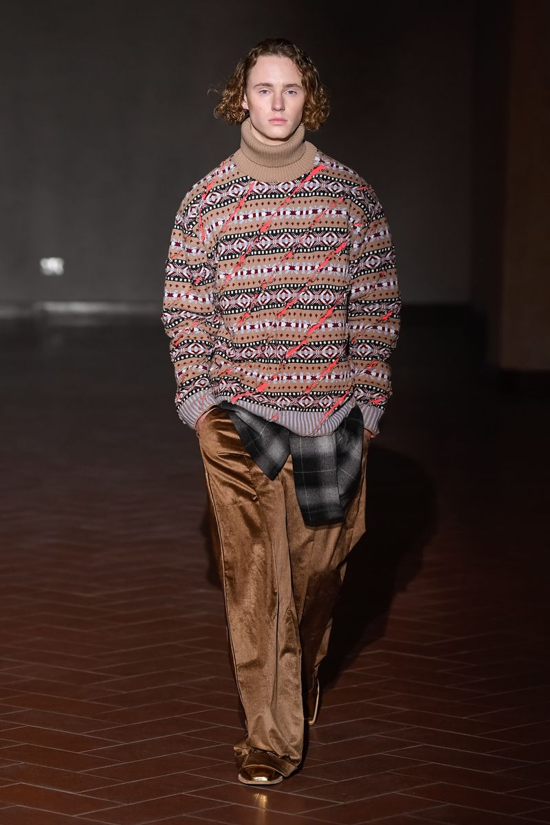 Martens’ penchant for perverting familiar men’s wear staples took flight in the standout knits in tartan and argyle patterns with removable second-skin transparent overlayers printed with the same motif.