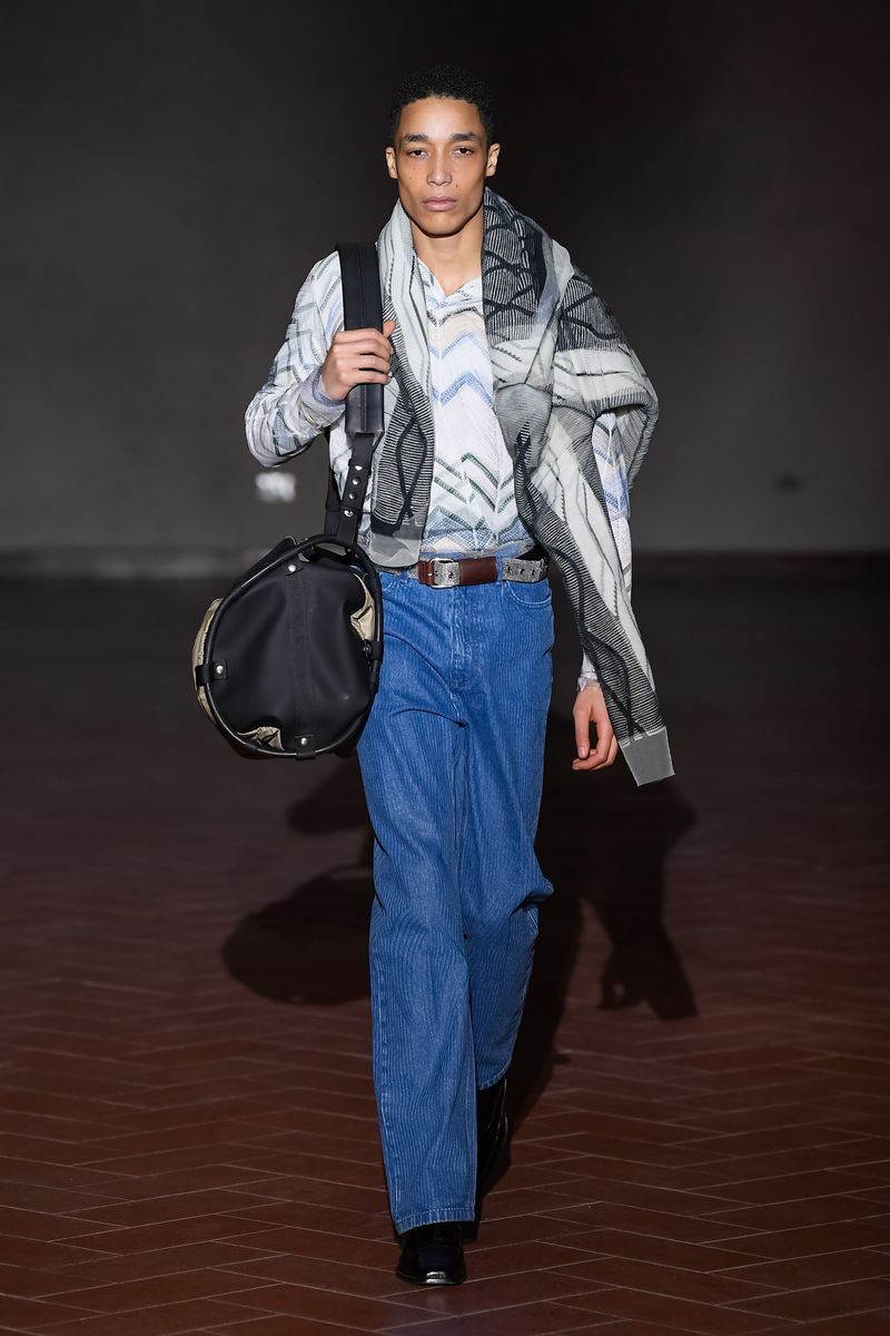 The new men’s footwear collection, meanwhile, went from Michael Jackson-inspired trompe l’oeil black-and-white sock boots, paired with the brand’s first tuxedo, to waders with sharp pleats that were wide enough to tuck pants into. Men’s bags also made an appearance, including a black nylon style suspended within a brown leather harness, worn hoisted on the shoulder like a ghetto blaster.