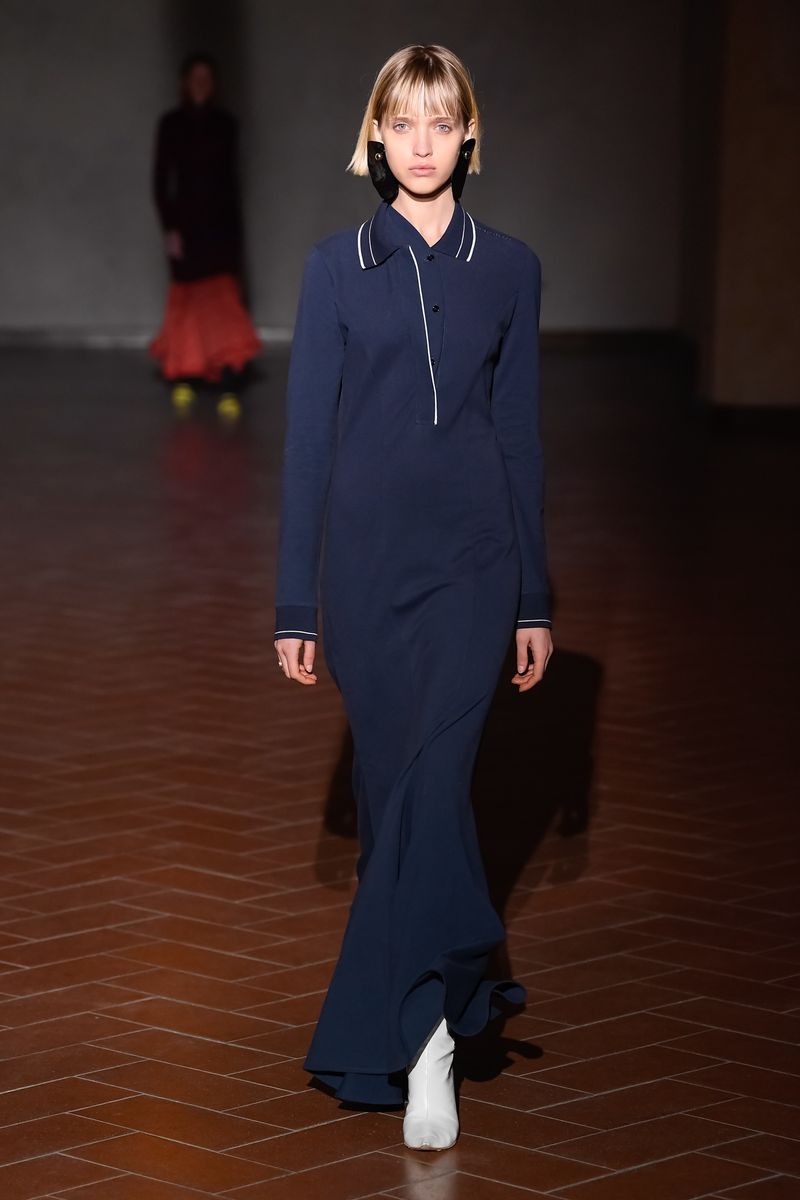Guests arriving at the Santa Maria Novella basilica in the dark were handed torches to help lead them outside to the Large Cloister, with a crossfire of beams picking out details of the frescoes and garden, and eventually the clothes as the models passed by to the sound of ghoulish chants. It lent a spooky vibe, with the plays on volumes, pleats and slashed garments evoking Renaissance dress. But it also made it hard to see the details.