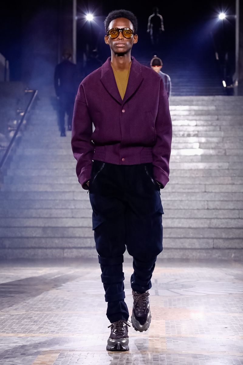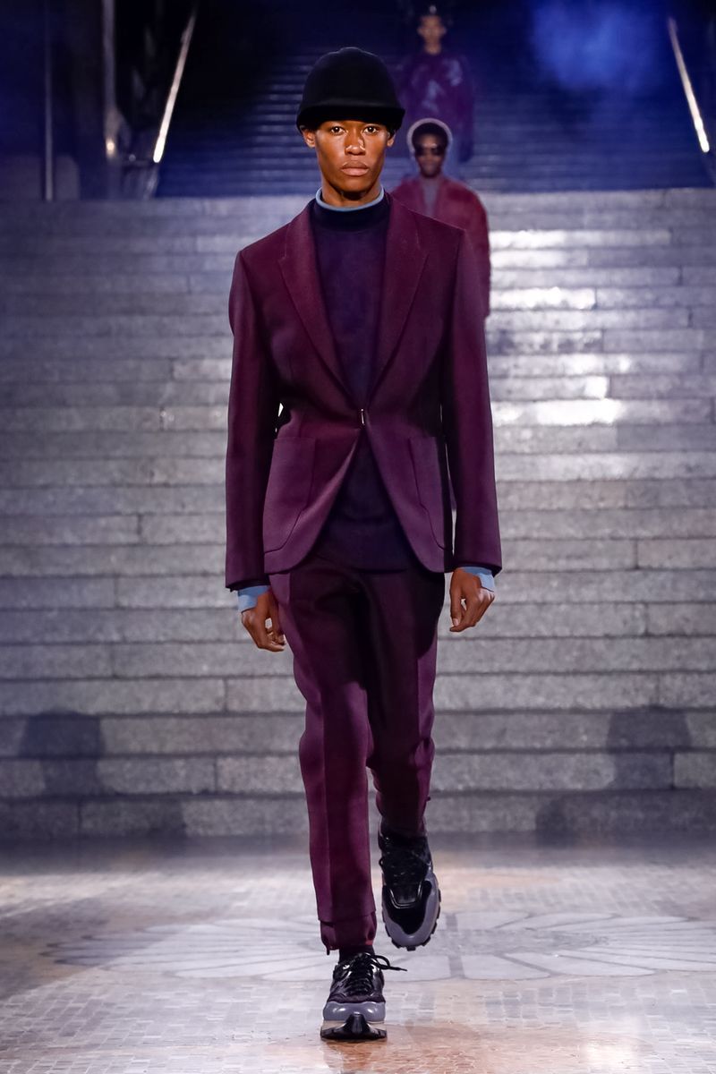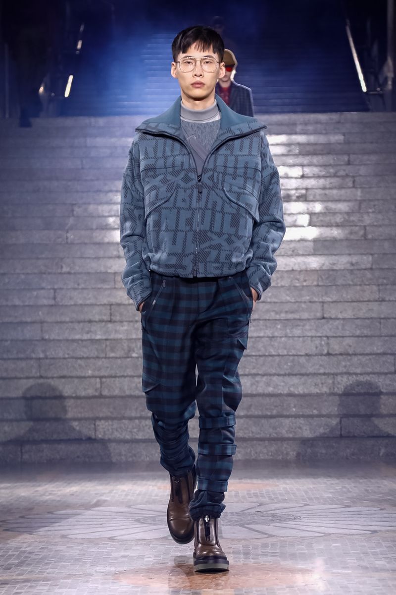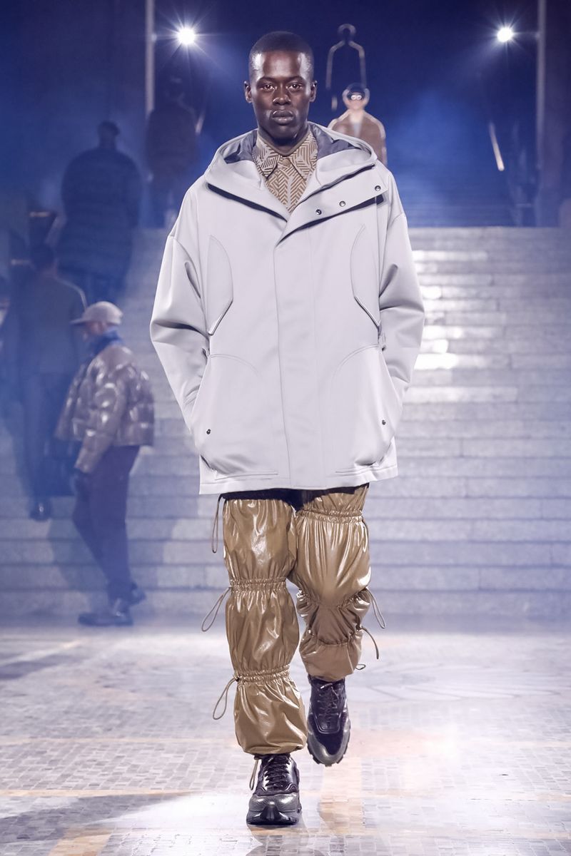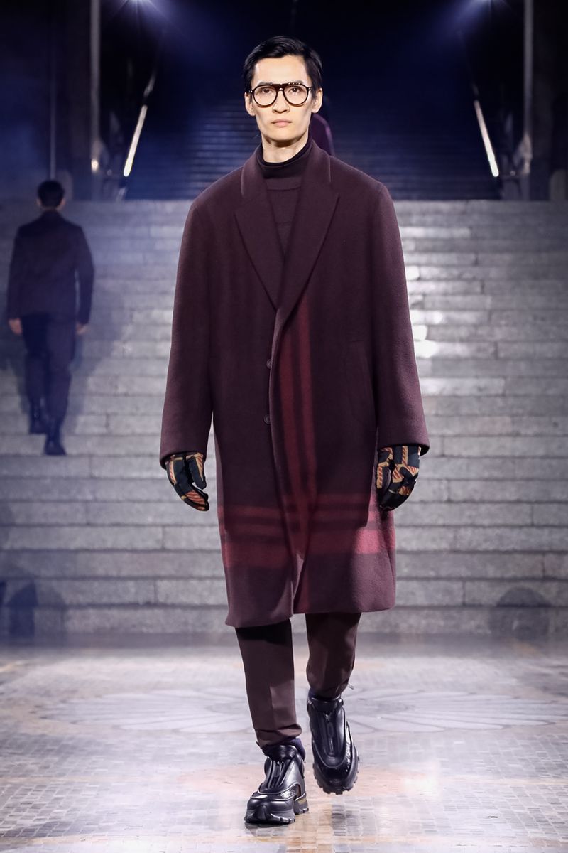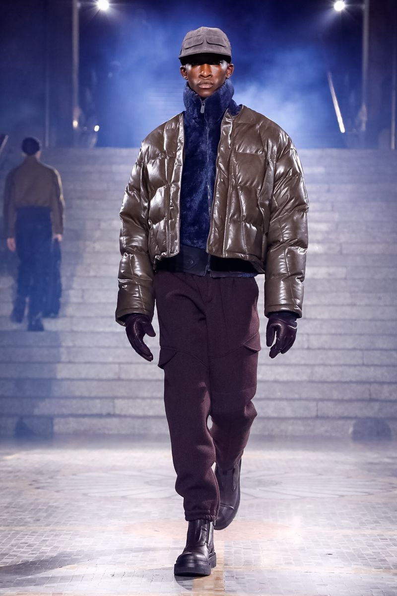 Ermenegildo Zegna presented cozy layered looks featuring glossy futuristic fabrics and lettered details in hues of deep blues, purples, and greens.