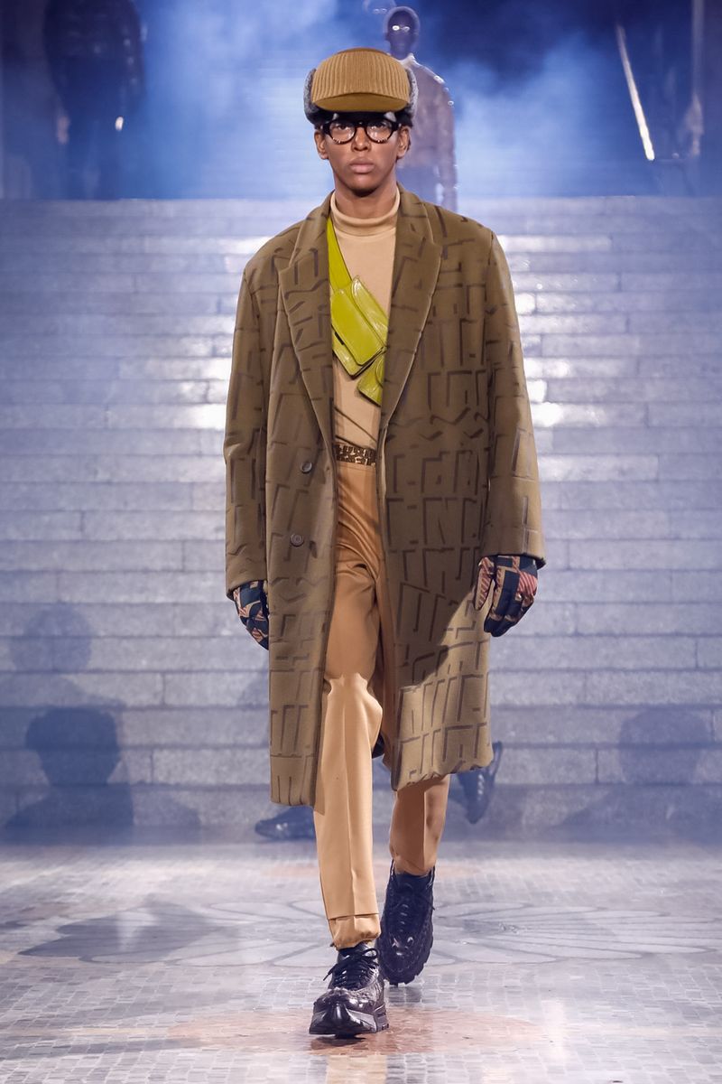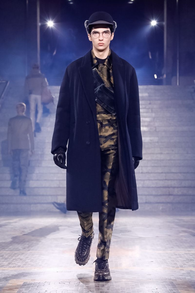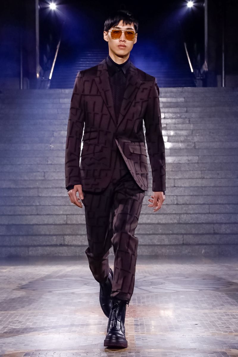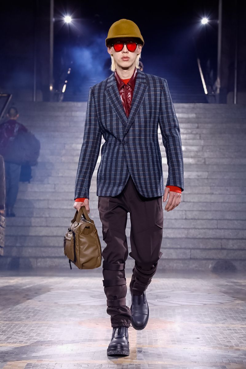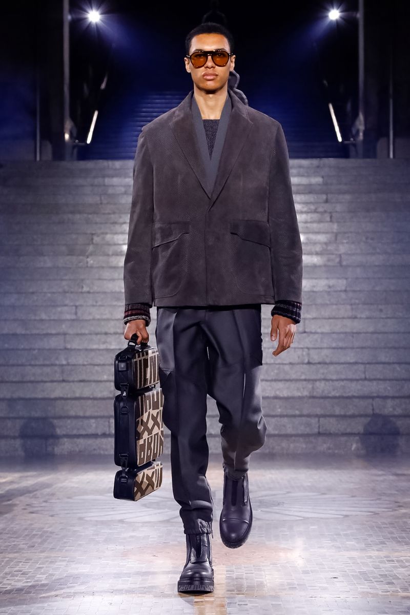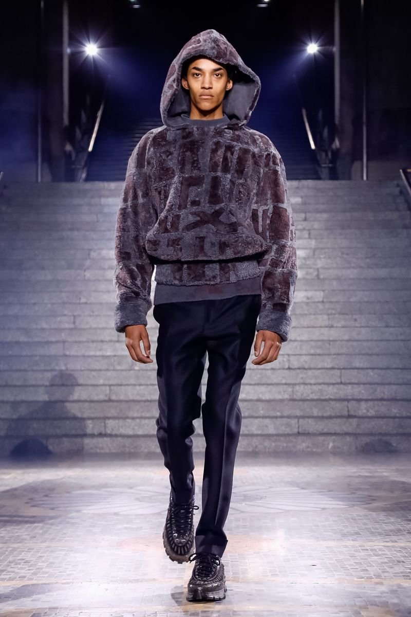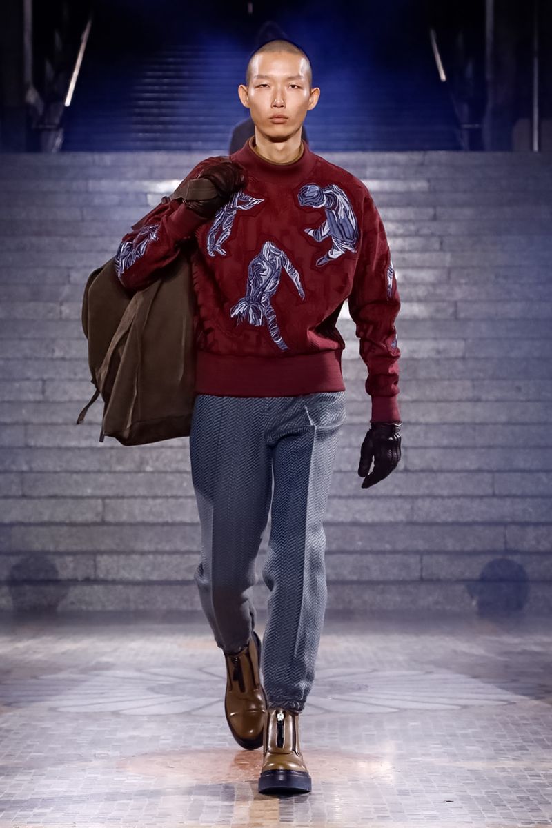 Ermenegildo Zegna presented cozy layered looks featuring glossy futuristic fabrics and lettered details in hues of deep blues, purples, and greens.