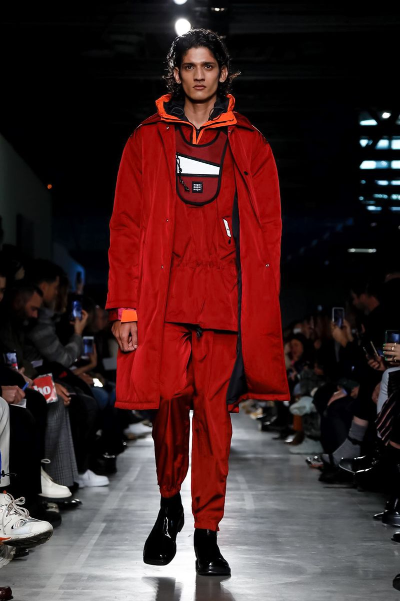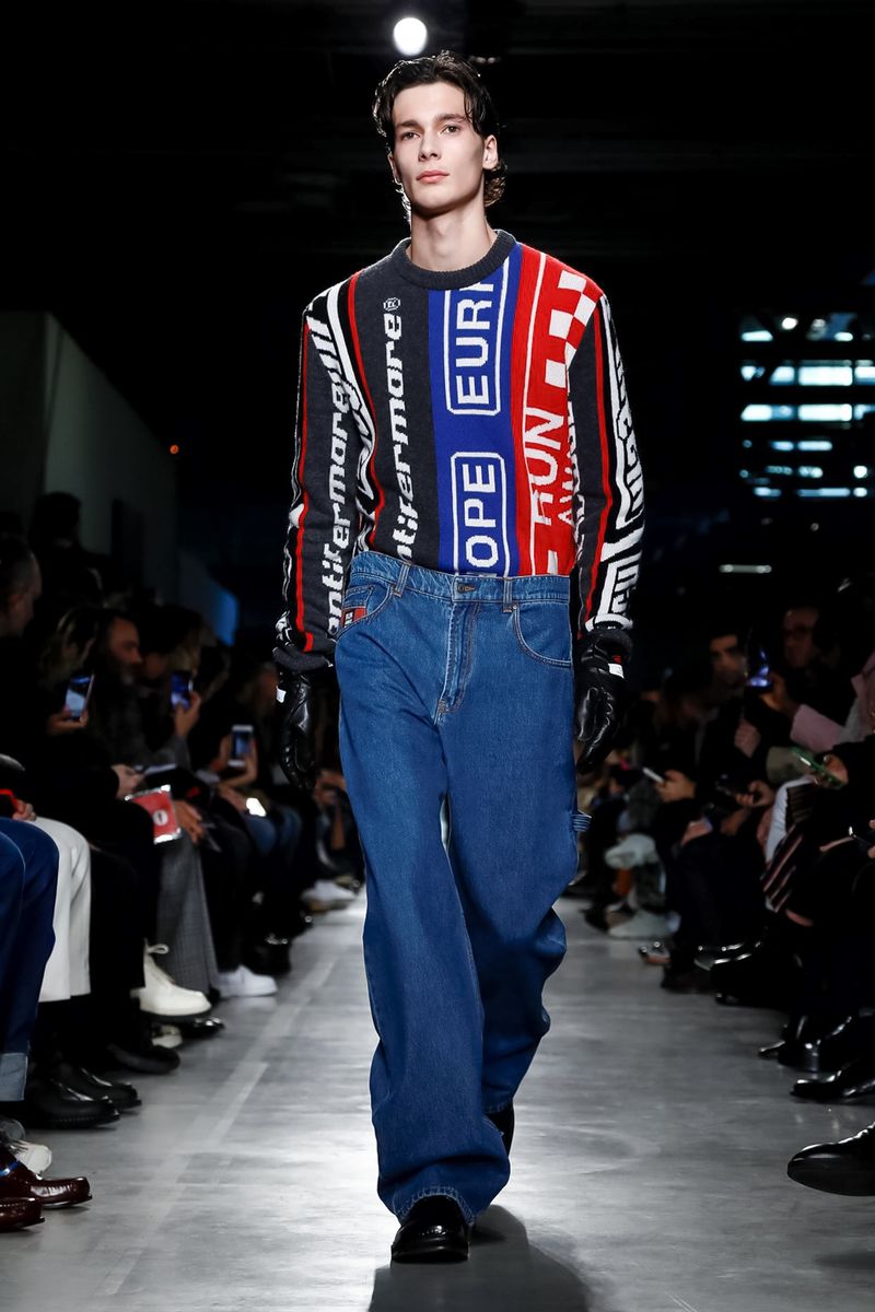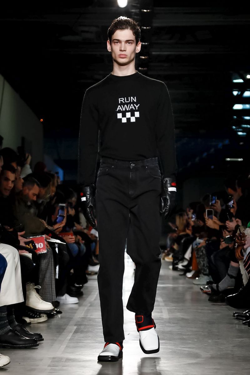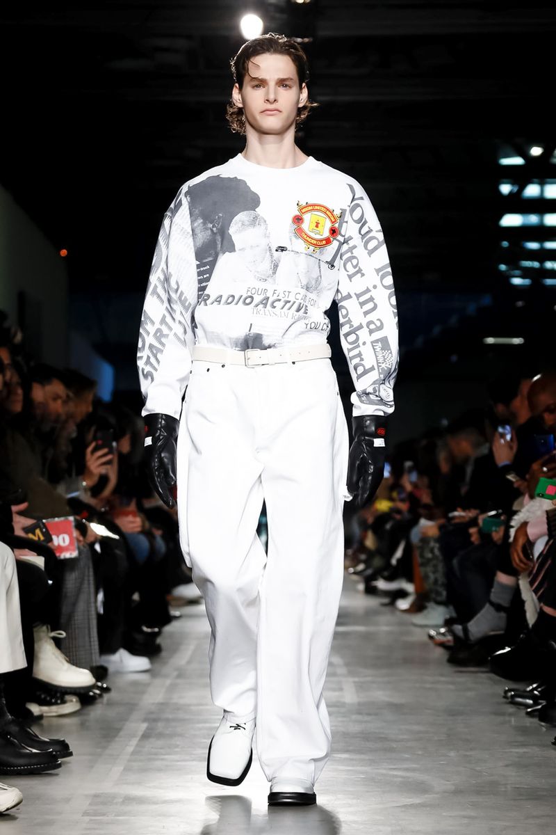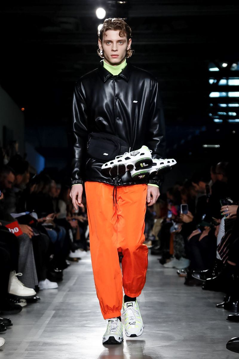 The designer’s collaboration with Fila, on the brand’s 1992 Silva model, came strung from fanny packs worn by some of the models, with square-toed boots punctuating most of the looks.