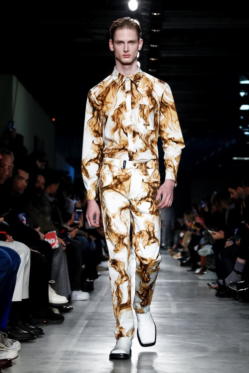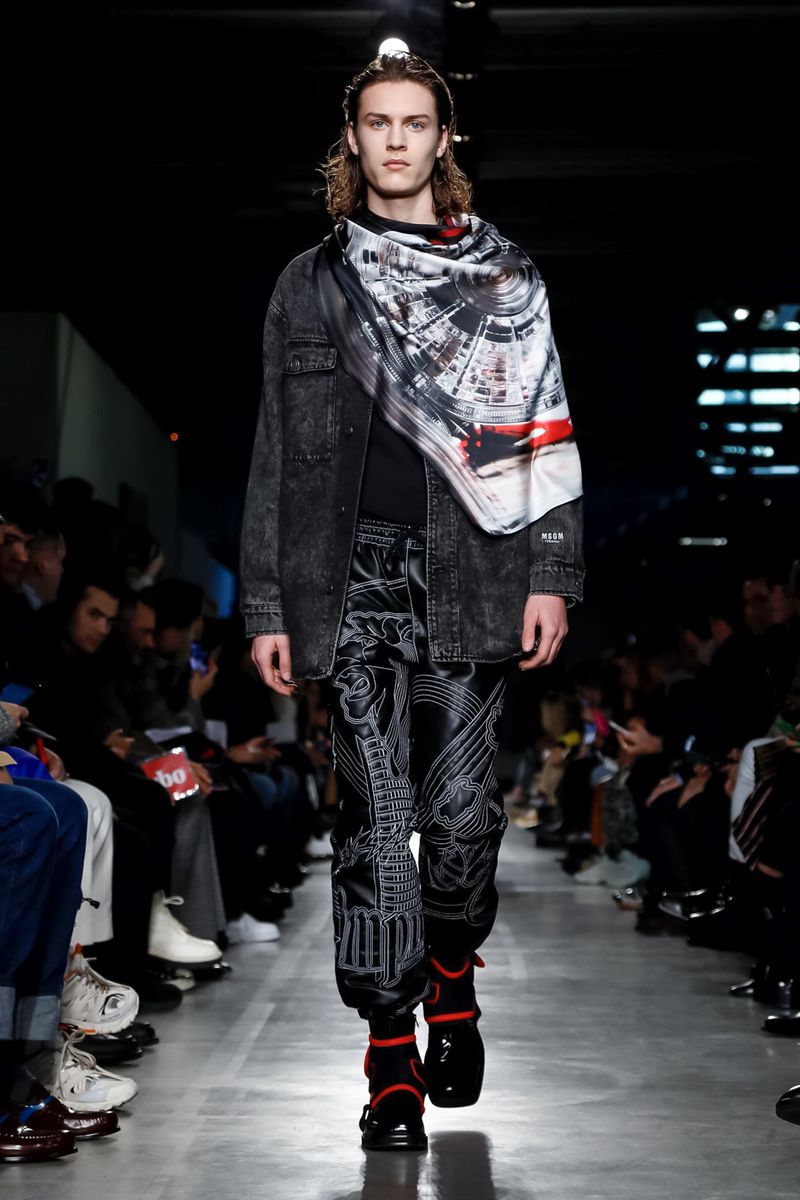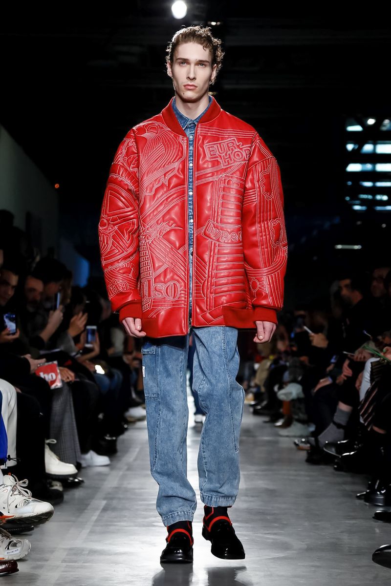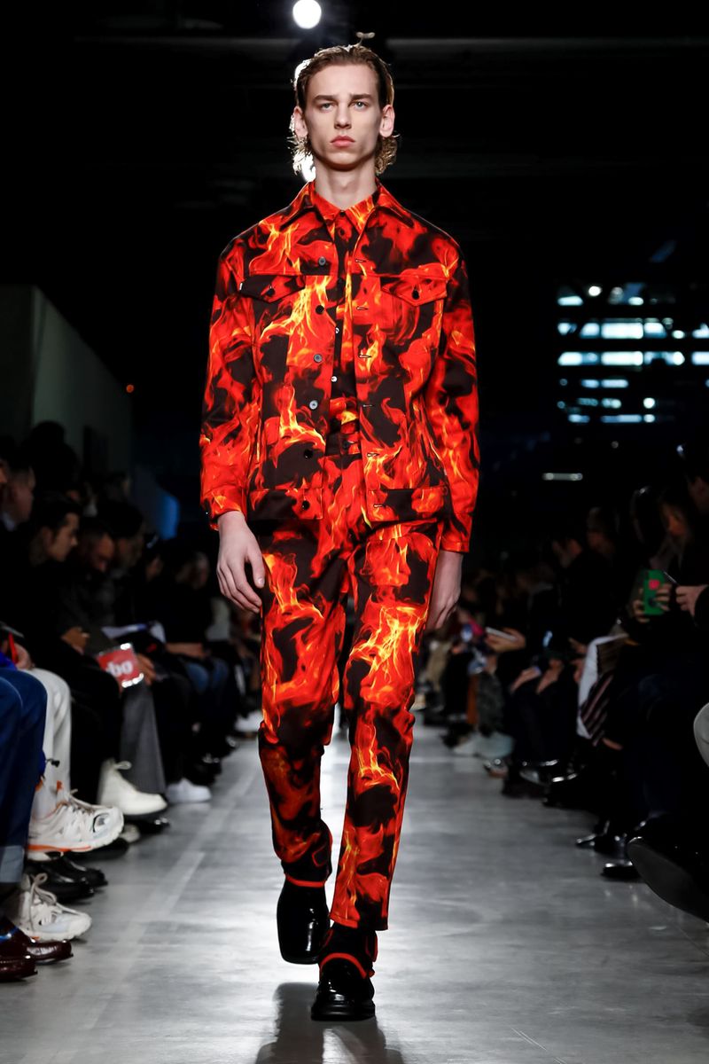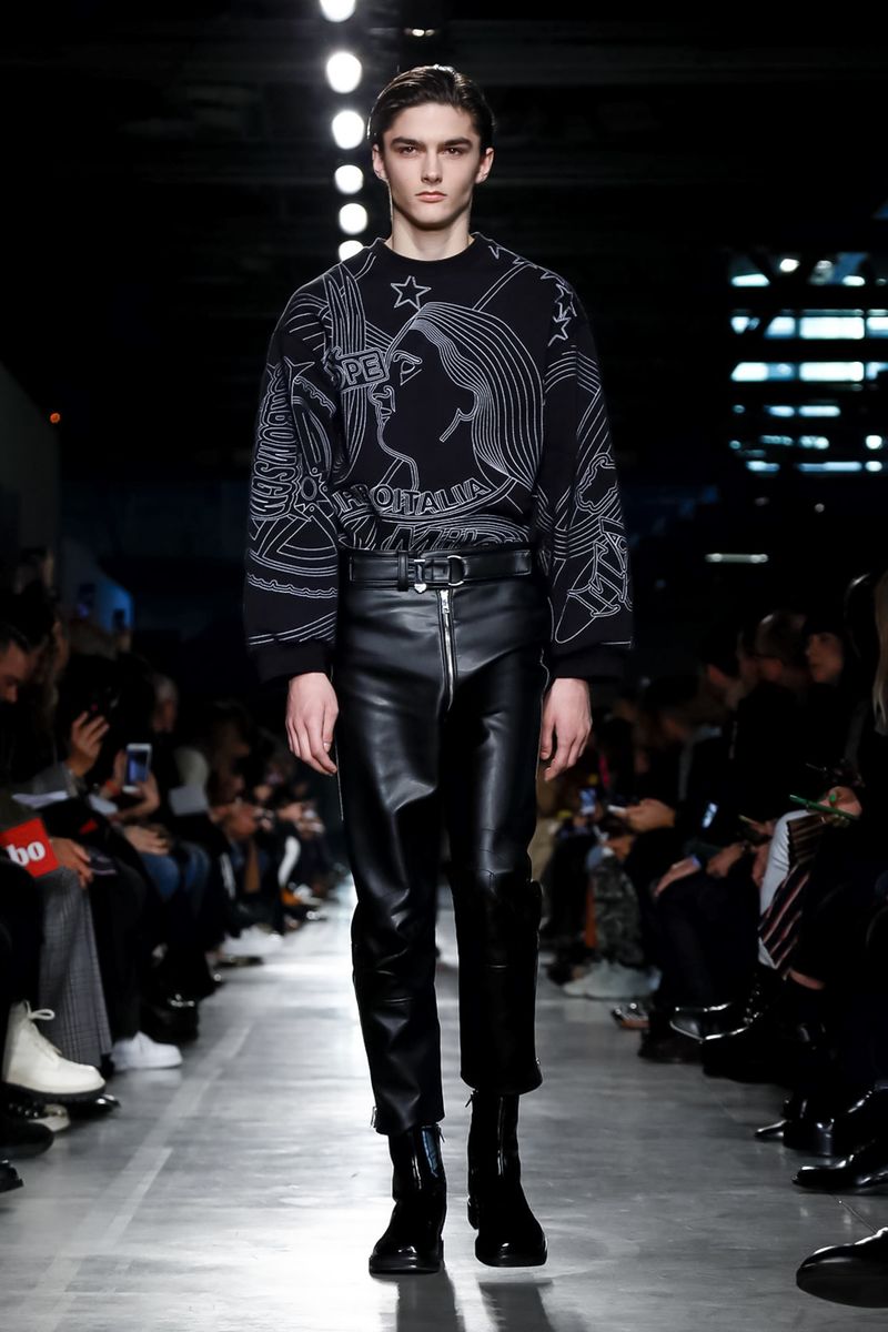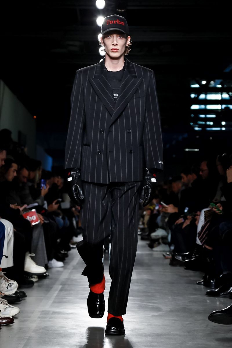 Tailoring in the expanded collection ranged from boxy double-breasted pinstripe blazers to the designer’s take on the new suit, pairing a zipped top and pant with the word ‘proibito,’ or ‘forbidden,’ printed on the fly.