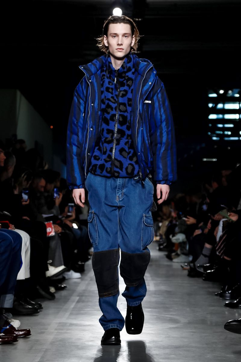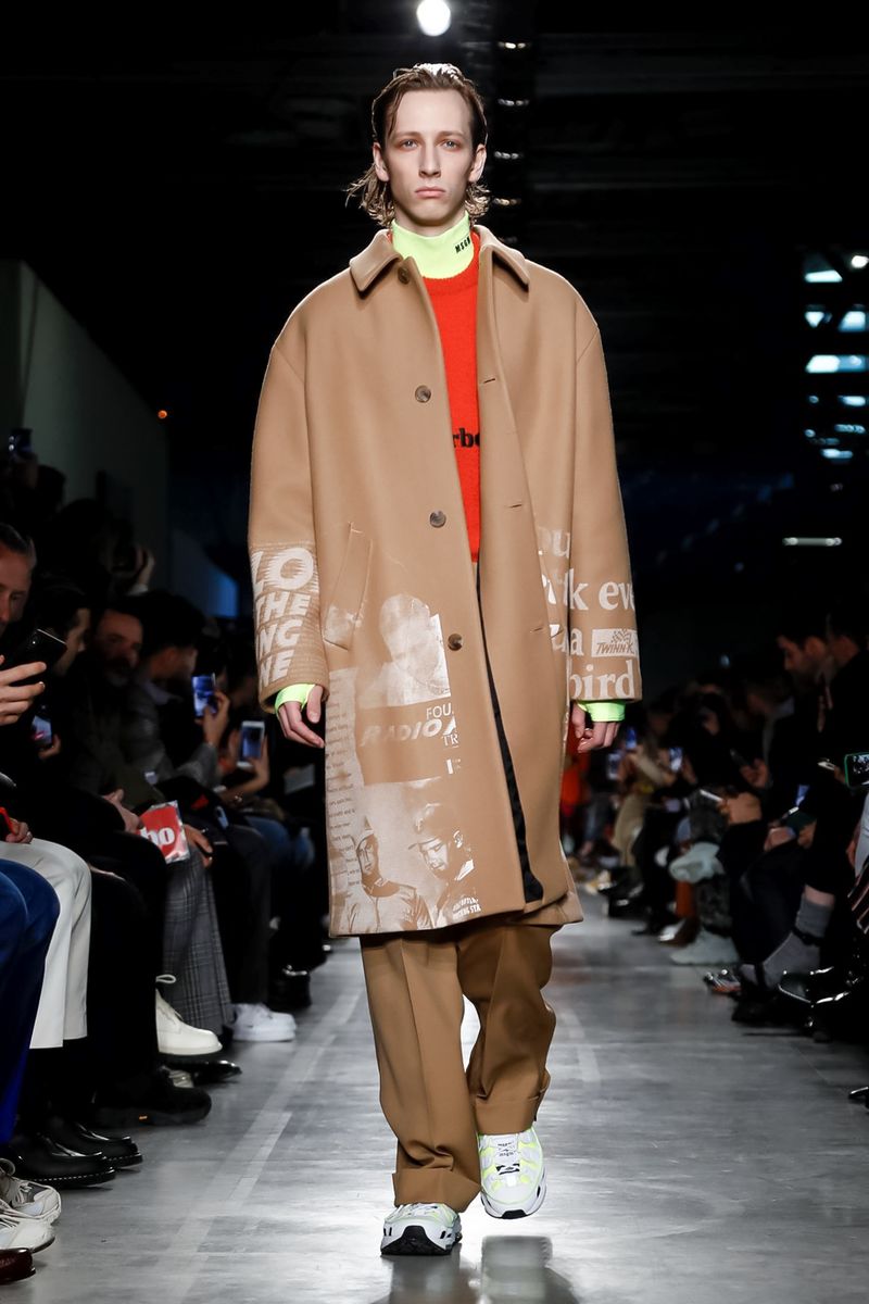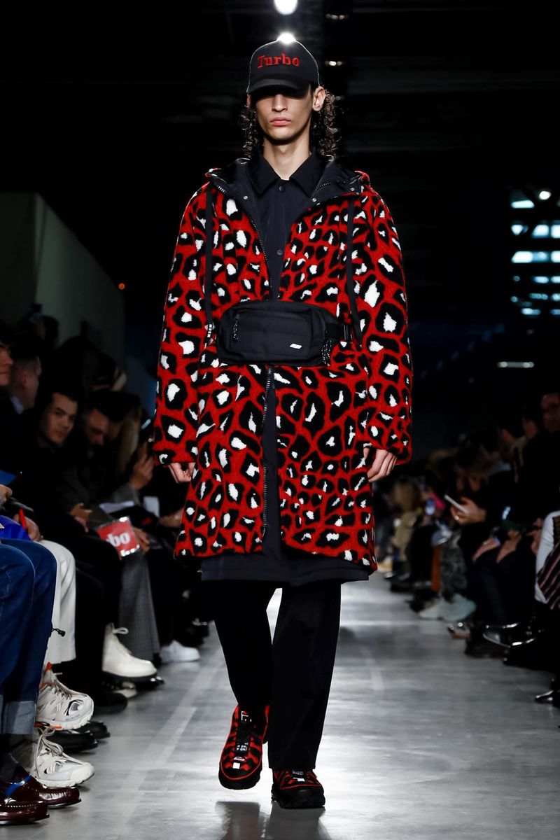 Channeling a vitamin-charged energy, meanwhile, were the pink and orange neon K-ways in crunchy technical nylon, interspersed with gray and beige total looks with more of a Made-in-Italy bent, with puffers and leopard-print fleeces layered over elegant double-breasted wool coats. Giving a symbolic hometown nod were the black sweatshirts embroidered with the outline of the Madonnina topping the spire of Milan’s Duomo cathedral, part of the city’s skyline.
