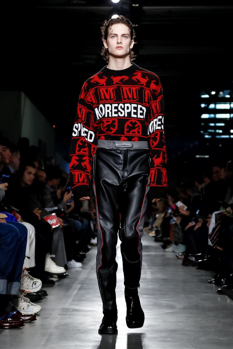 The motorsport theme came through most literally in the flame-licked denim, logo T-shirts, archive photos of Ayrton Senna printed in shirts, and color-blocked shiny leathers with gathered drawstring waists.