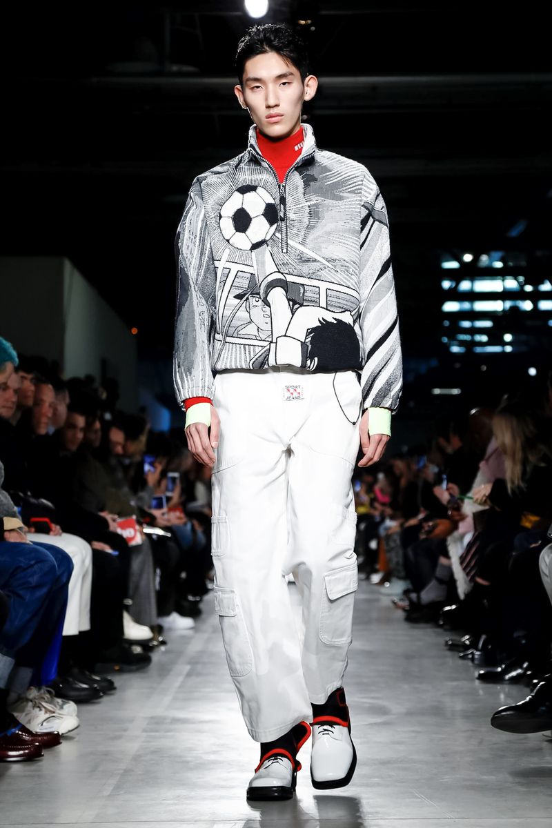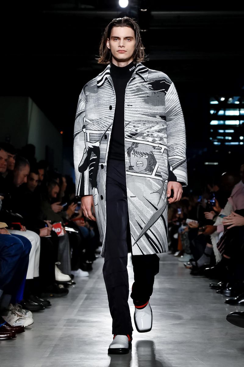 Dynamic black-and-white scenes from the Eighties Japanese soccer-themed cartoon “Holly & Benji” surfaced in jacquards on coats, with as Giorgetti’s message to the world: “If everything is under control, you need to change gear.”