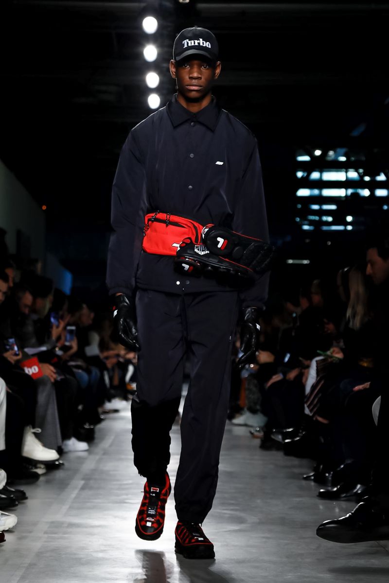 The designer’s collaboration with Fila, on the brand’s 1992 Silva model, came strung from fanny packs worn by some of the models, with square-toed boots punctuating most of the looks.