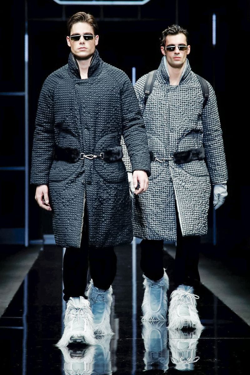 “If we take away the frills…and leave it clean, it’s a pleasant way of dressing. Close to nature, with animal footprints, [faux] fur treated unconventionally…so we got back to nature with this collection, less technology, less Technogym.”