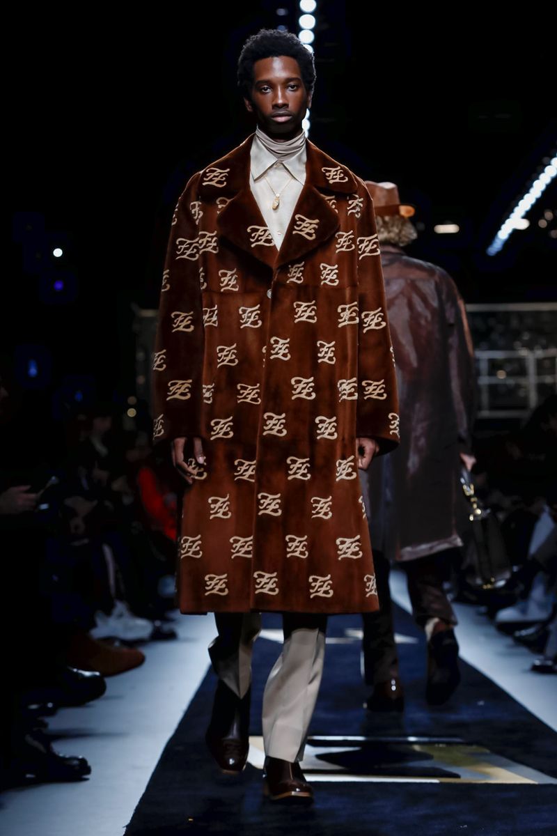 Tailoring had lots of fresh edges: Roomy suits were done in wool shot through with silver threads or nylon, and some were layered with striped ties, dressy shirts and jewelry — gold chains and medallions — recalling Lagerfeld’s own style. During an interview, Venturini Fendi herself was wearing a chunky signet ring from the collection with a curly FF logo created by Lagerfeld in the Eighties. Her shirt was covered in an abstract FF pattern, a Nineties Lagerfeld creation that recalled Italy’s Futurist artists.