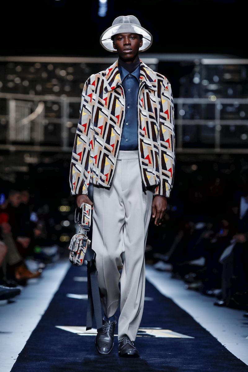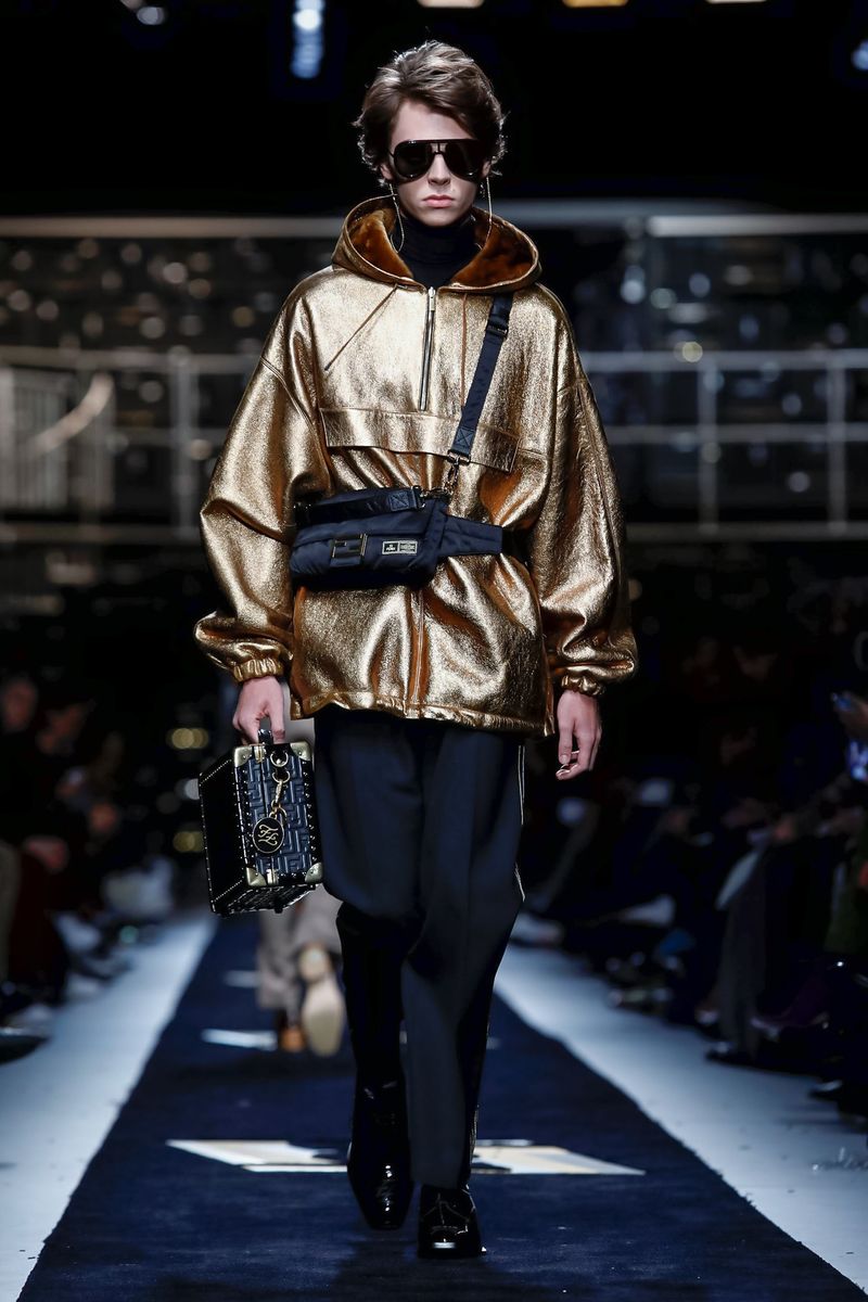 Tailoring had lots of fresh edges: Roomy suits were done in wool shot through with silver threads or nylon, and some were layered with striped ties, dressy shirts and jewelry — gold chains and medallions — recalling Lagerfeld’s own style. During an interview, Venturini Fendi herself was wearing a chunky signet ring from the collection with a curly FF logo created by Lagerfeld in the Eighties. Her shirt was covered in an abstract FF pattern, a Nineties Lagerfeld creation that recalled Italy’s Futurist artists.