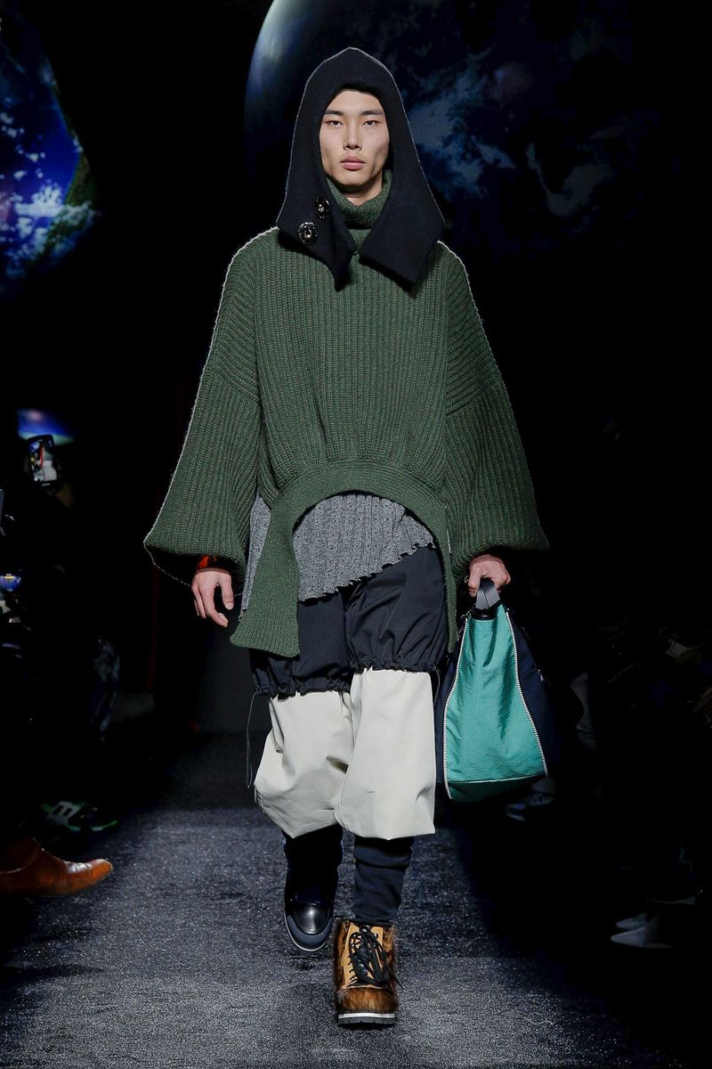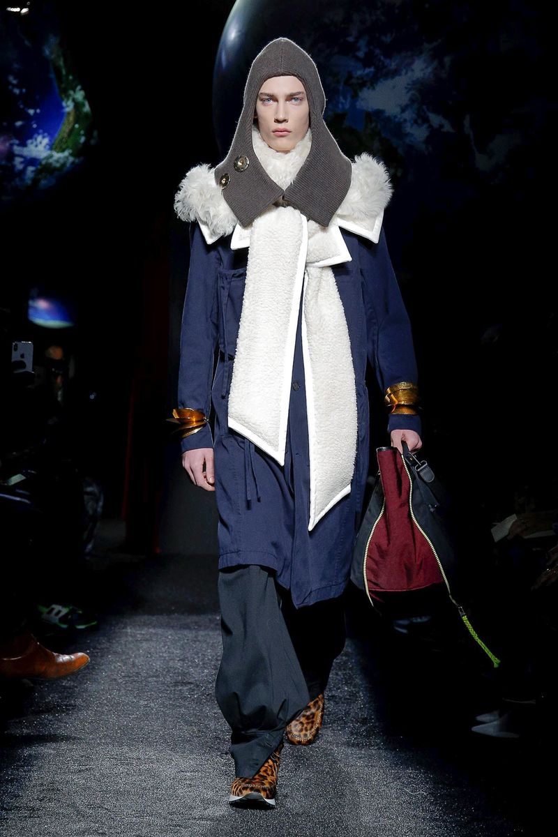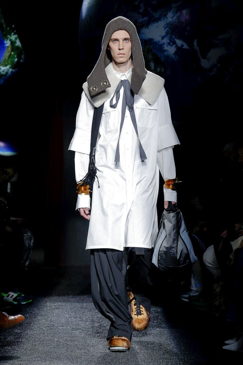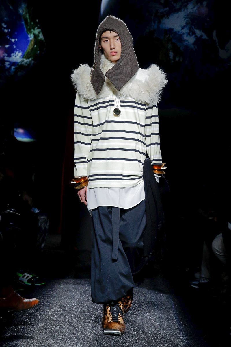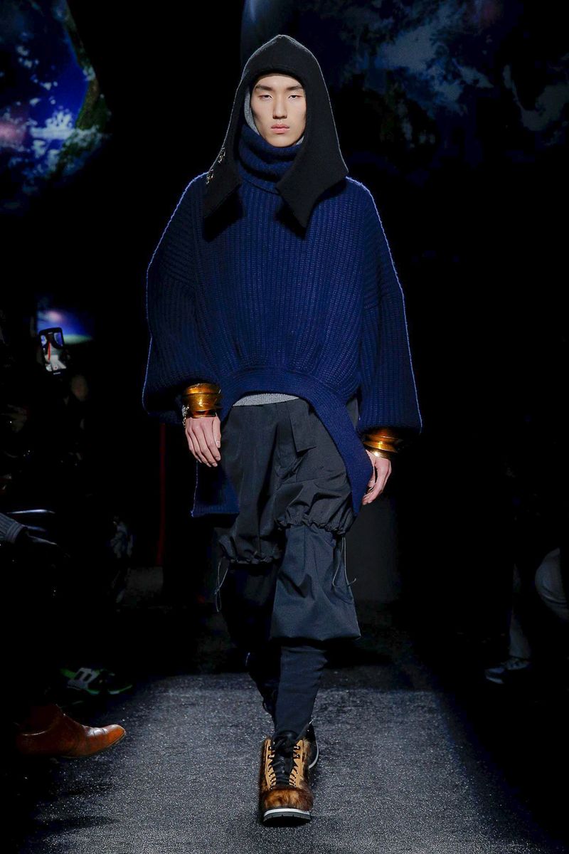 Models walked in a dark room under suspended plastic globes; Anderson said he was going for a “backlit” feel and looking to mimic 2-D images on an iPhone screen. They wore snood-like hoods that recalled the monastery, cutout herringbone coats with ribbed knit panels and lots of layers and textures, including long and breezy cotton shirts, knitted tunics, and chunky sweaters with thick, floppy tabs.