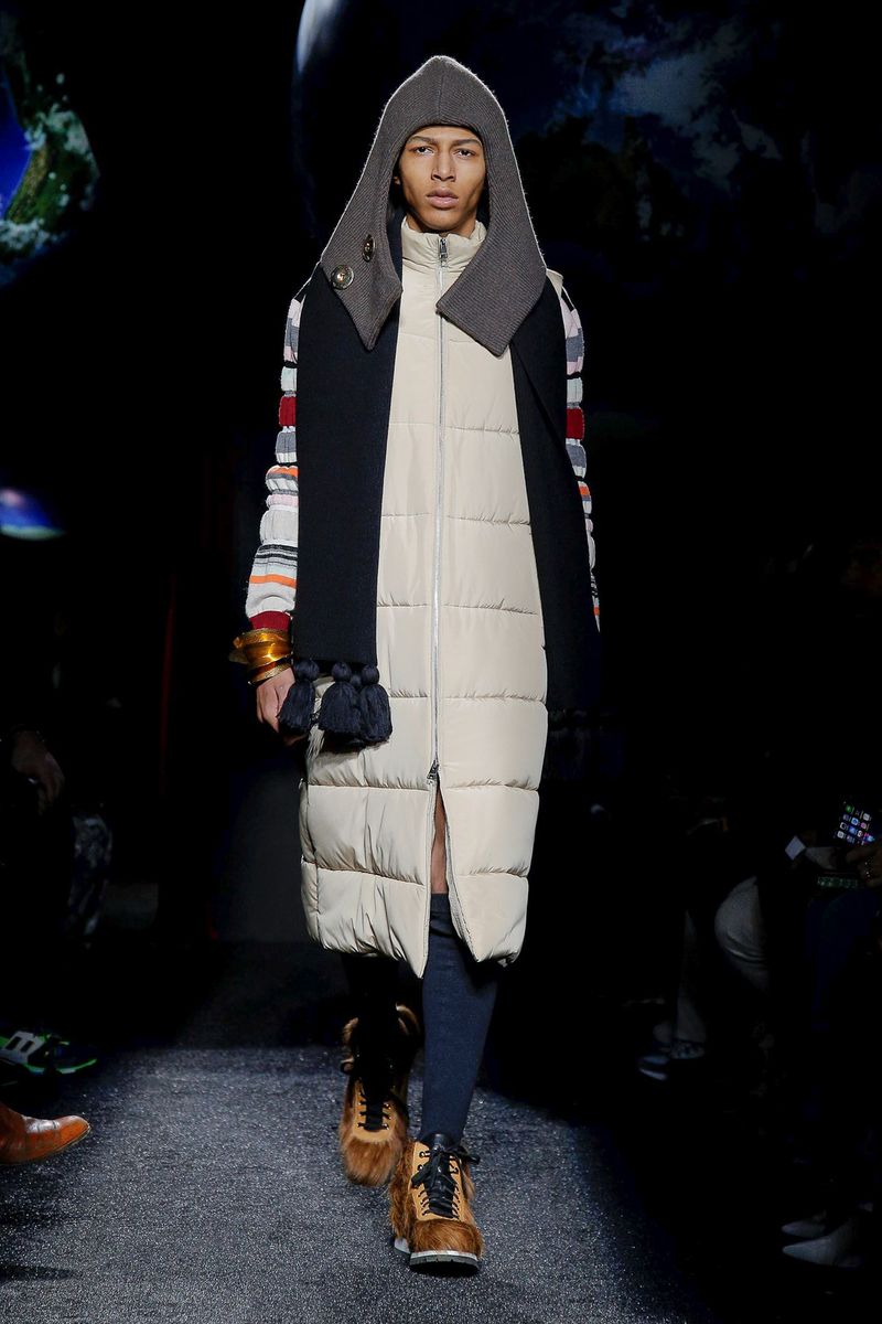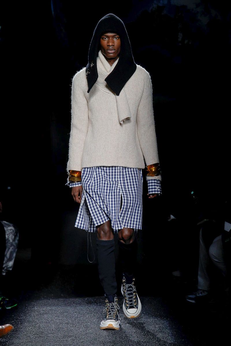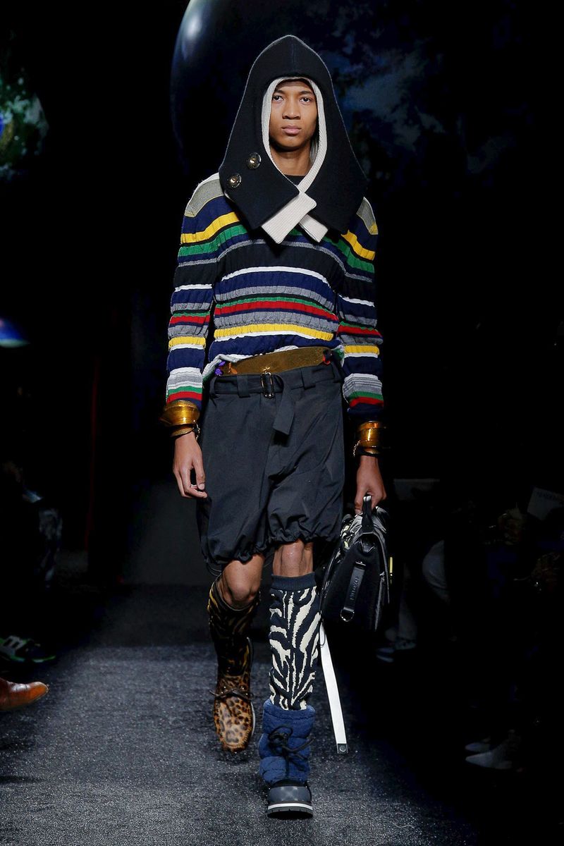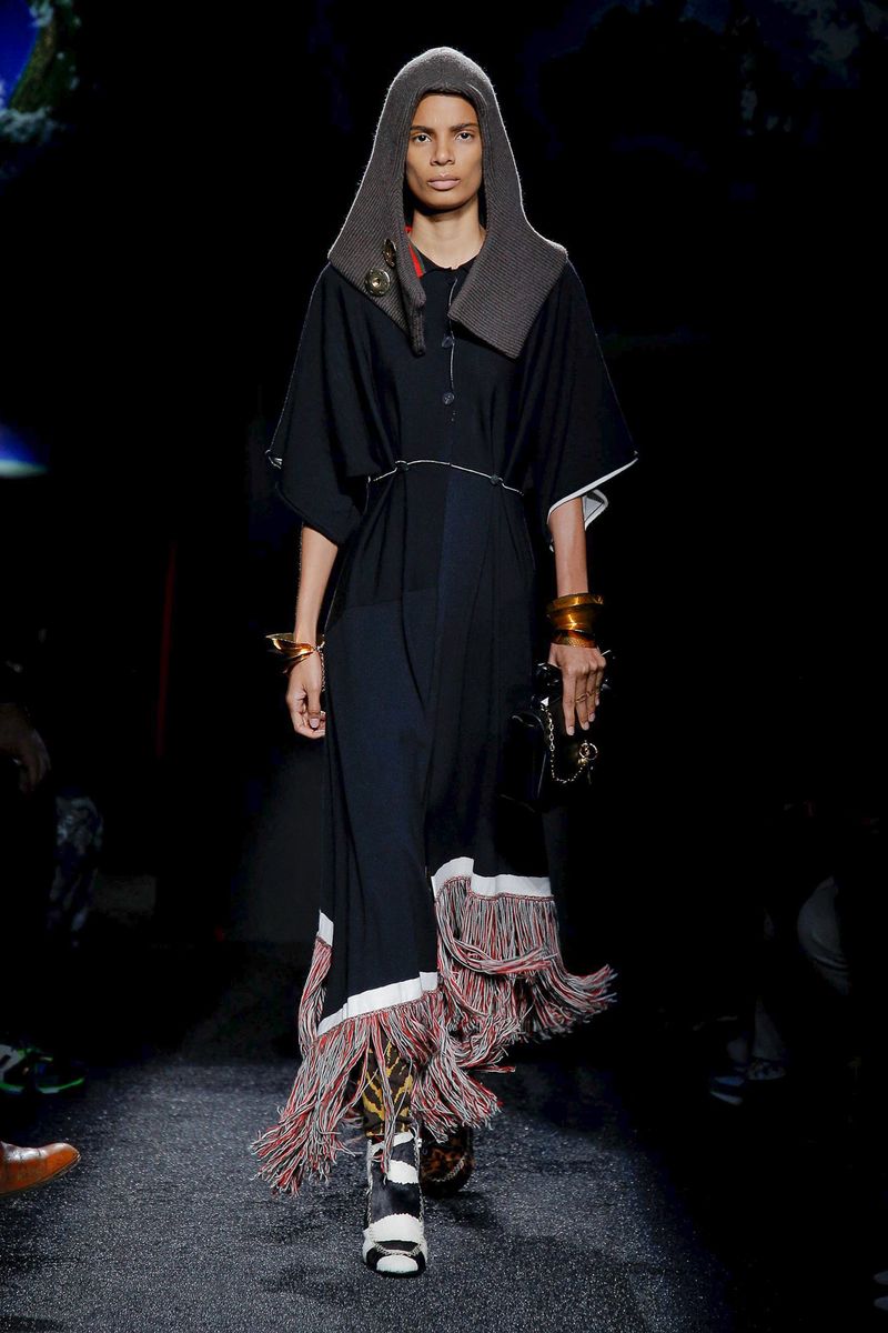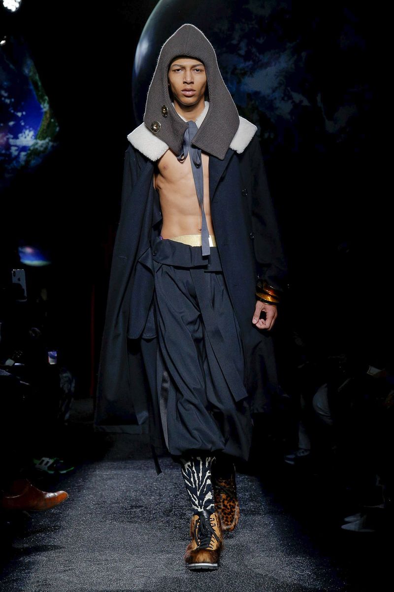 Models walked in a dark room under suspended plastic globes; Anderson said he was going for a “backlit” feel and looking to mimic 2-D images on an iPhone screen. They wore snood-like hoods that recalled the monastery, cutout herringbone coats with ribbed knit panels and lots of layers and textures, including long and breezy cotton shirts, knitted tunics, and chunky sweaters with thick, floppy tabs.