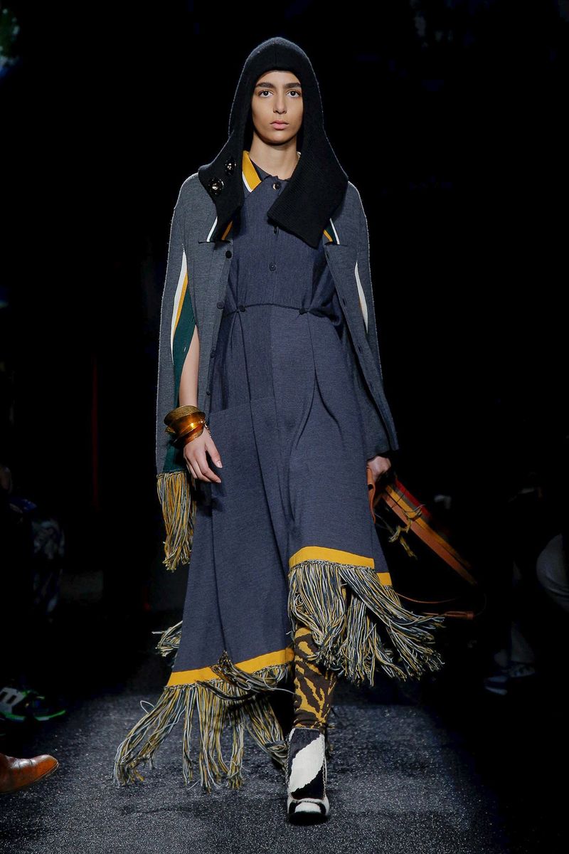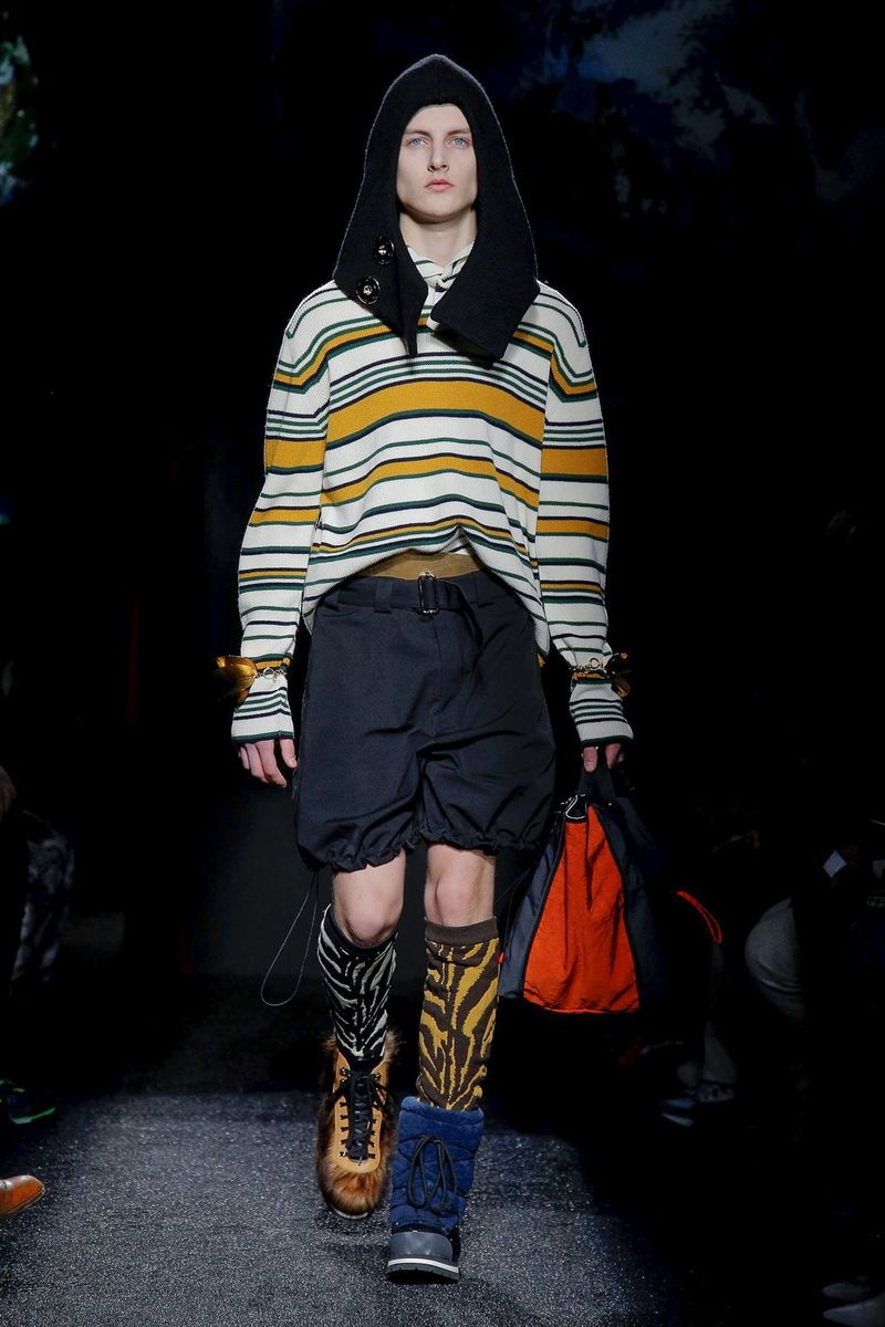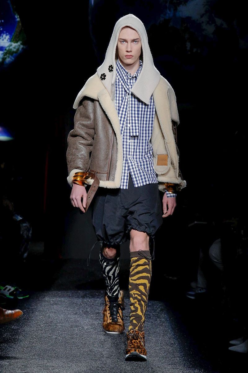 Shearling tippets and long scarves had a raw feel, as did hiking boots covered in shaggy cowhide and contrasting animal prints. Anderson described the collection as “a bit pagan,” and impromptu, adding that he wanted to toss together unrelated things, hence the mismatched shoes and socks, drawstring shorts layered over trousers and swooshing fringes and upholstery tassels dangling from coat and trouser hems and dripping from sweater cuffs.