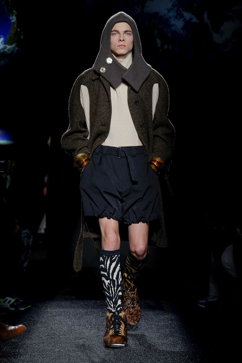 Shearling tippets and long scarves had a raw feel, as did hiking boots covered in shaggy cowhide and contrasting animal prints. Anderson described the collection as “a bit pagan,” and impromptu, adding that he wanted to toss together unrelated things, hence the mismatched shoes and socks, drawstring shorts layered over trousers and swooshing fringes and upholstery tassels dangling from coat and trouser hems and dripping from sweater cuffs.