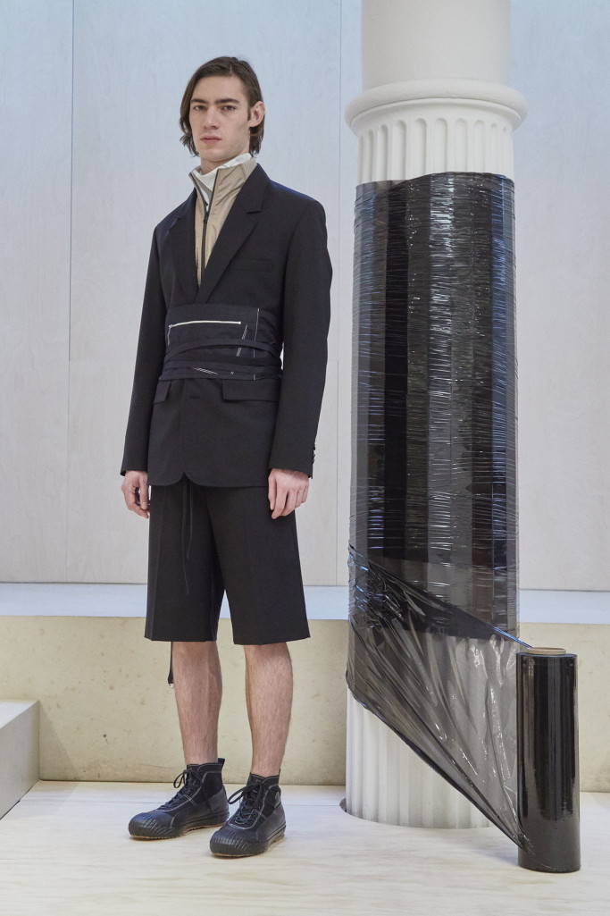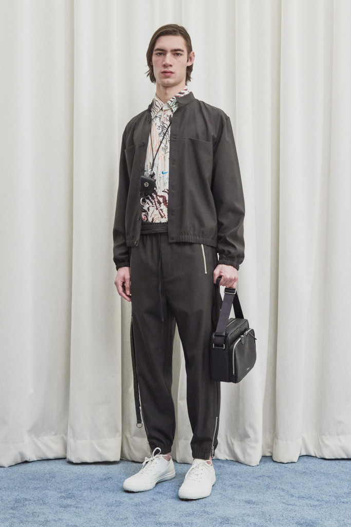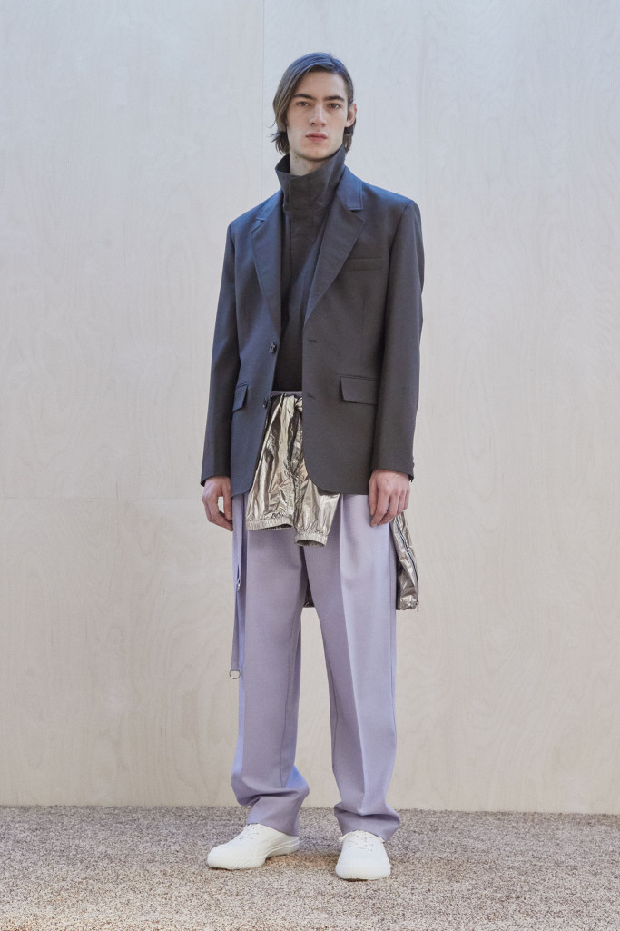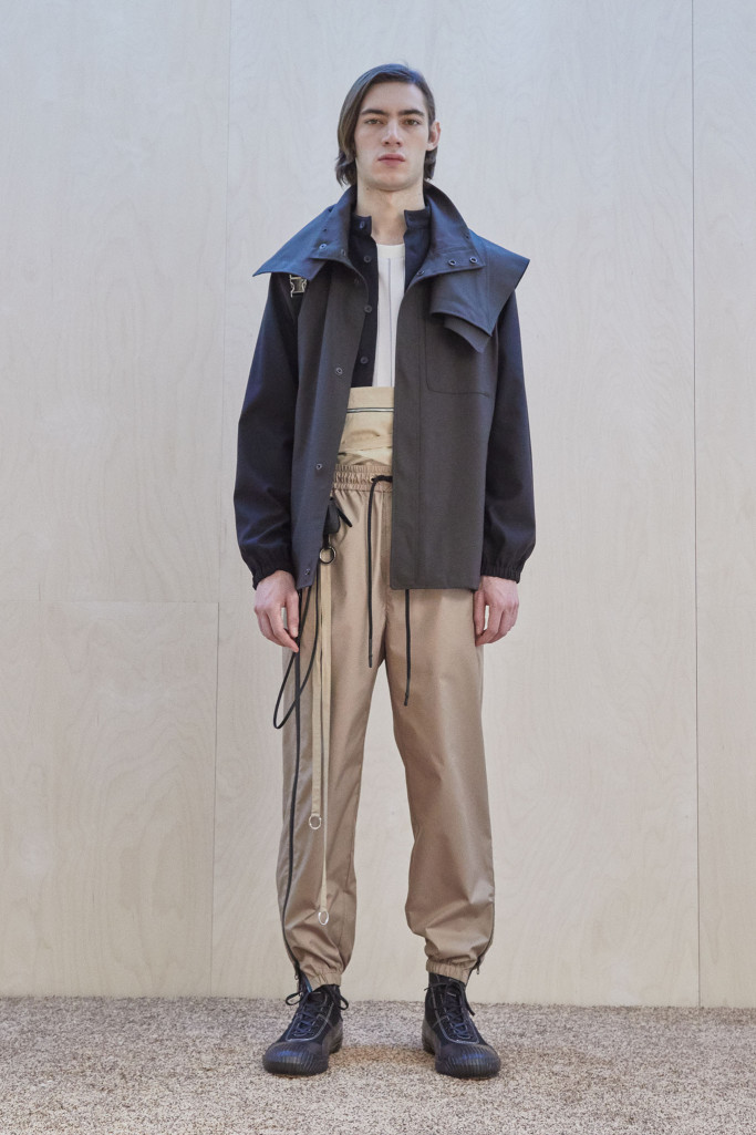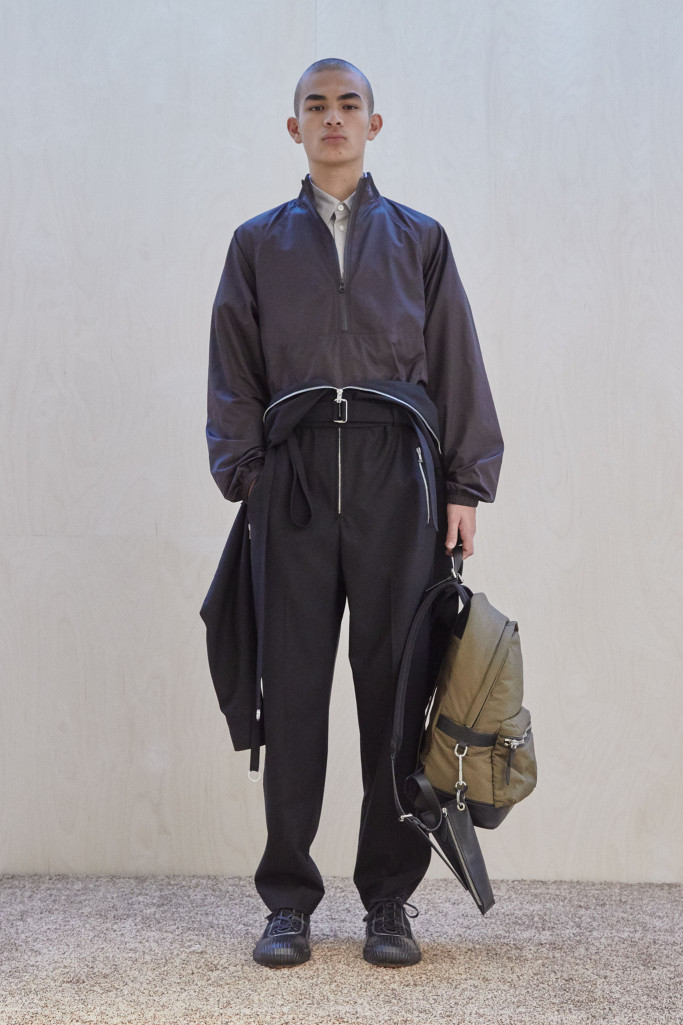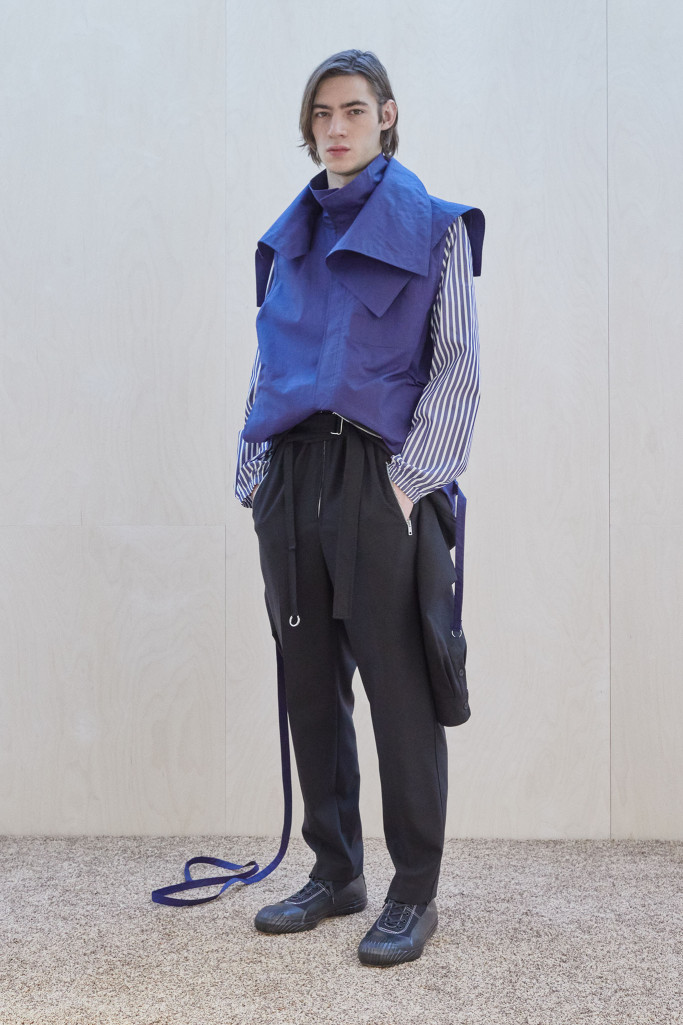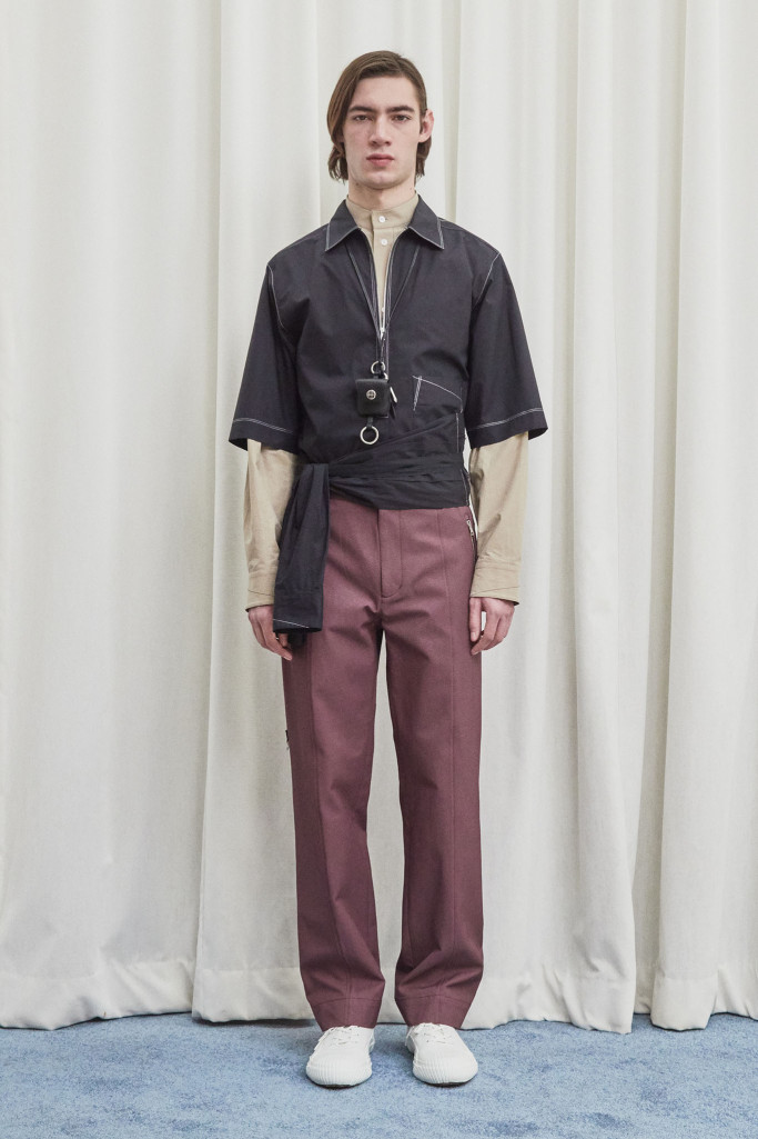 The collection also speaks to the realities of the busy lives of today’s men and includes workwear references and elevated streetwear. “This isn’t workwear, but it’s clothes you can work in,” said Lim, who added that he believes streetwear “should feel more romantic.” He achieved that with the foulard collars and belt pouches that created drama as well as a sense of discovery.