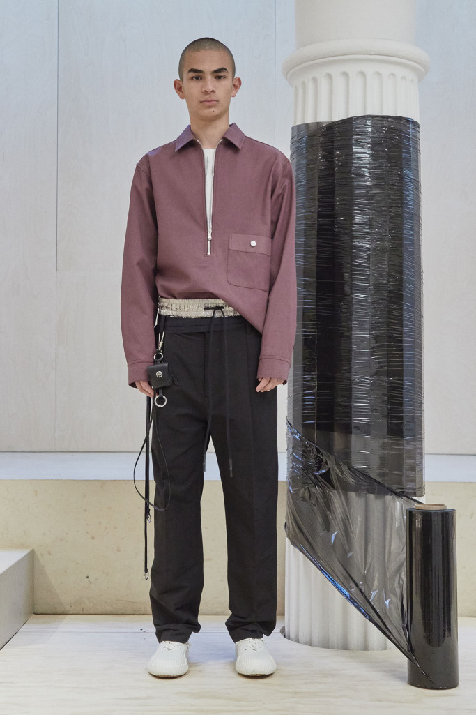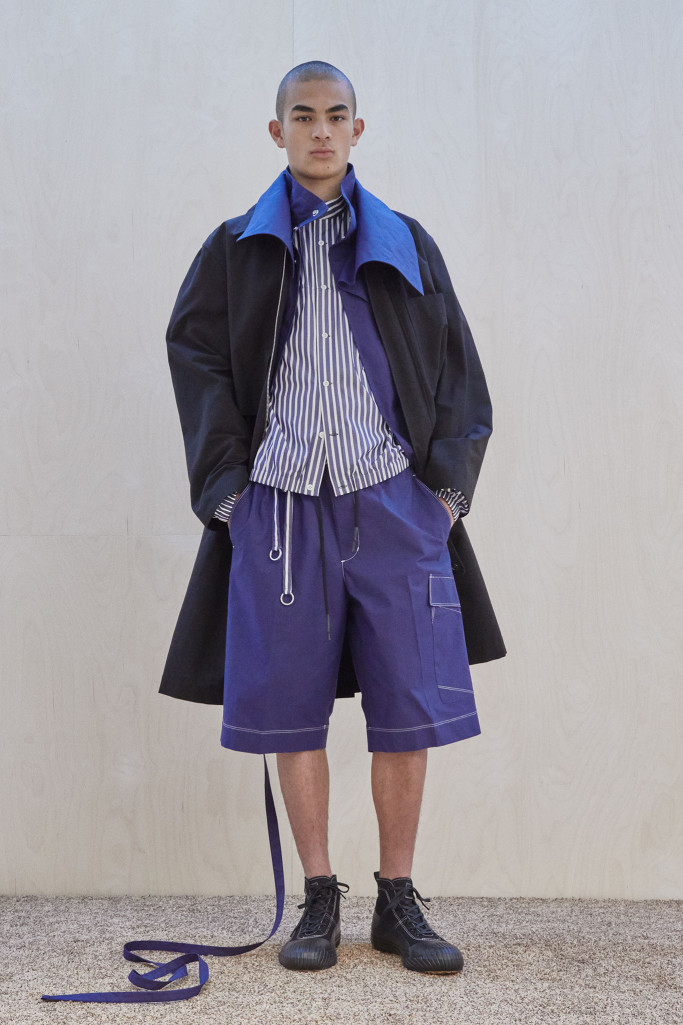 The collection also speaks to the realities of the busy lives of today’s men and includes workwear references and elevated streetwear. “This isn’t workwear, but it’s clothes you can work in,” said Lim, who added that he believes streetwear “should feel more romantic.” He achieved that with the foulard collars and belt pouches that created drama as well as a sense of discovery.