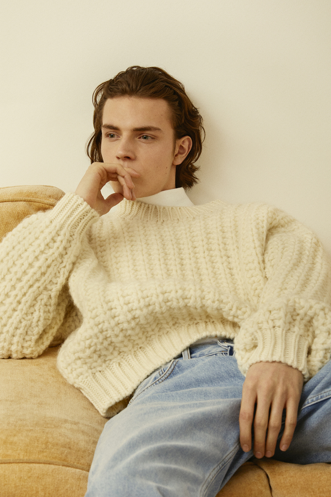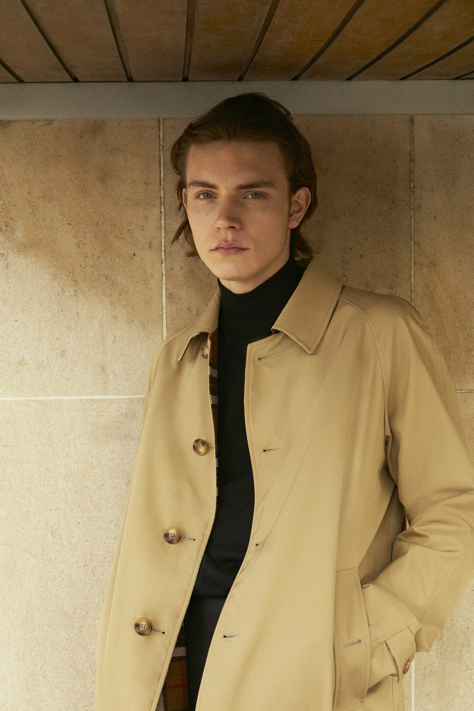 Collection notes referenced a working class flavor from Morrissey of The Smiths. Translated into Sandro’s universe, there was a houndstooth trenchcoat and black chunky-soled workwear-inspired shoes.