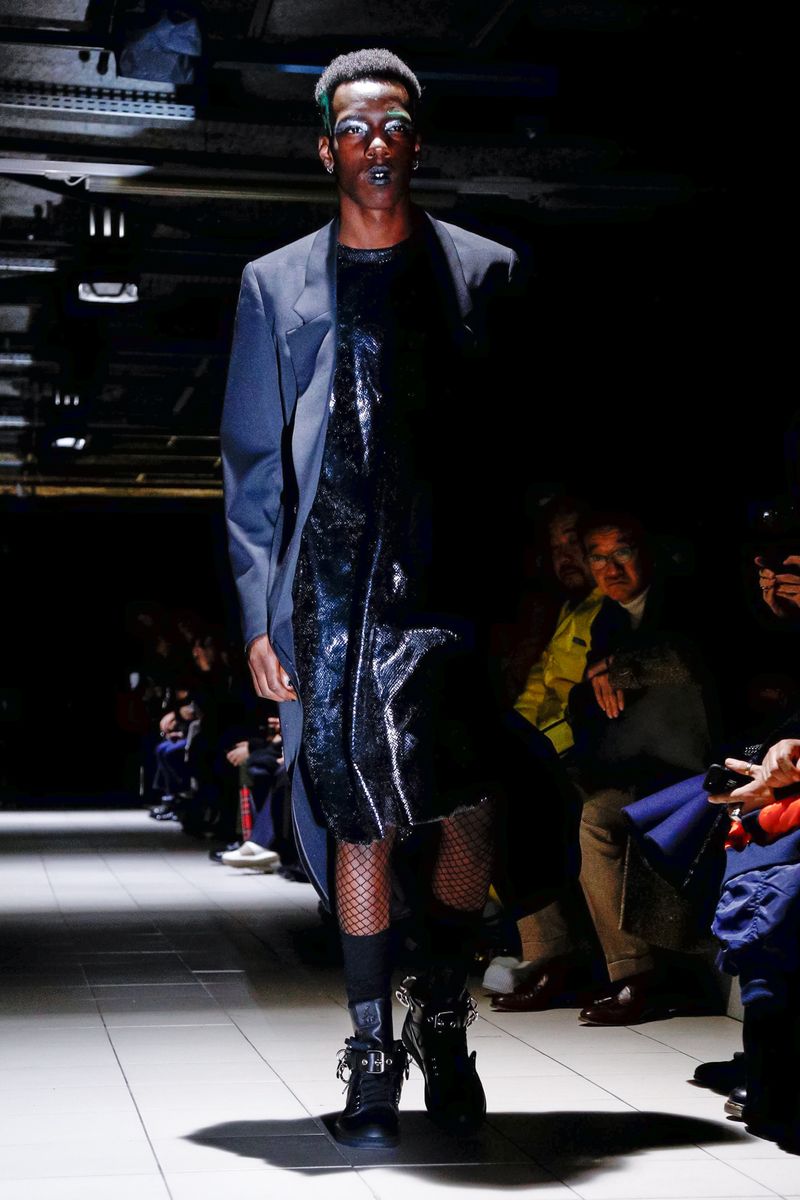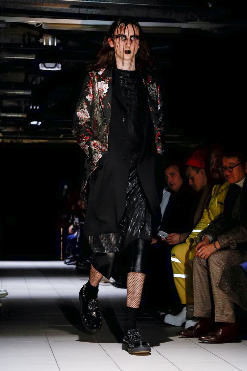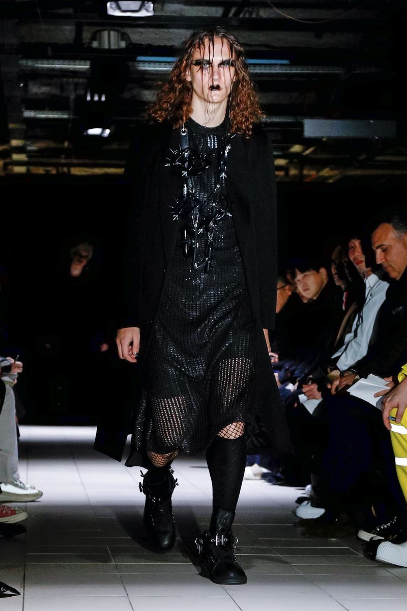 Kawakubo’s collection, which unfolded in a dark room that thumped with a live performance by the Los Angeles-based electronic duo Vowws, was mostly black. It offered up lots of the brand’s signature pieces, including dramatic white shirts and tailcoats, long and short. There were some nice dresses, too, columnar in shape, done in satin, lace, or with fringed edges.