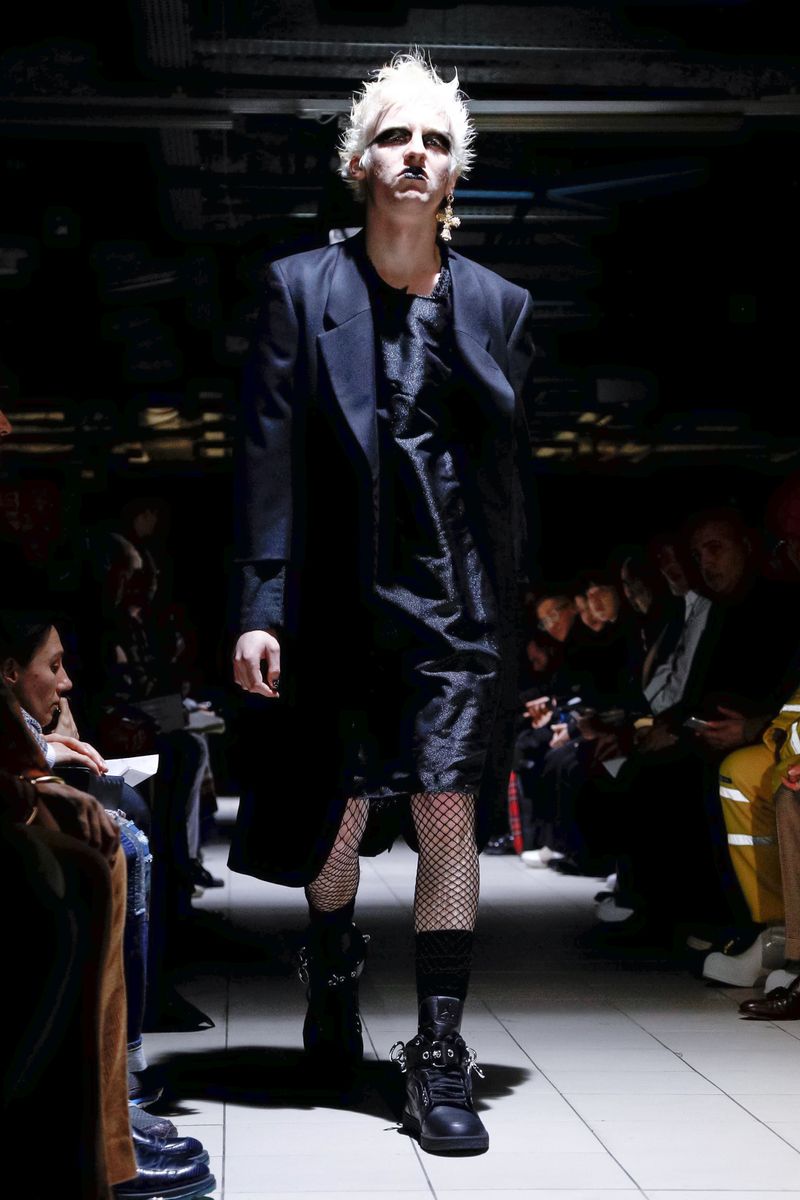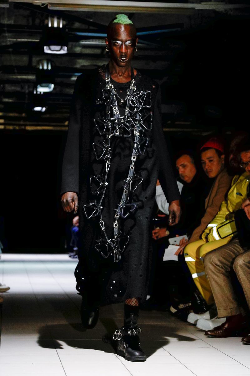 Rei Kawakubo clearly thought there was room for a few more dark rebels, sending out a goth punk collection complete with inky black lips and fingernails and models wearing jangling harnesses, grabbing their crotches and giving the finger to photographers like a bunch of petulant teenagers.