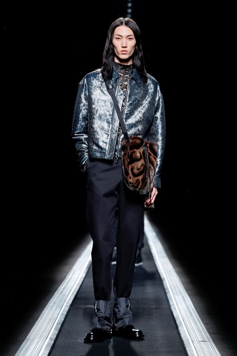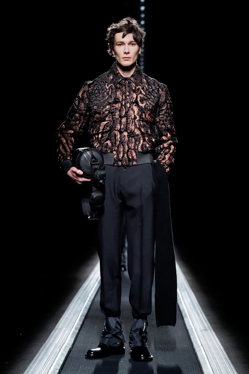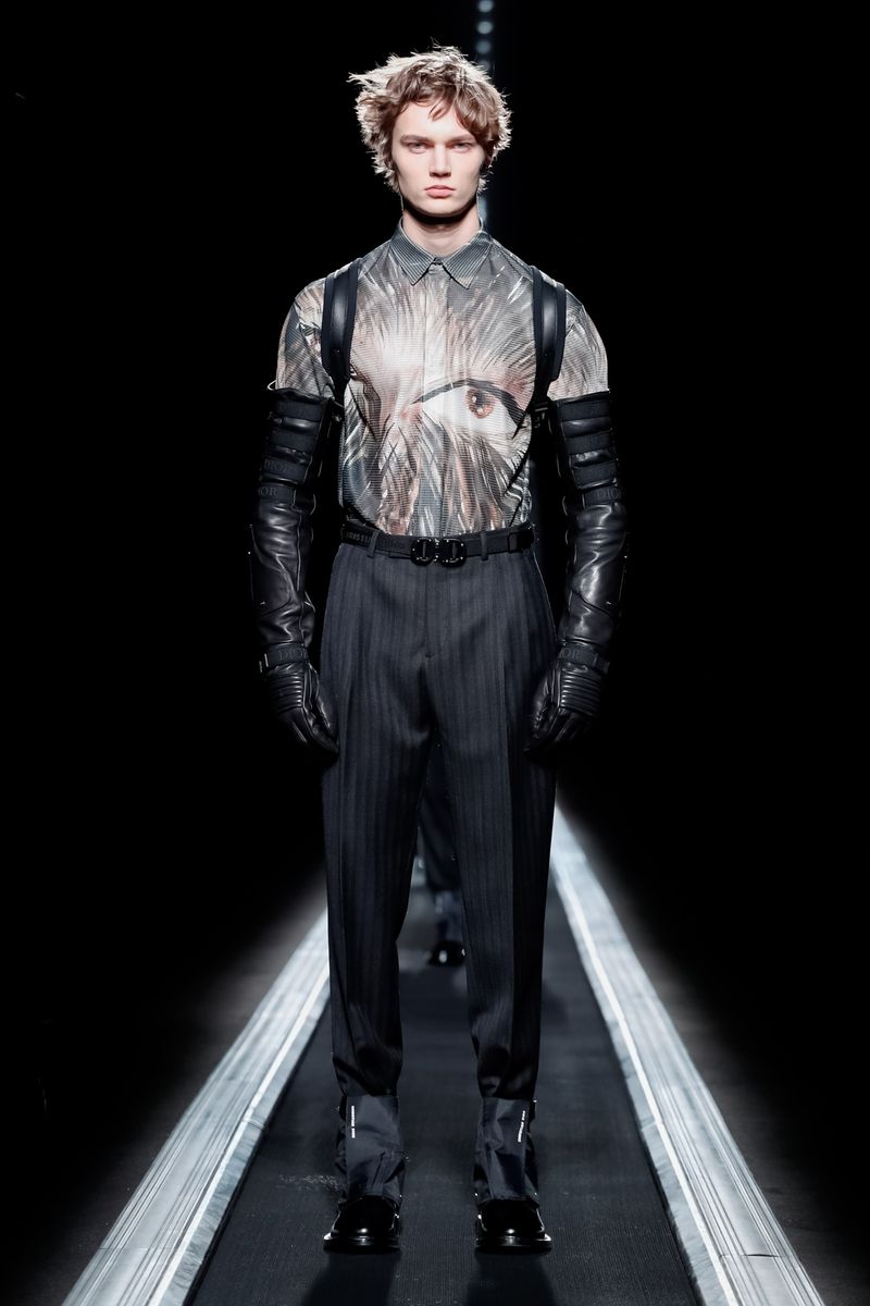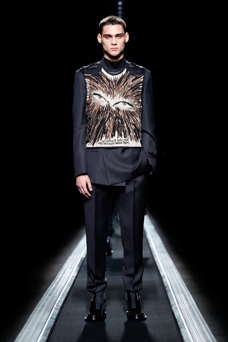 Jones is skilled at layering his references, and tethering them back to French culture. Take the sportswear structures of vests and utilitarian workwear that appeared throughout. The heavily-beaded vest with what looked like a cat’s face—what Jones called a “tactical jacket”—turned out not to have been inspired by the Gilets Jaunes, or footage of police countering them. Actually, he’d been looking at the statues to French heroes and statesmen in parks and buildings around Paris. “I noticed how many of them are wearing armor.”