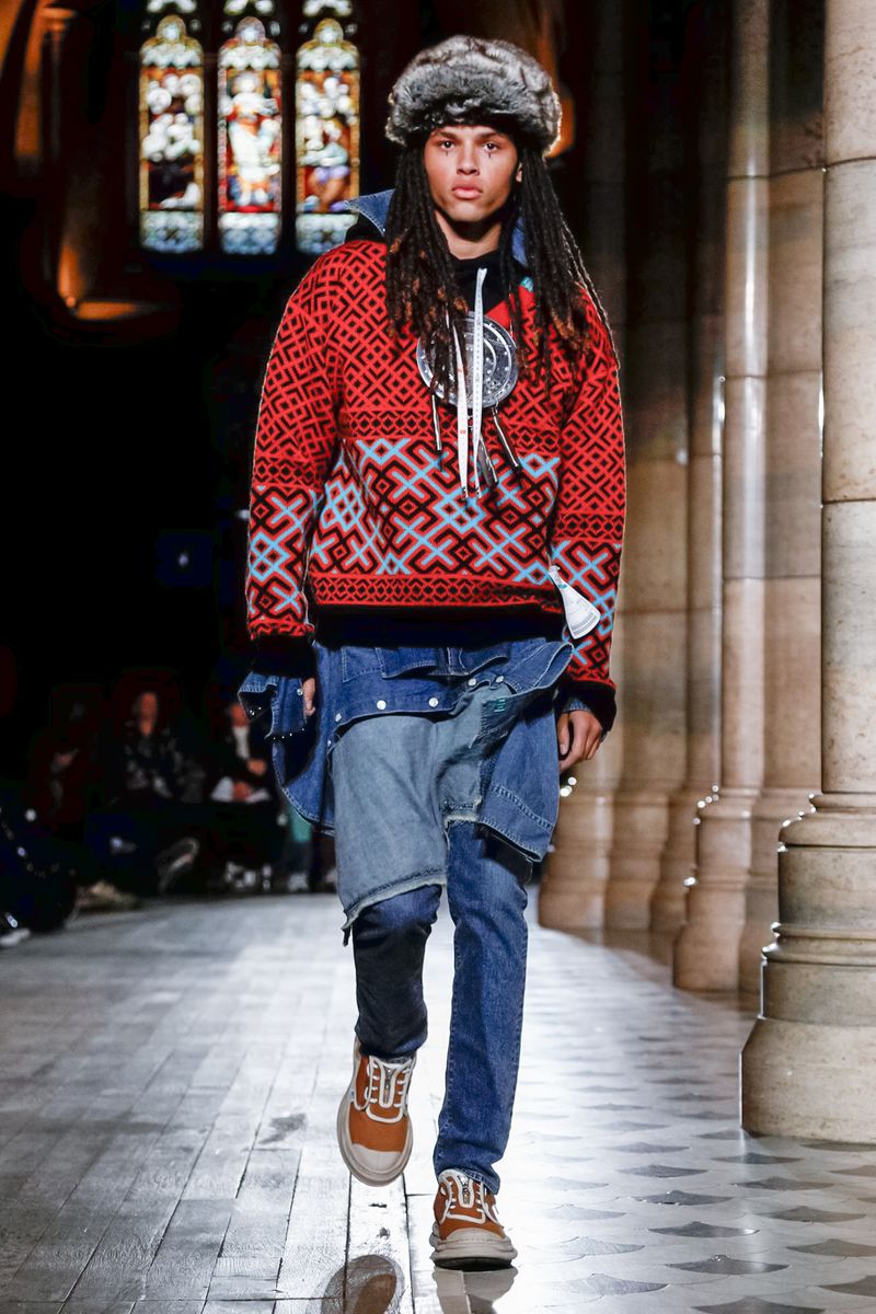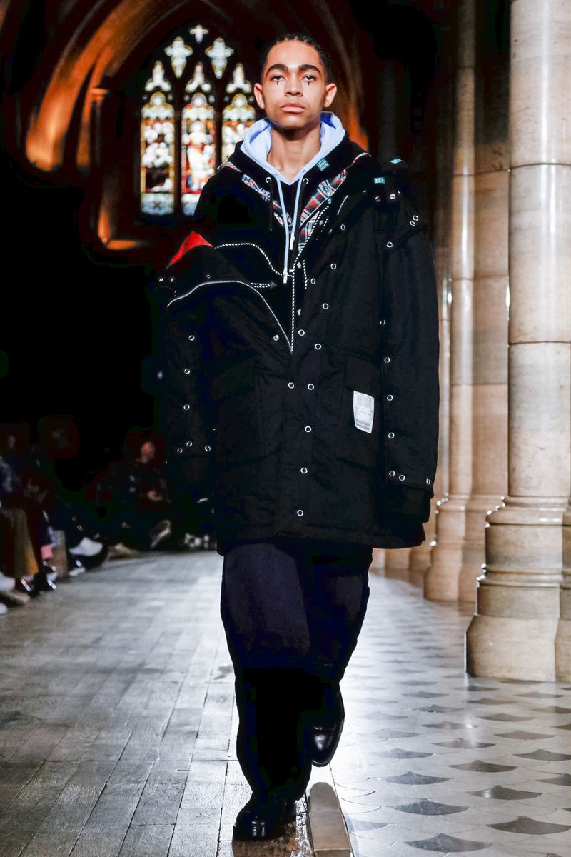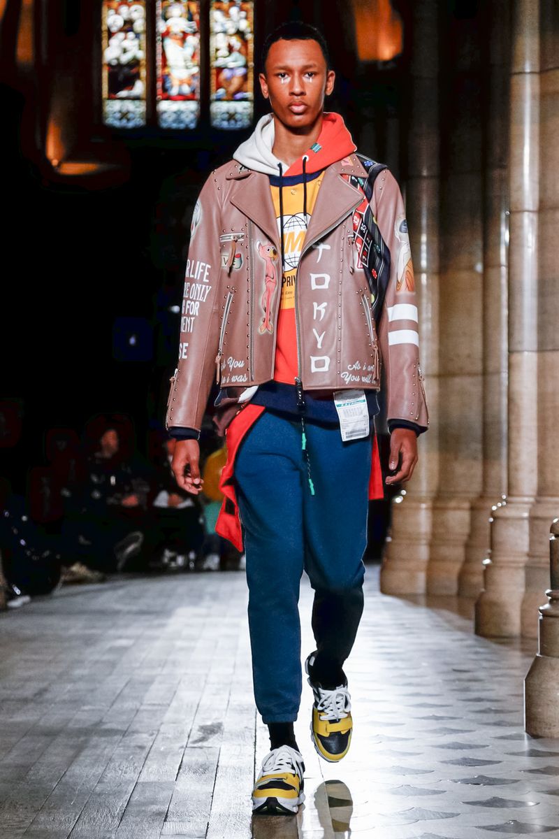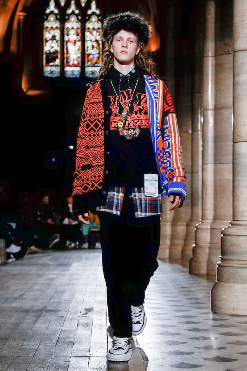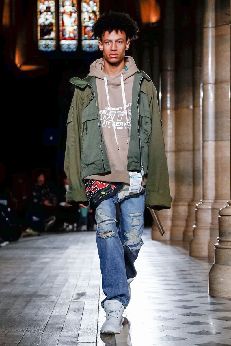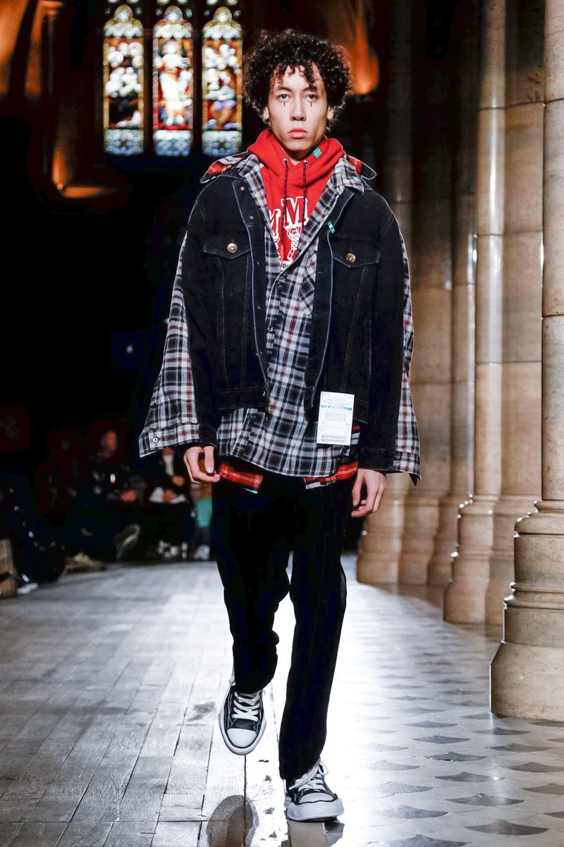 Today in Paris, denim, leather, patchwork shirts and knitwear with a streetwear aesthetic at Maison Mihara Yasuhiro Fall/Winter 2019 Paris new menswear show.