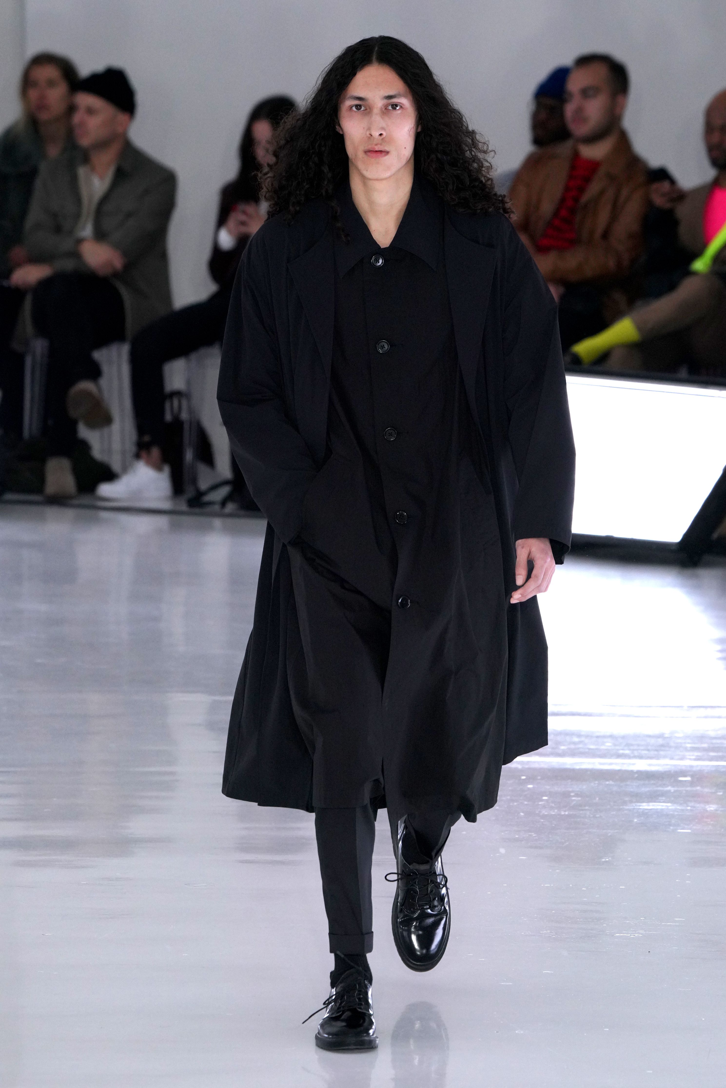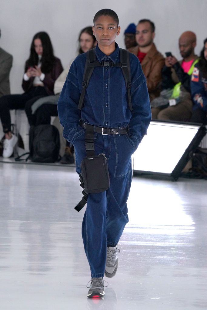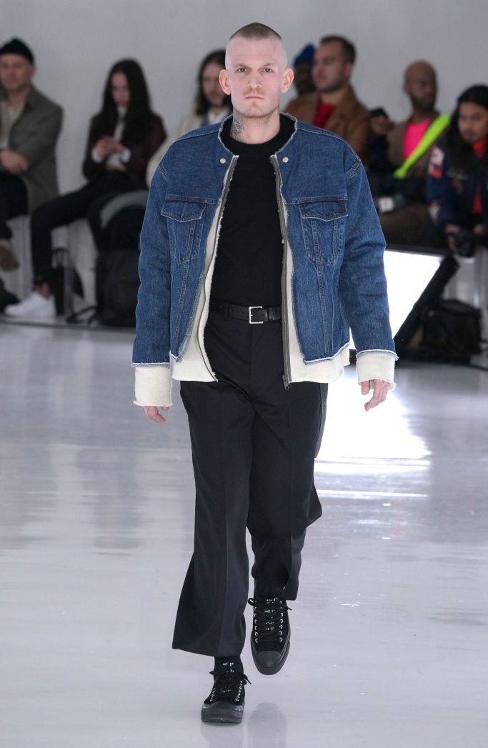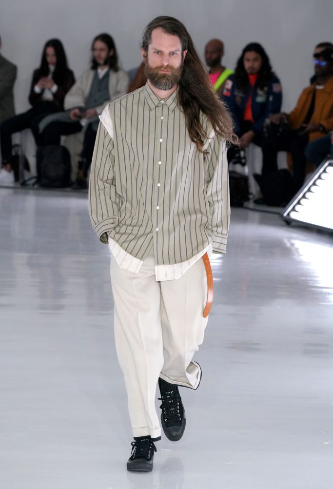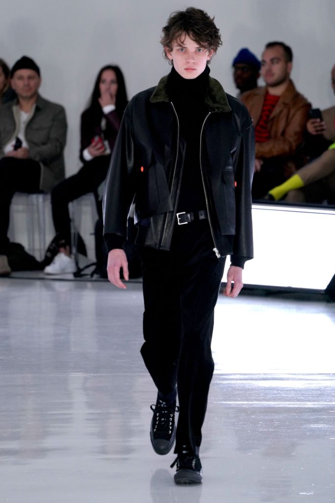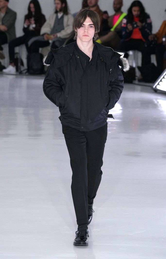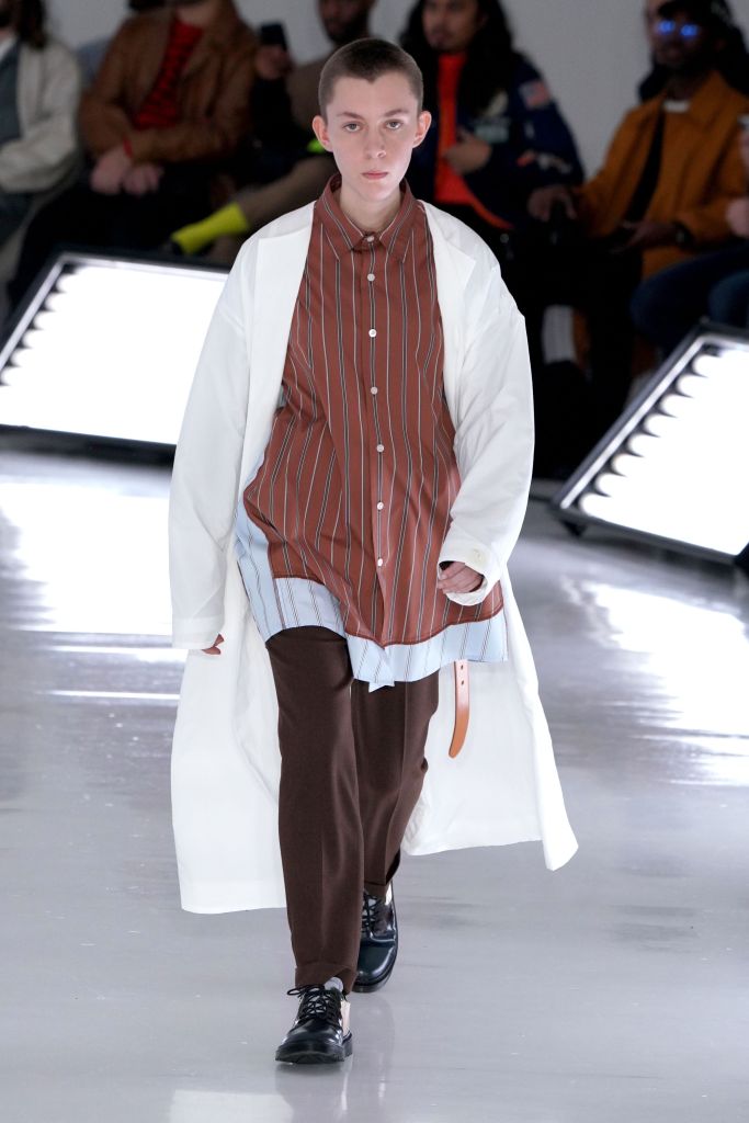 An all-white room with bright white fluorescent lighting panels along the floor, and clear acrylic chairs set the tone for the fall collection. With what seemed almost like a palate-cleanser, Obana this season offered an intimate peek at conquering his dislikes. Working in patterns such as checks and camouflage that have frustrated him in the past, Obana seemed to have finally conquered his demons with this solid effort. His clever deconstruction also continued with the use of hidden details such as soft leather jackets, which were in fact two-in-one detachable models.