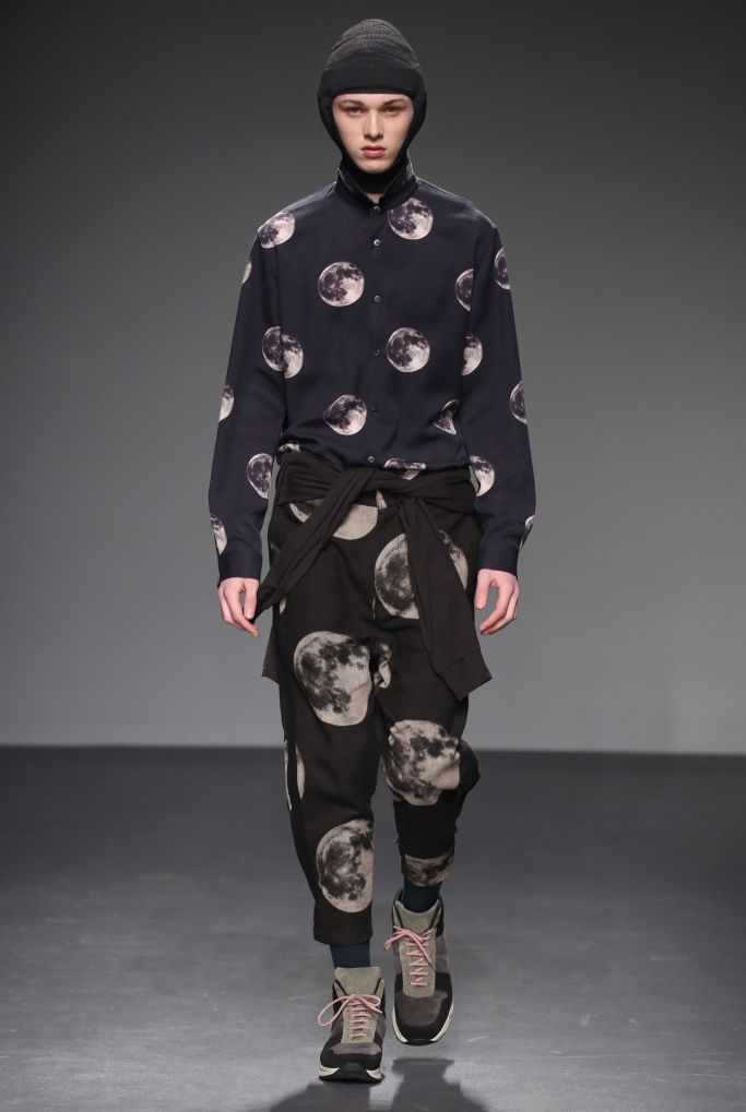 And a ubiquitous moon-pattern print that he used in coats, silky shirts, scarves and leggings was part of his fictitious mountainous climb to the moon.