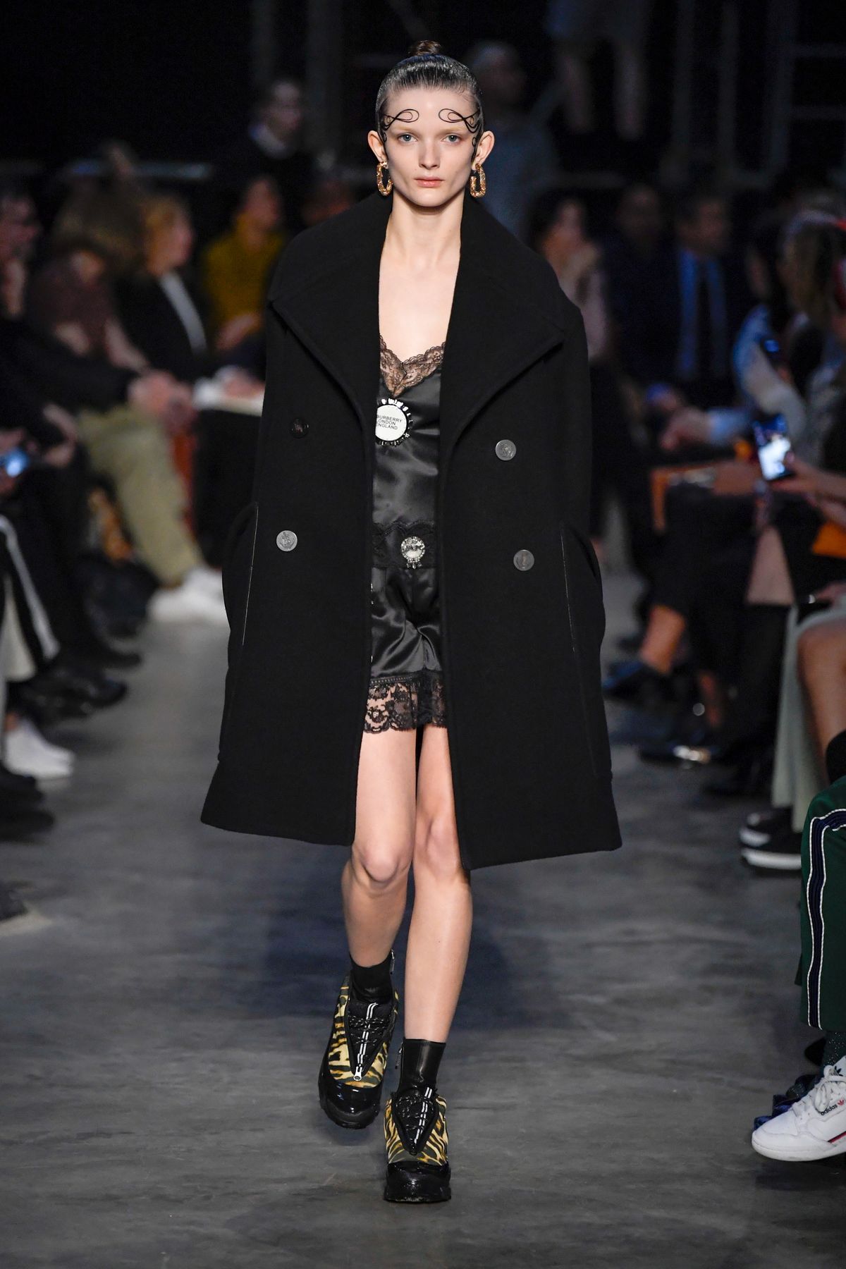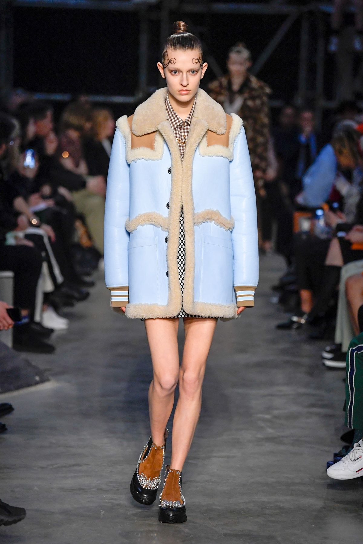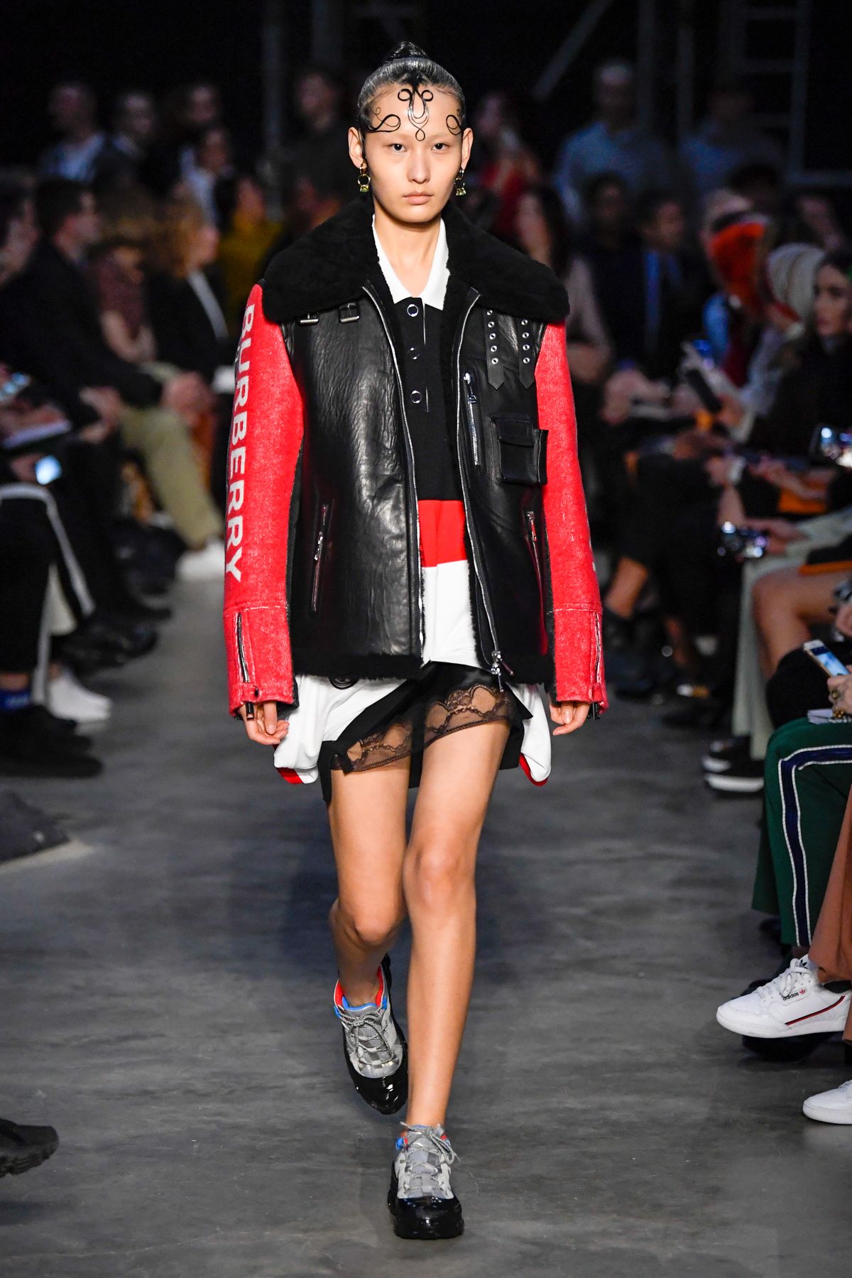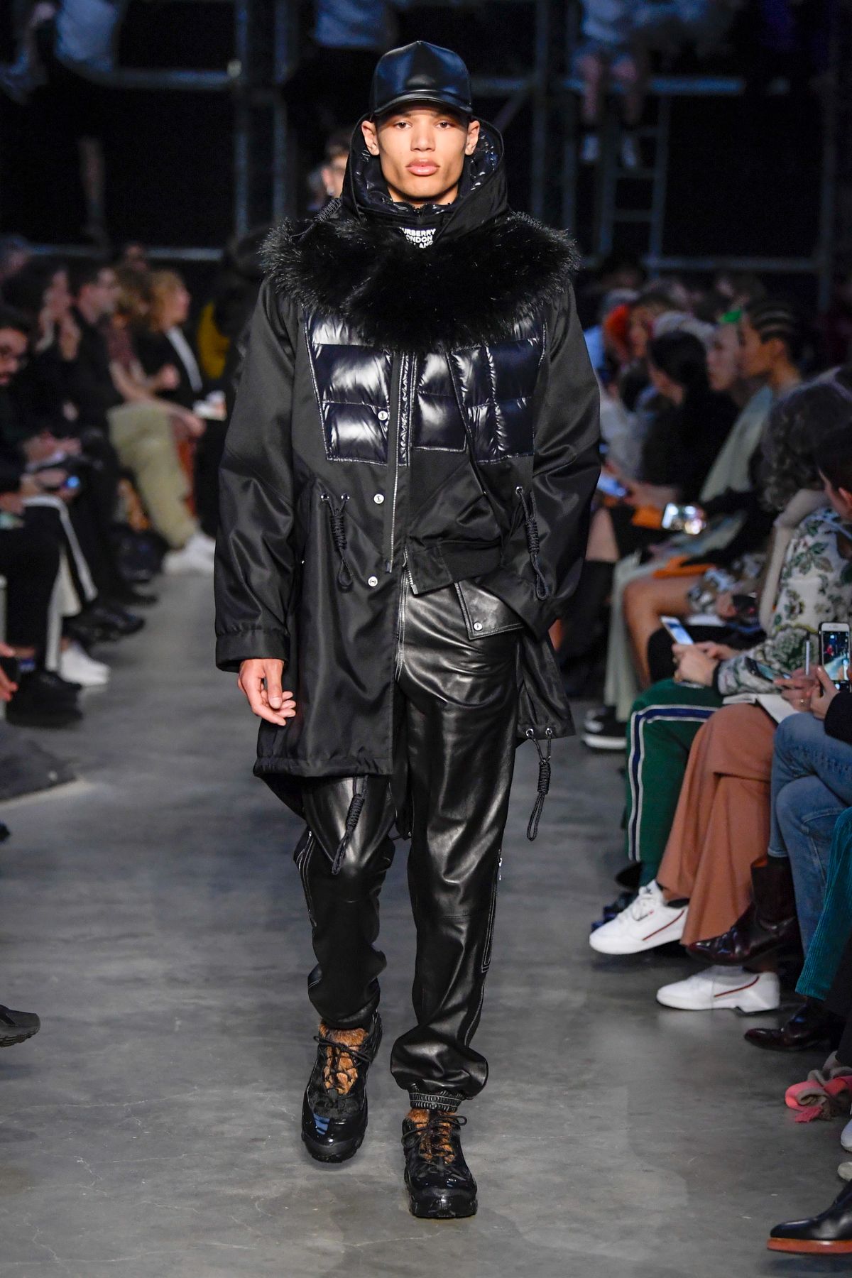 Tisci took a step forward for fall, tightening up the show, clarifying his vision and making a return to that classy streetwear for which he’s known. His lineup featured tailored coats with puffers tacked to the back or with big faux furry hoods bursting from the collars. He tore apart rugby shirts and stitched them into a dress, punk-ed up leather baseball jackets with little phrases like “Burberry isn’t good for you” down the woolen sleeve, and gave a shearling a tough edge with slicks of black patent leather.