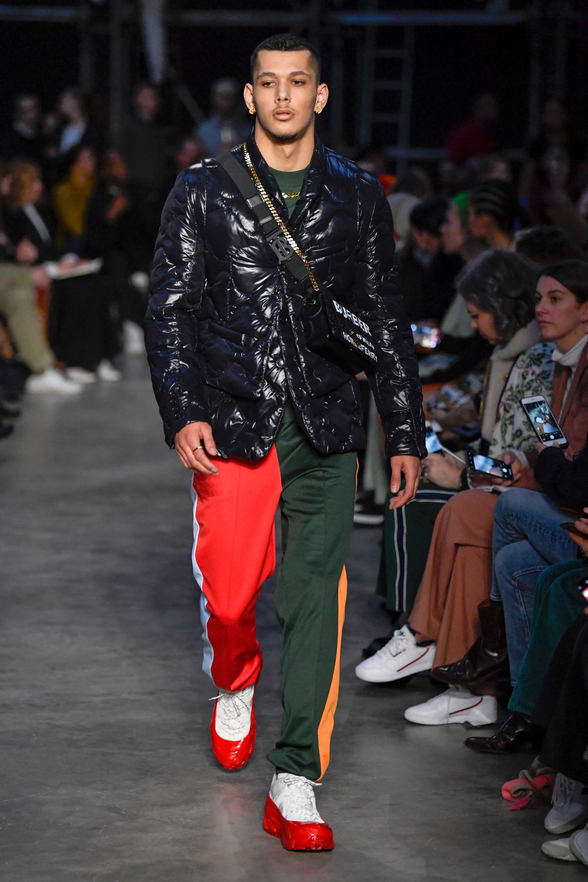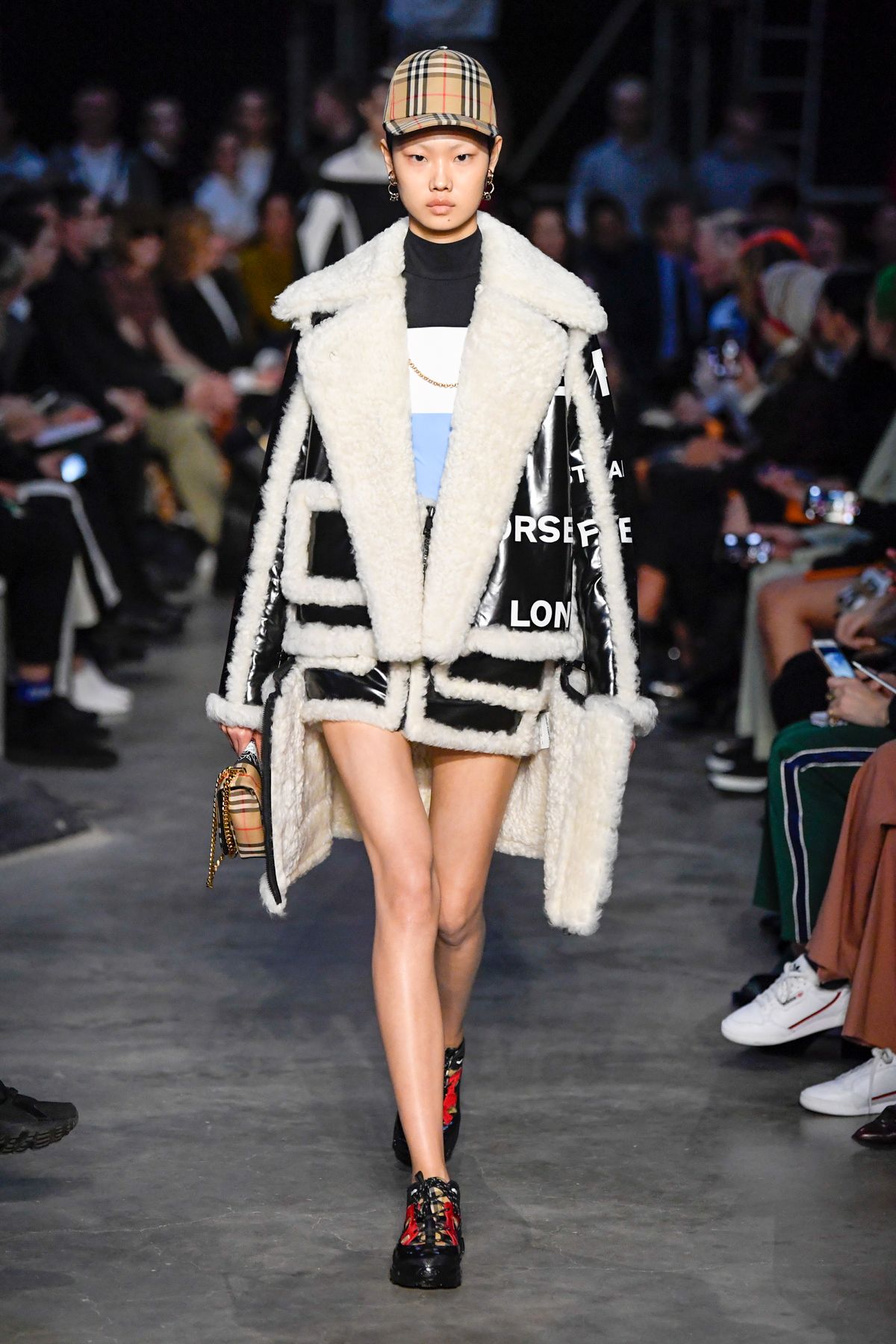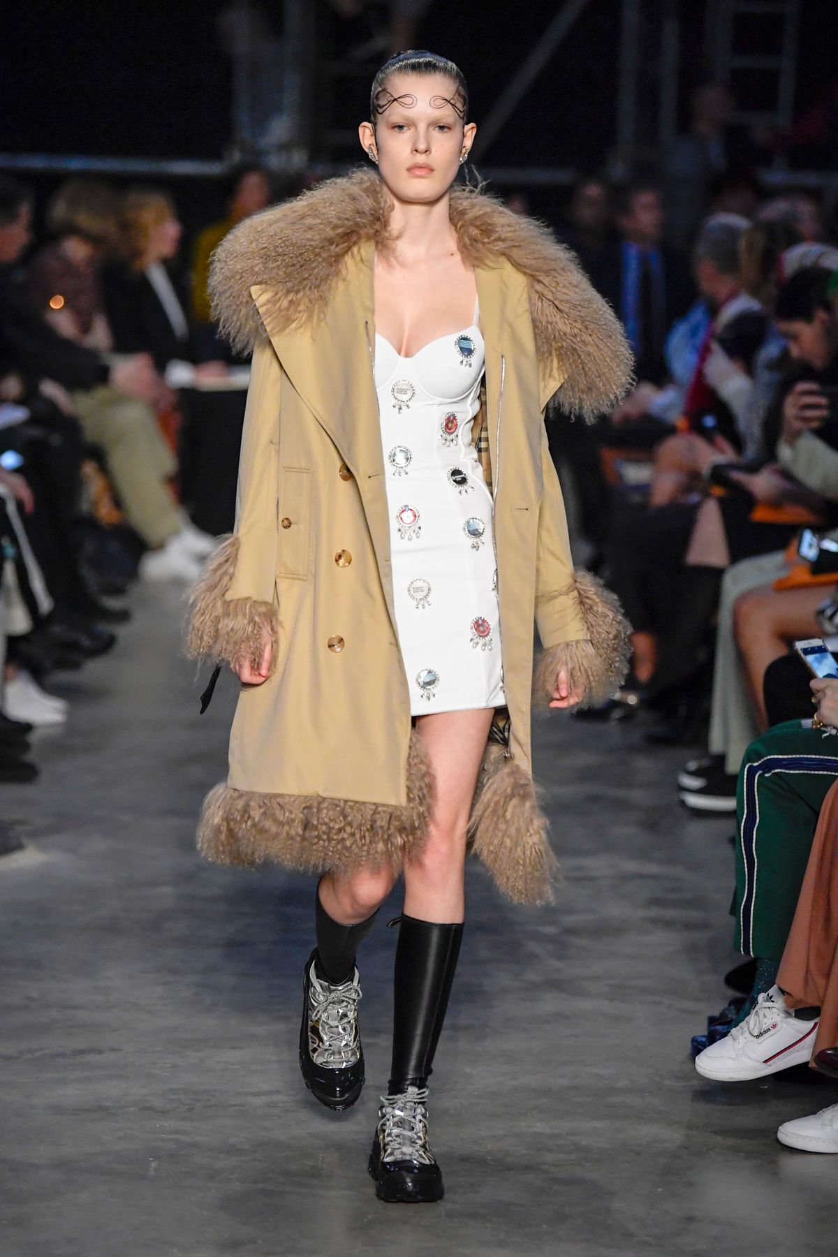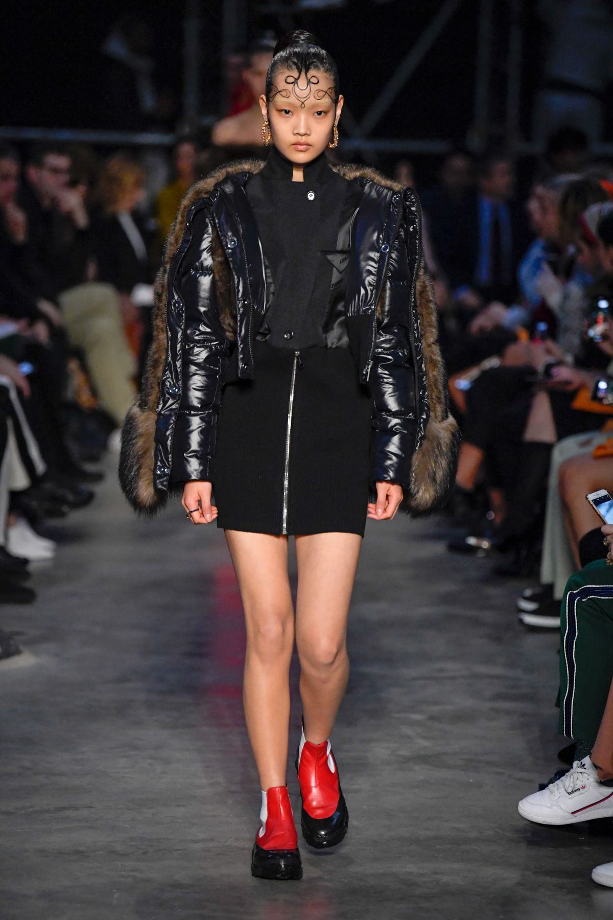 Tisci took a step forward for fall, tightening up the show, clarifying his vision and making a return to that classy streetwear for which he’s known. His lineup featured tailored coats with puffers tacked to the back or with big faux furry hoods bursting from the collars. He tore apart rugby shirts and stitched them into a dress, punk-ed up leather baseball jackets with little phrases like “Burberry isn’t good for you” down the woolen sleeve, and gave a shearling a tough edge with slicks of black patent leather.