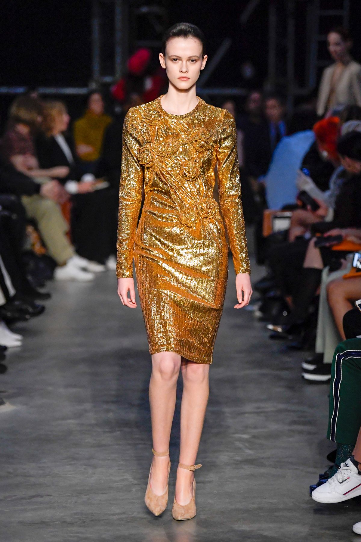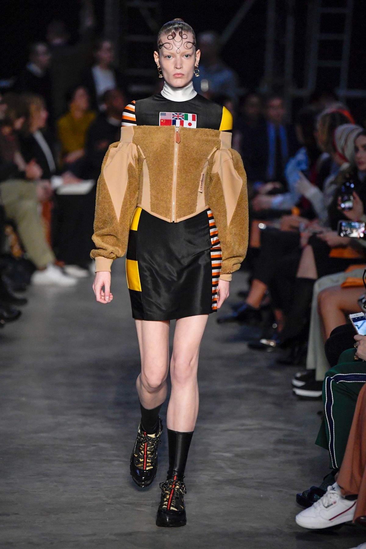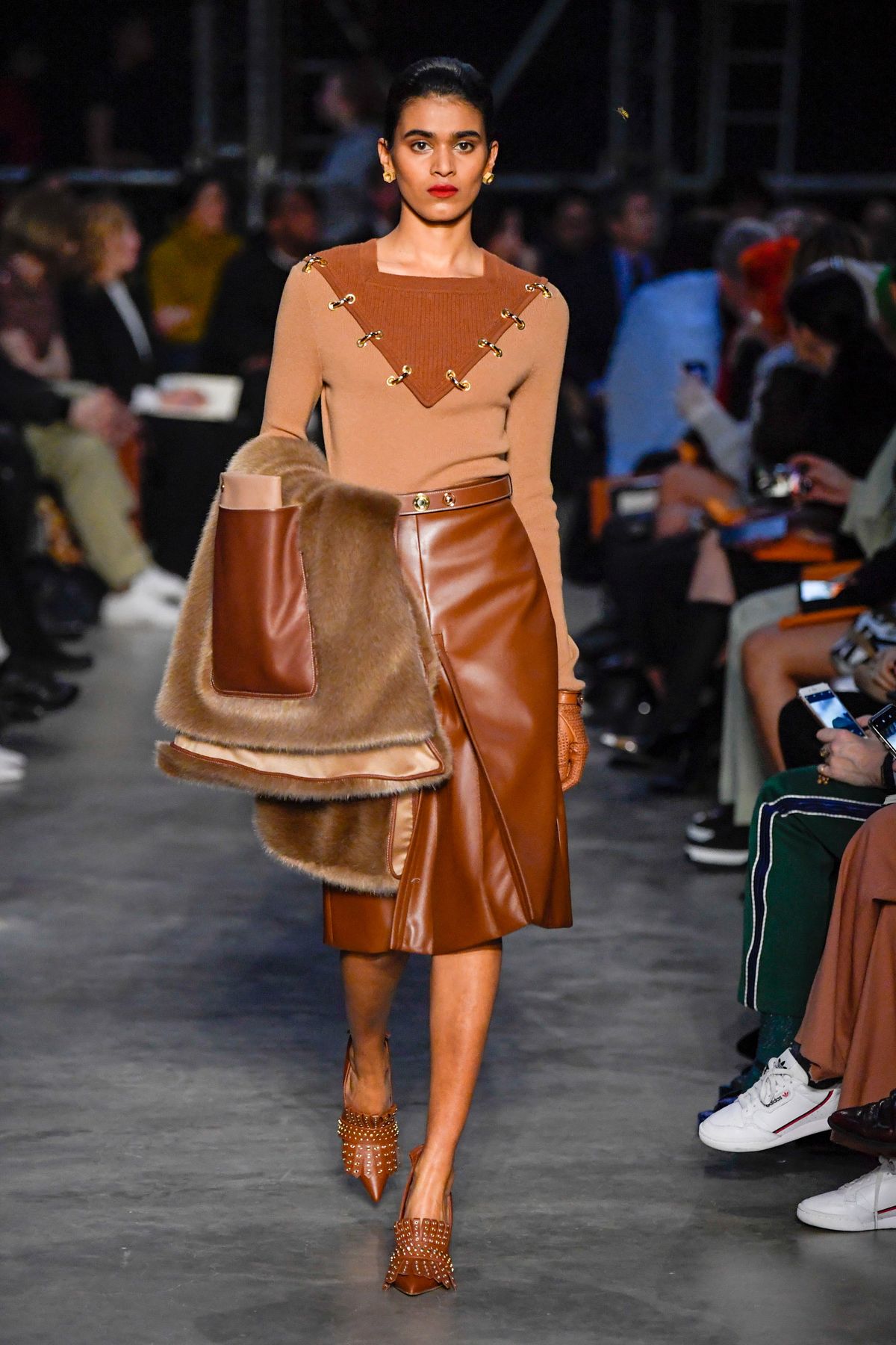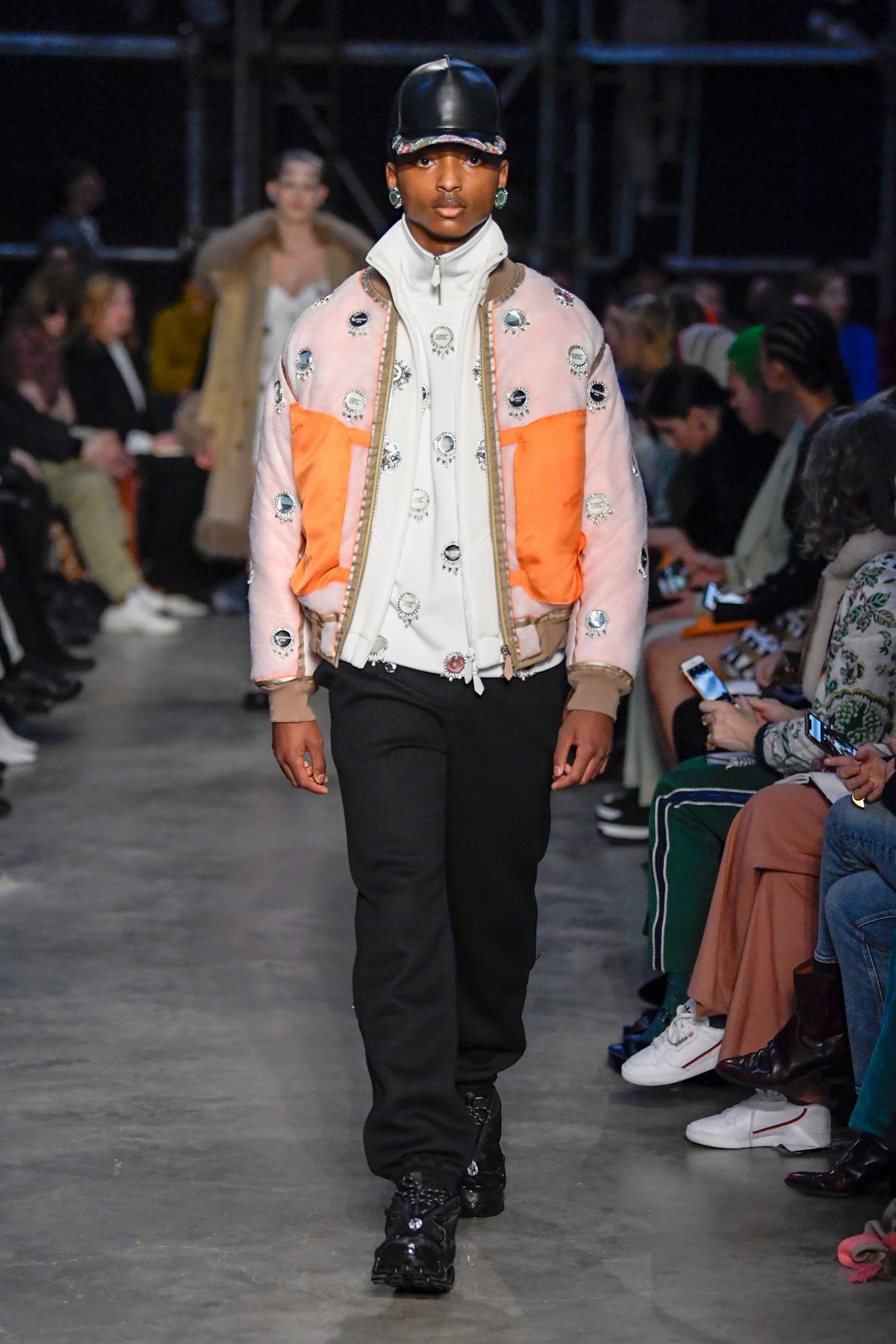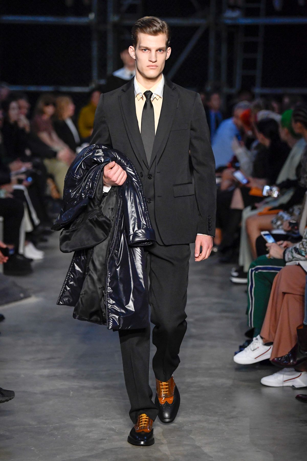 Tisci took a step forward for fall, tightening up the show, clarifying his vision and making a return to that classy streetwear for which he’s known. His lineup featured tailored coats with puffers tacked to the back or with big faux furry hoods bursting from the collars. He tore apart rugby shirts and stitched them into a dress, punk-ed up leather baseball jackets with little phrases like “Burberry isn’t good for you” down the woolen sleeve, and gave a shearling a tough edge with slicks of black patent leather.