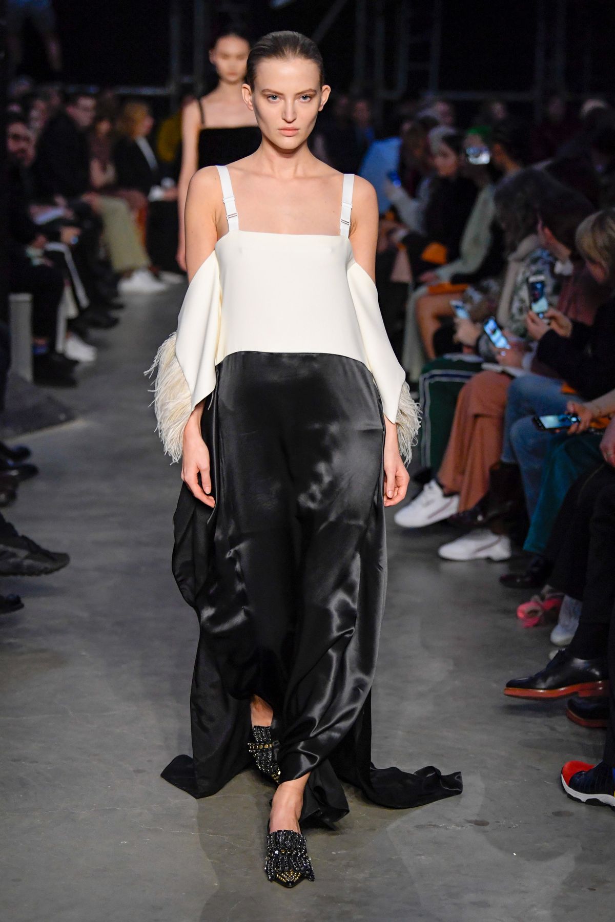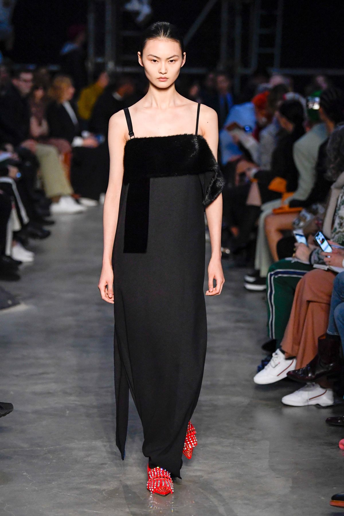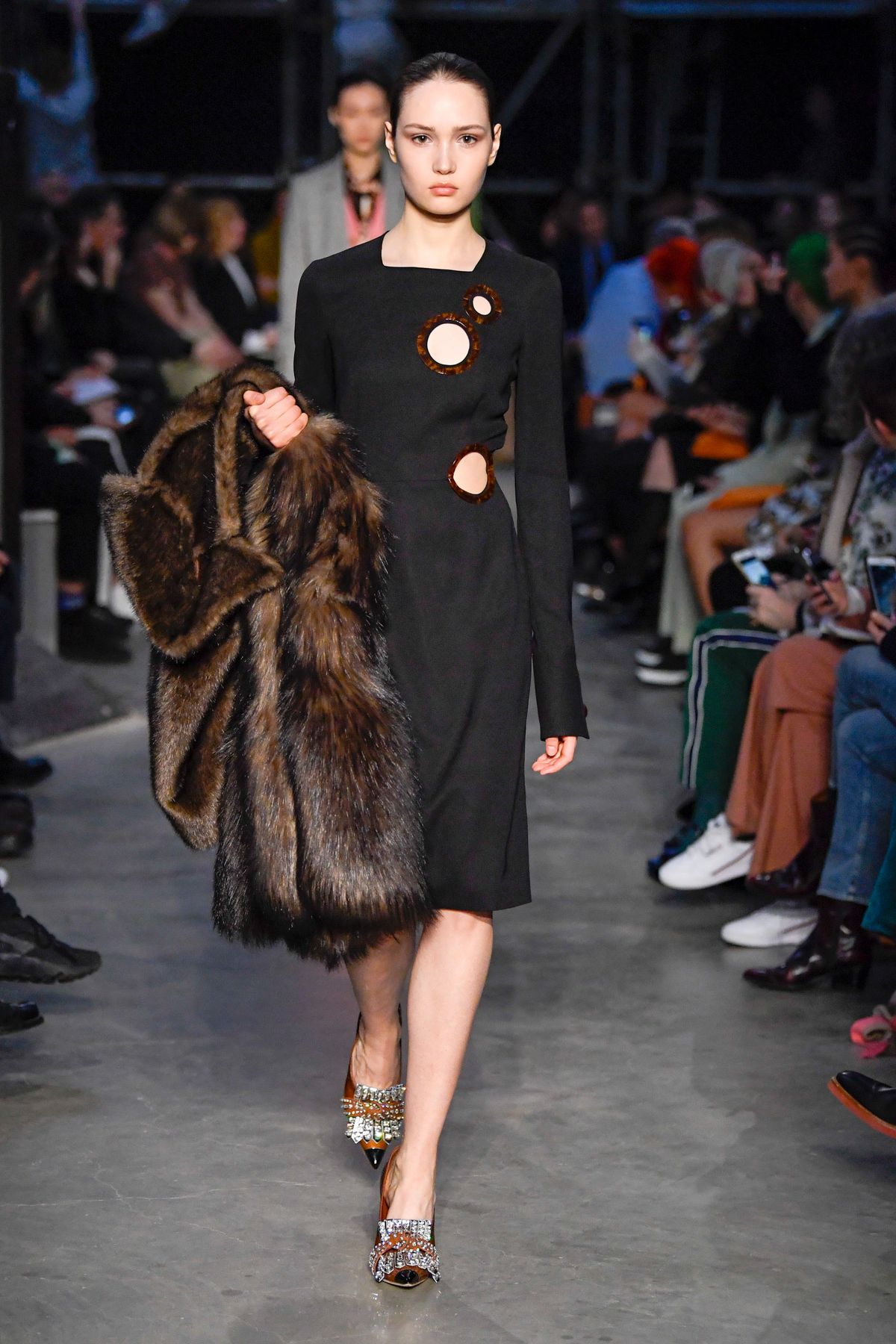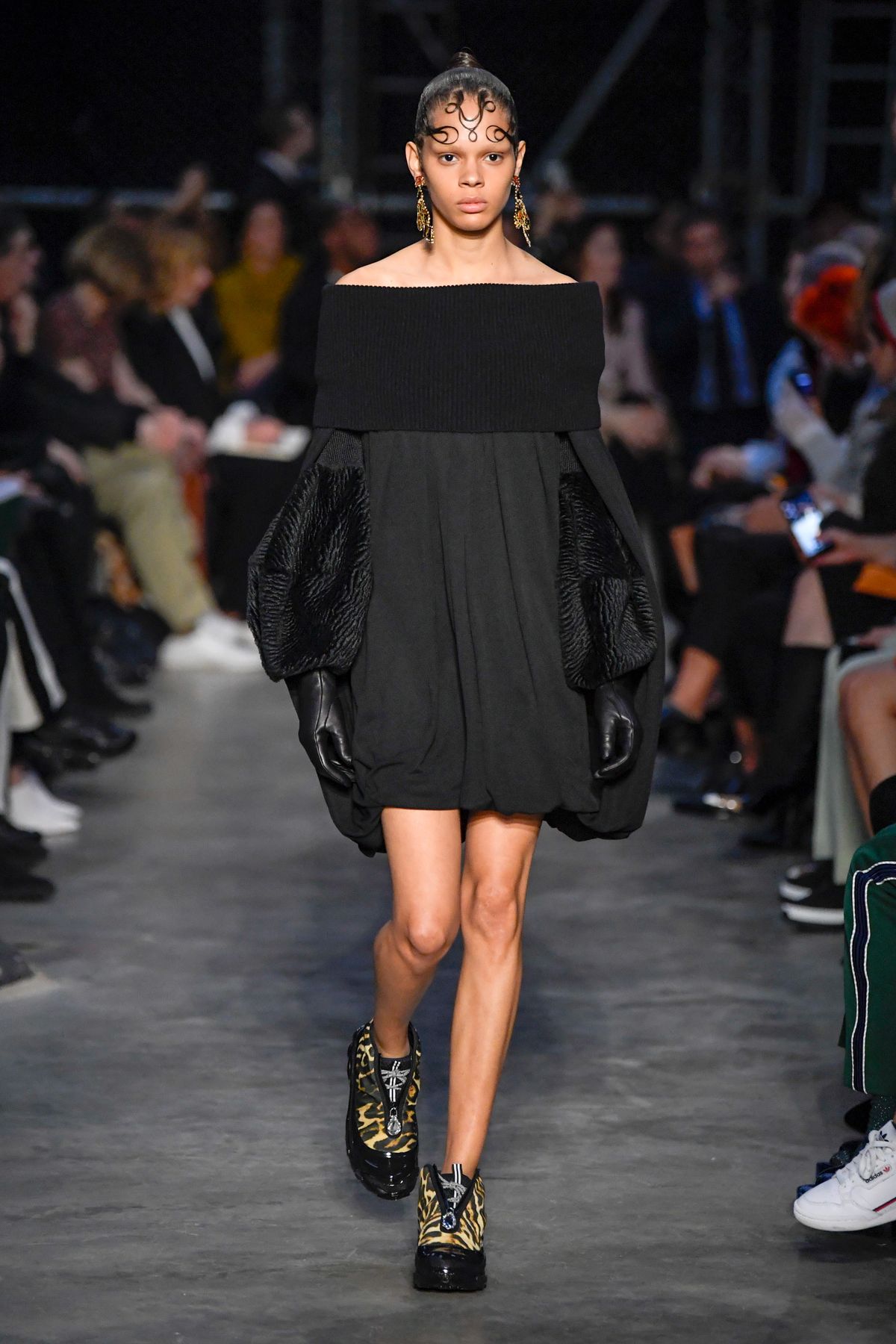 Tisci took a step forward for fall, tightening up the show, clarifying his vision and making a return to that classy streetwear for which he’s known. His lineup featured tailored coats with puffers tacked to the back or with big faux furry hoods bursting from the collars. He tore apart rugby shirts and stitched them into a dress, punk-ed up leather baseball jackets with little phrases like “Burberry isn’t good for you” down the woolen sleeve, and gave a shearling a tough edge with slicks of black patent leather.