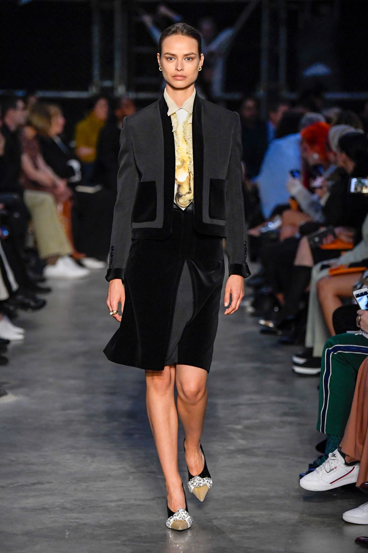 Tisci said he’s always conscious that he’s talking to “two different types of public, price-wise as well as need-wise. A mature person has a different need than someone from a young generation.” That explains why the other half of the collection was aimed at the international sophisticate, with lots of tailoring for men and women, including a snappy wool peacoat skirt suit and a sculptural pea green coat with a Sixties feel. There were trenchcoats with branded blankets and scarves draped across the back and skirts galore in leather, or with silk pleats and sequins.