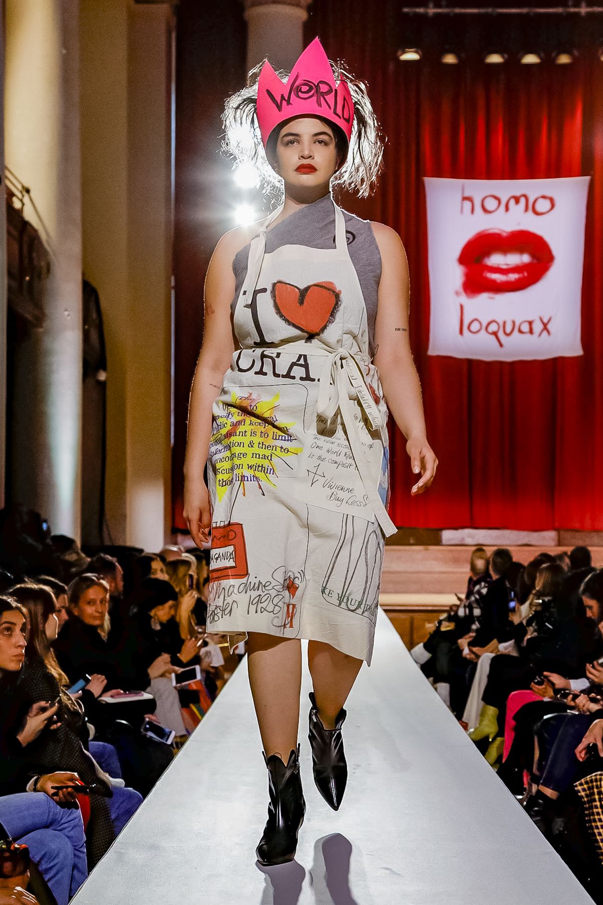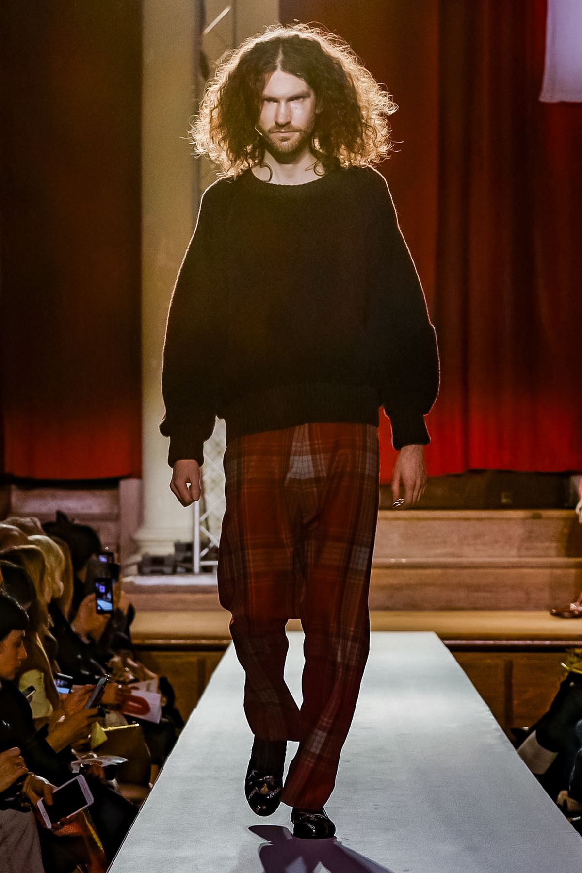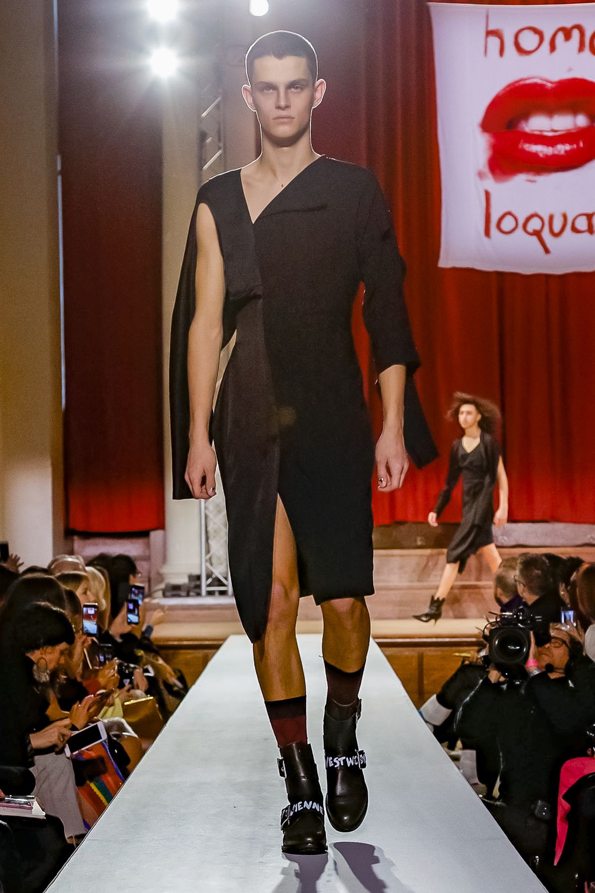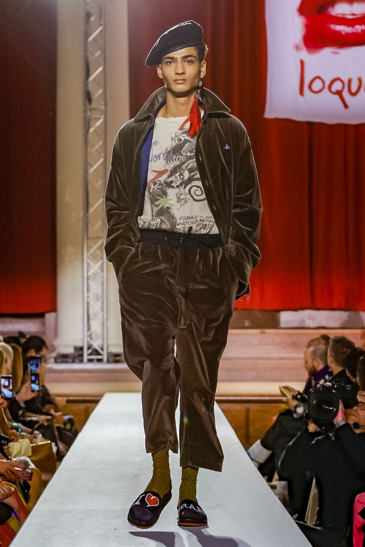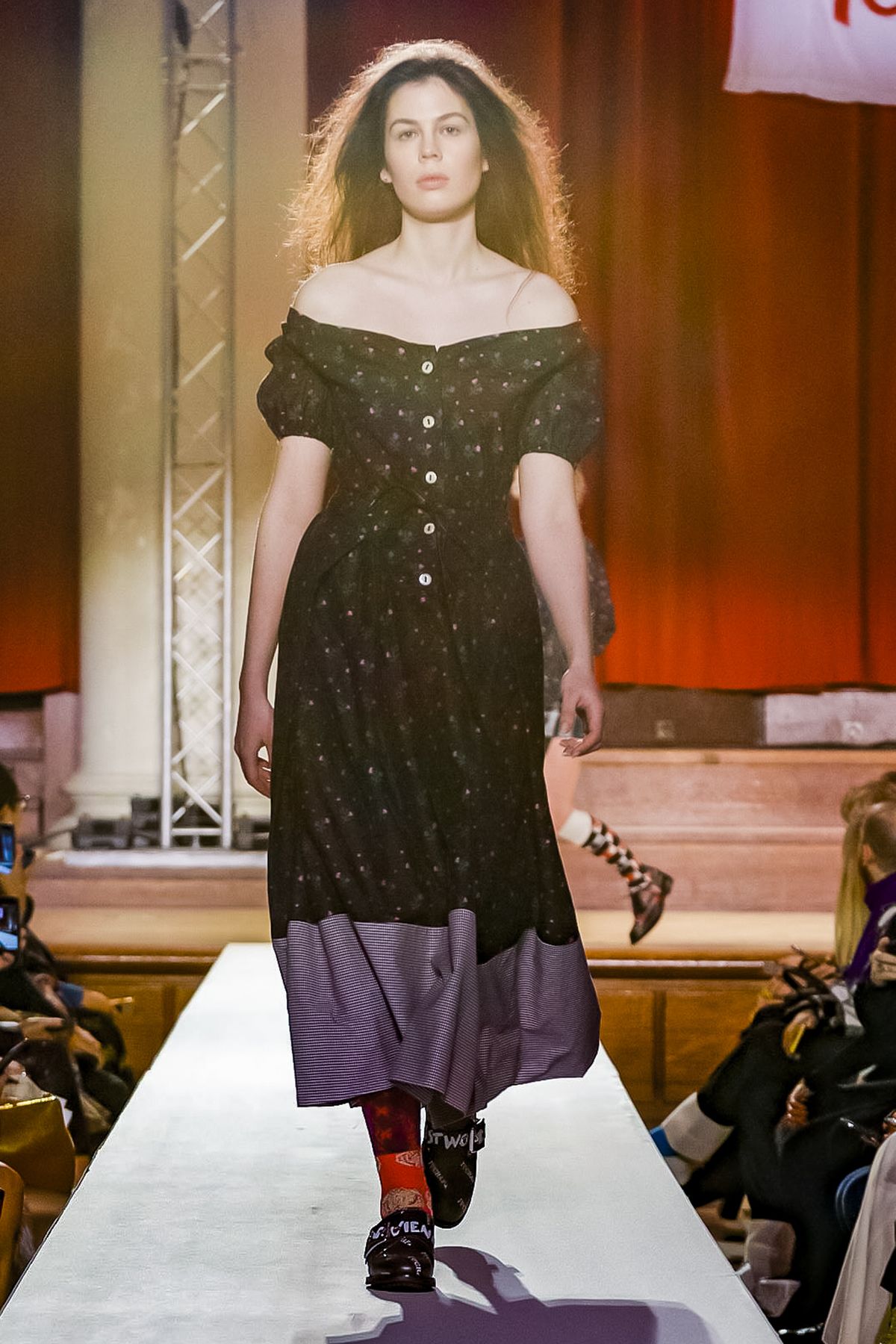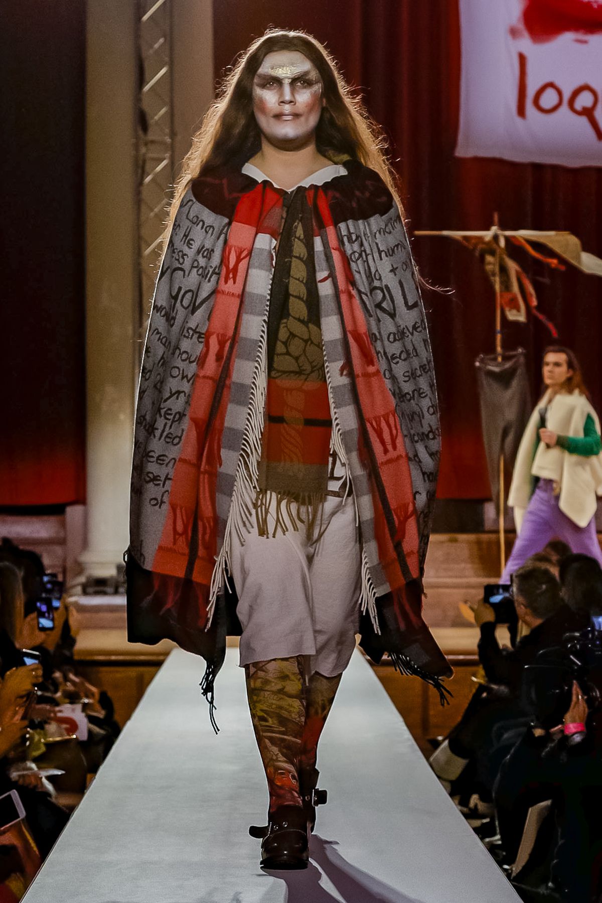 “I bought this coat last year, it’s called the Prince Coat; it’s a classic,” announced model and activist Hugo Hamlet, proudly gesturing to his oversized checked topper which, in truth, was from the fall 2018 collection, one of Westwood’s favorite styles; she repeats it every season. Fair enough; it’s a nice coat.