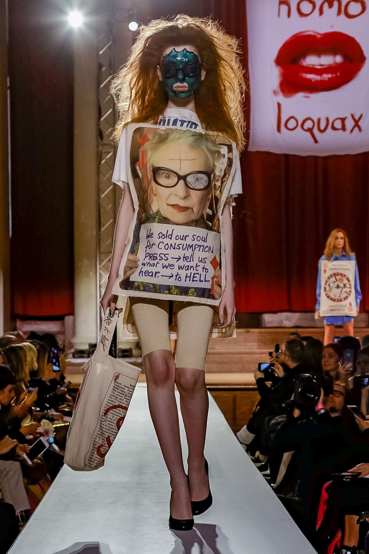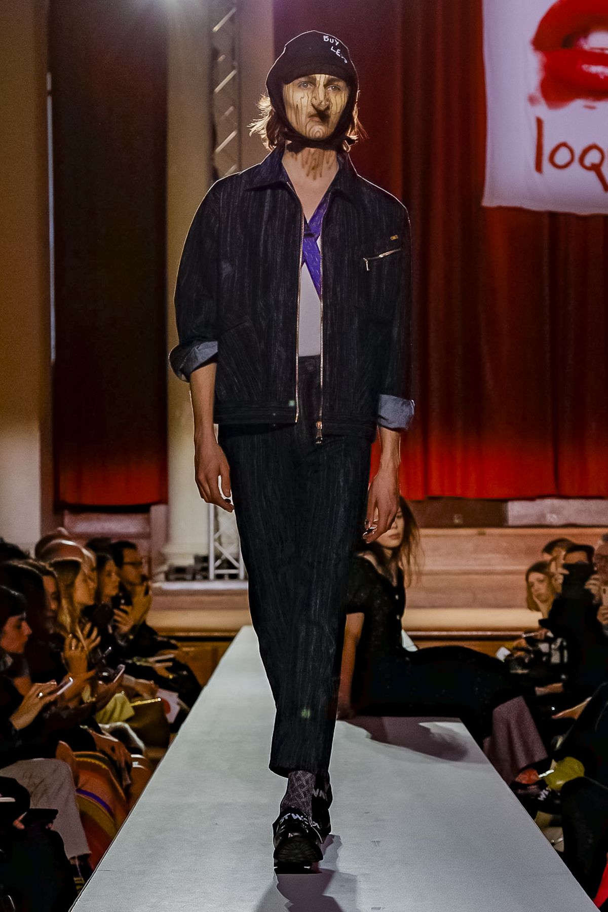 In a number of sombre tableaux that punctuated the show, the assembled cast of activists including Rose McGowan, Camilla Rutherford and Sara Stockbridge spoke about a number of issues, including inequitable taxation, democracy, consumption (it’s “the enemy of culture”), ignorance and truth, with Pinocchio (personified by a model, complete with prominent beak) held up as a cautionary tale. Top of them all: climate change, with the overarching missive to “Buy less, choose well, make it last.”