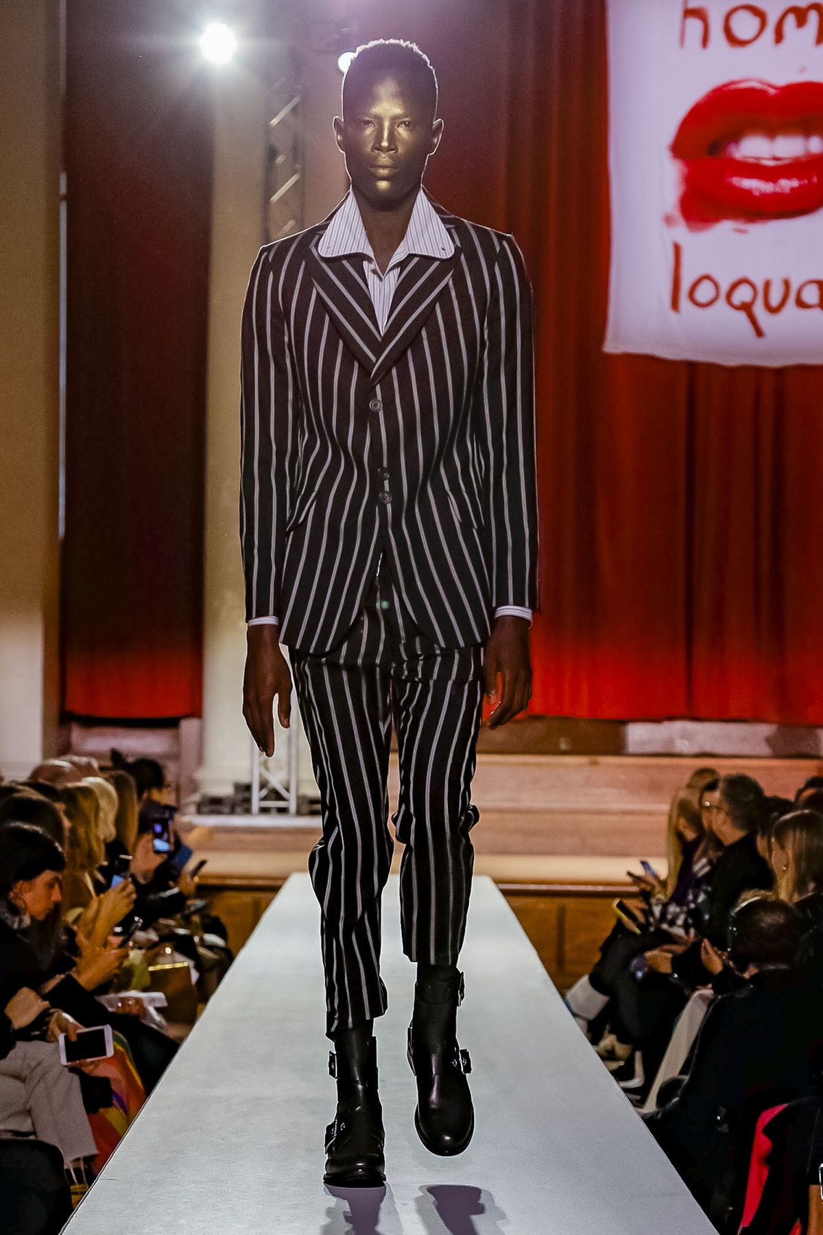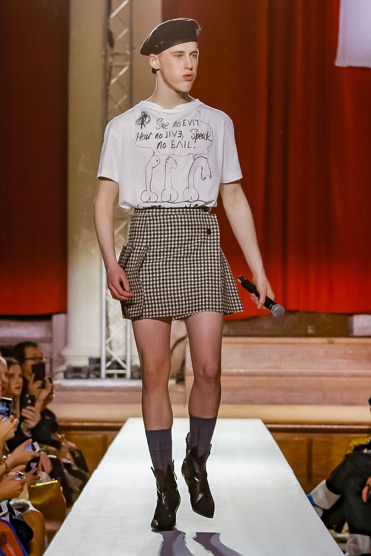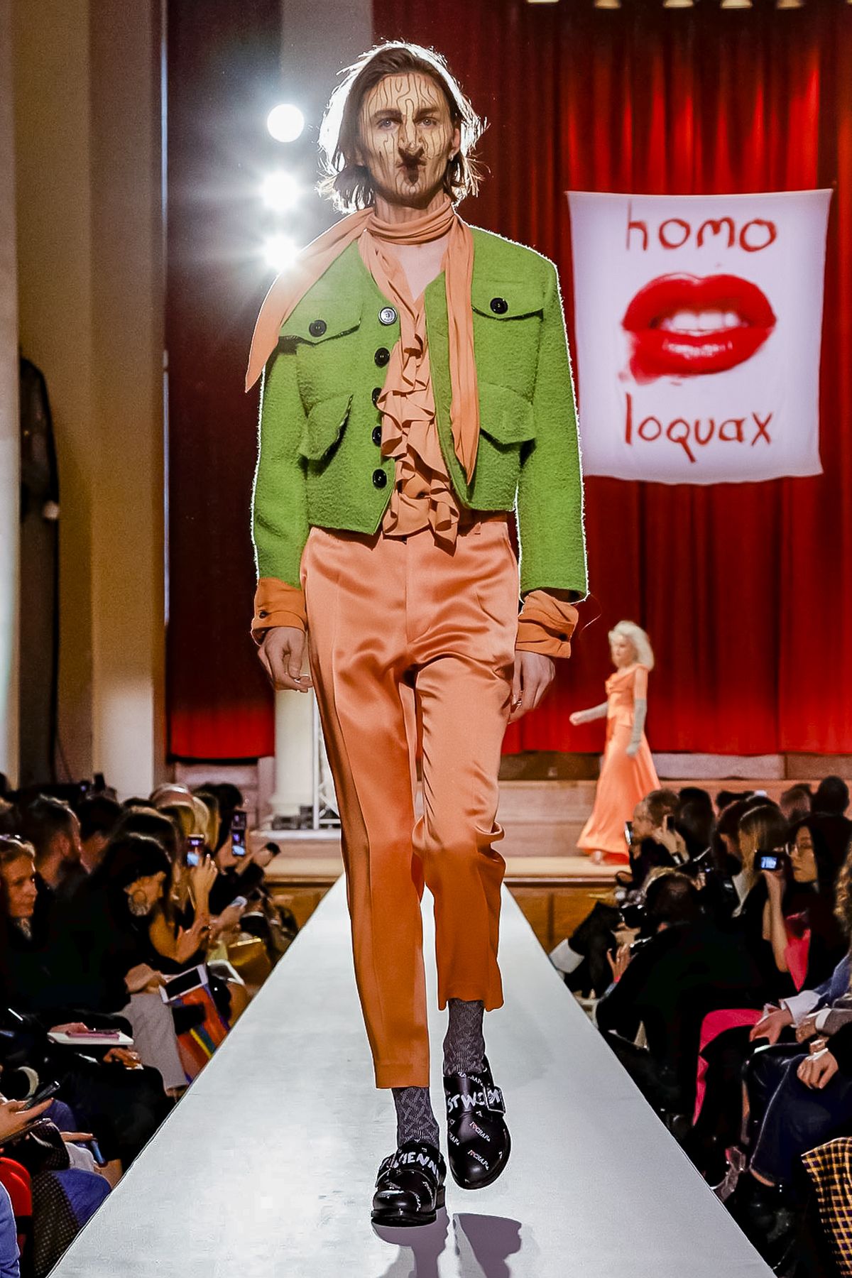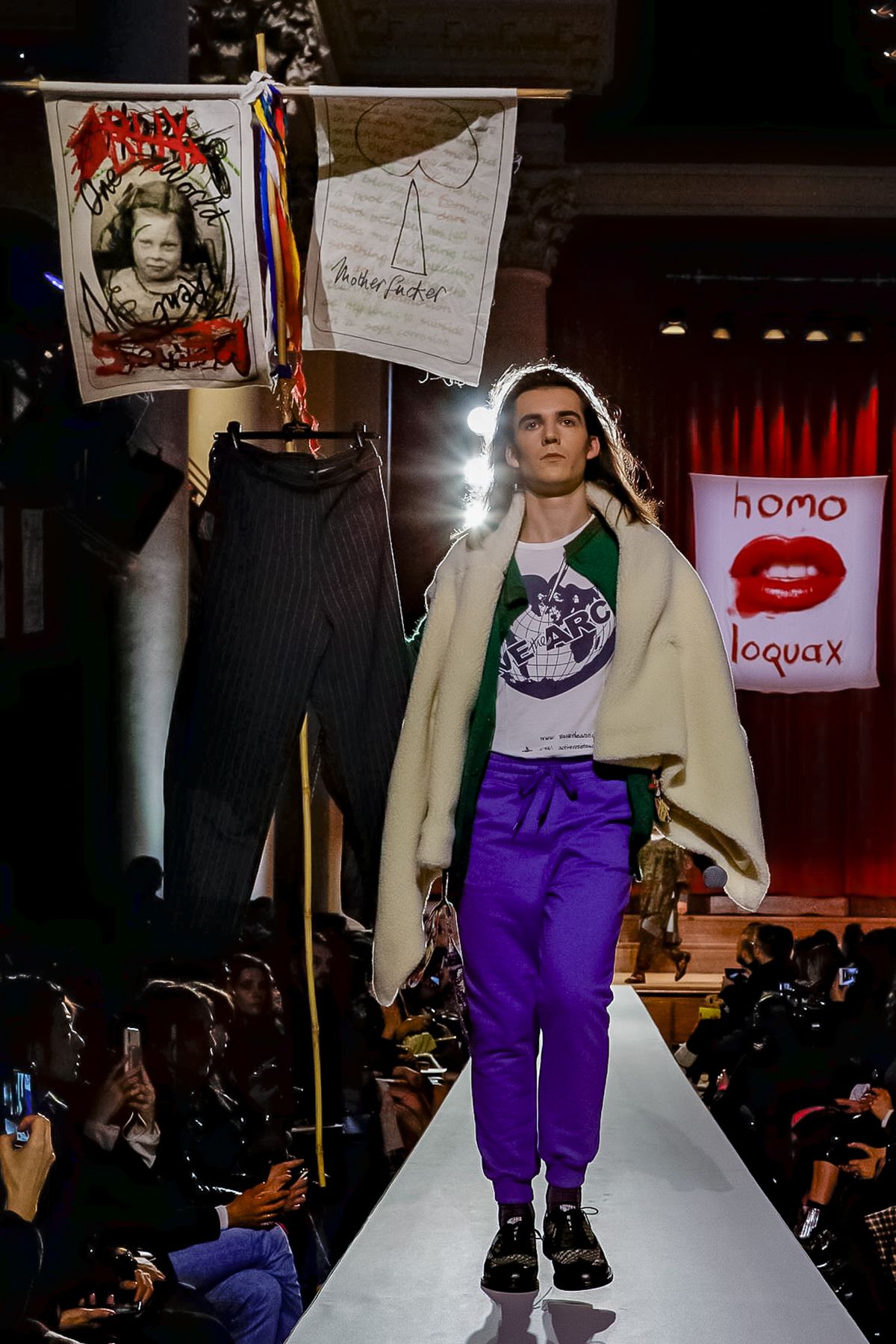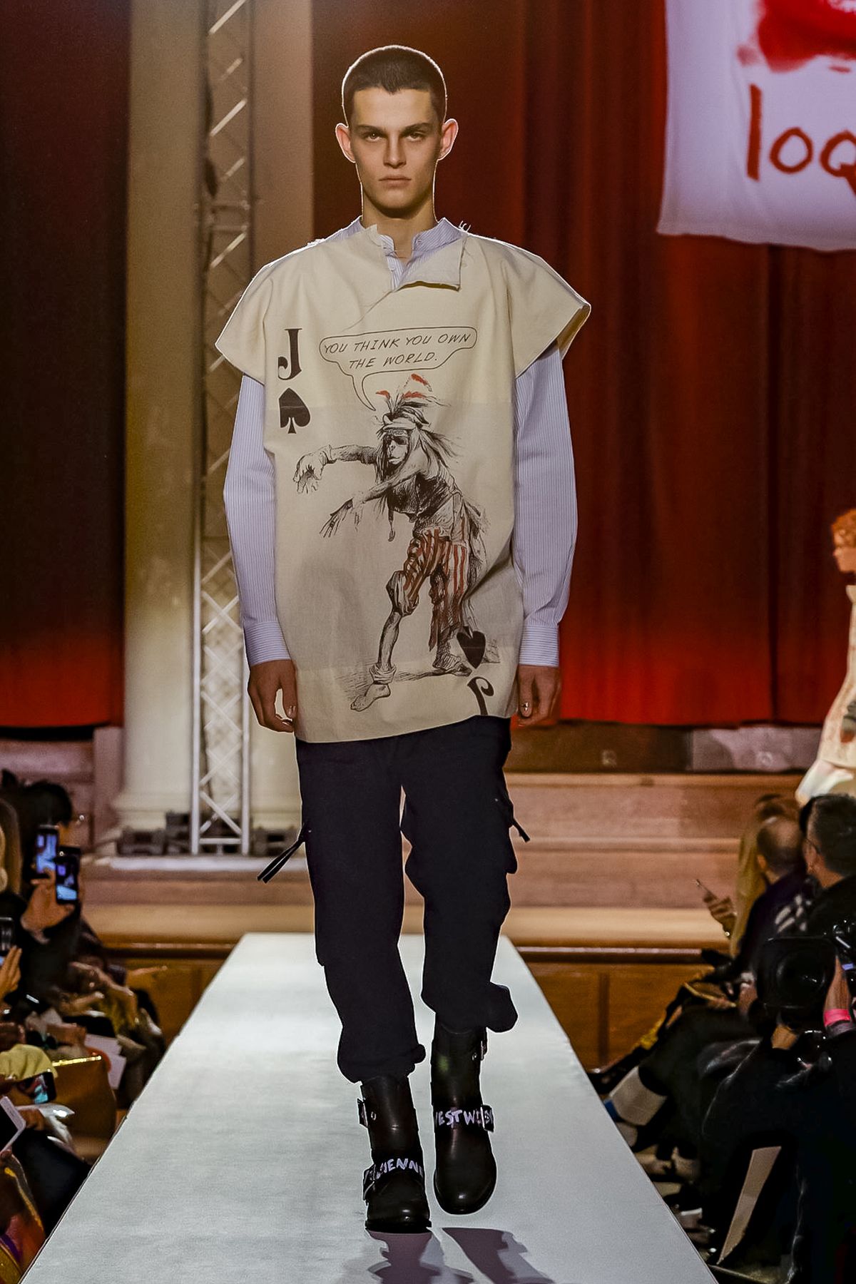 “I bought this coat last year, it’s called the Prince Coat; it’s a classic,” announced model and activist Hugo Hamlet, proudly gesturing to his oversized checked topper which, in truth, was from the fall 2018 collection, one of Westwood’s favorite styles; she repeats it every season. Fair enough; it’s a nice coat.