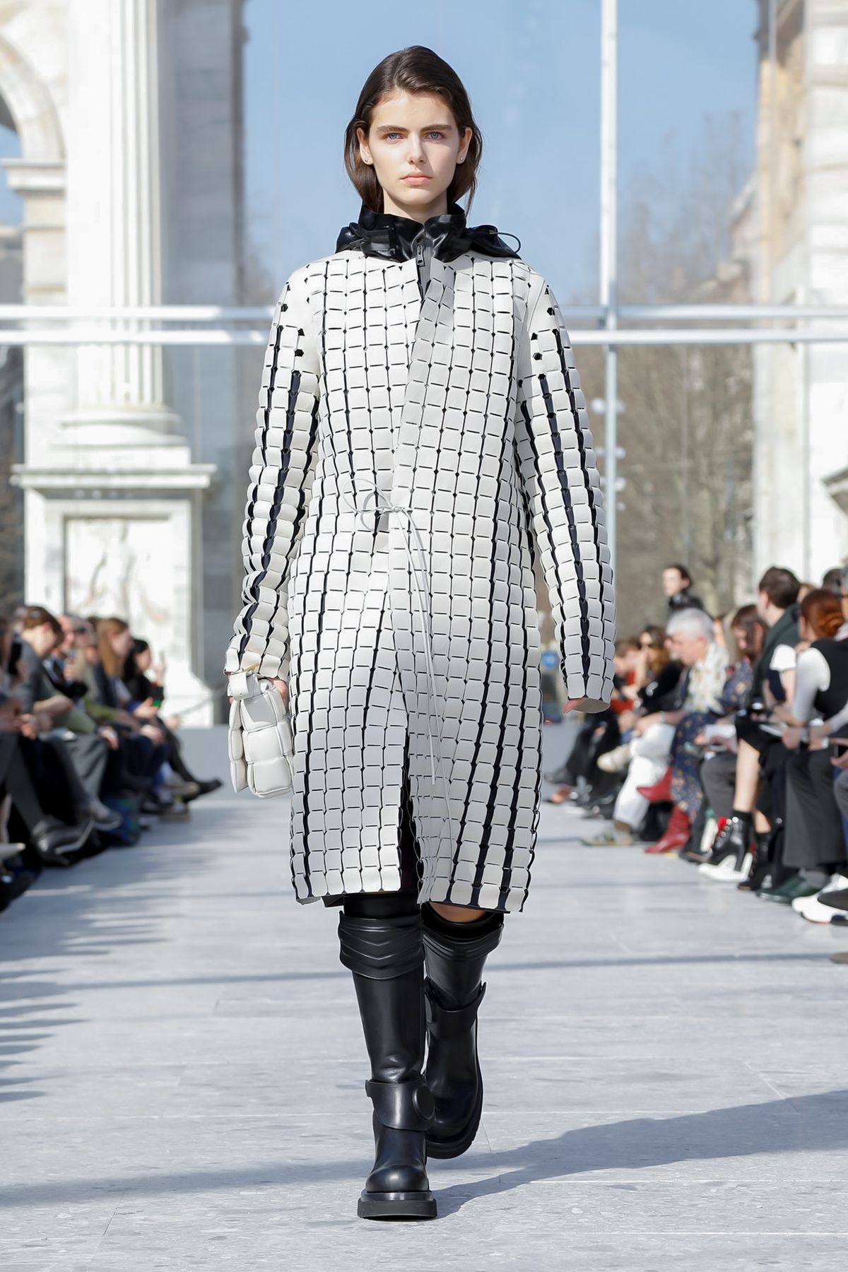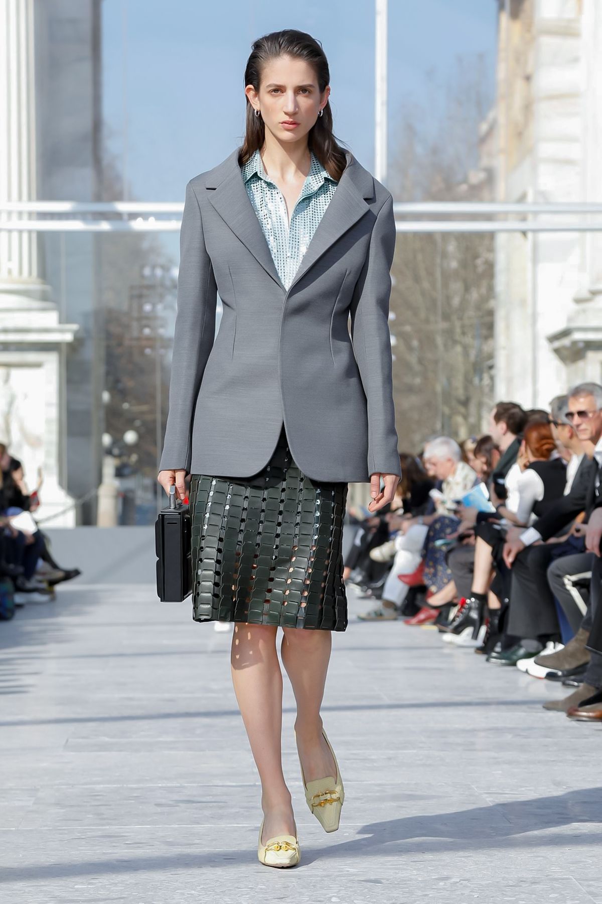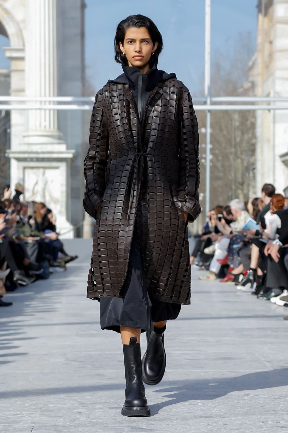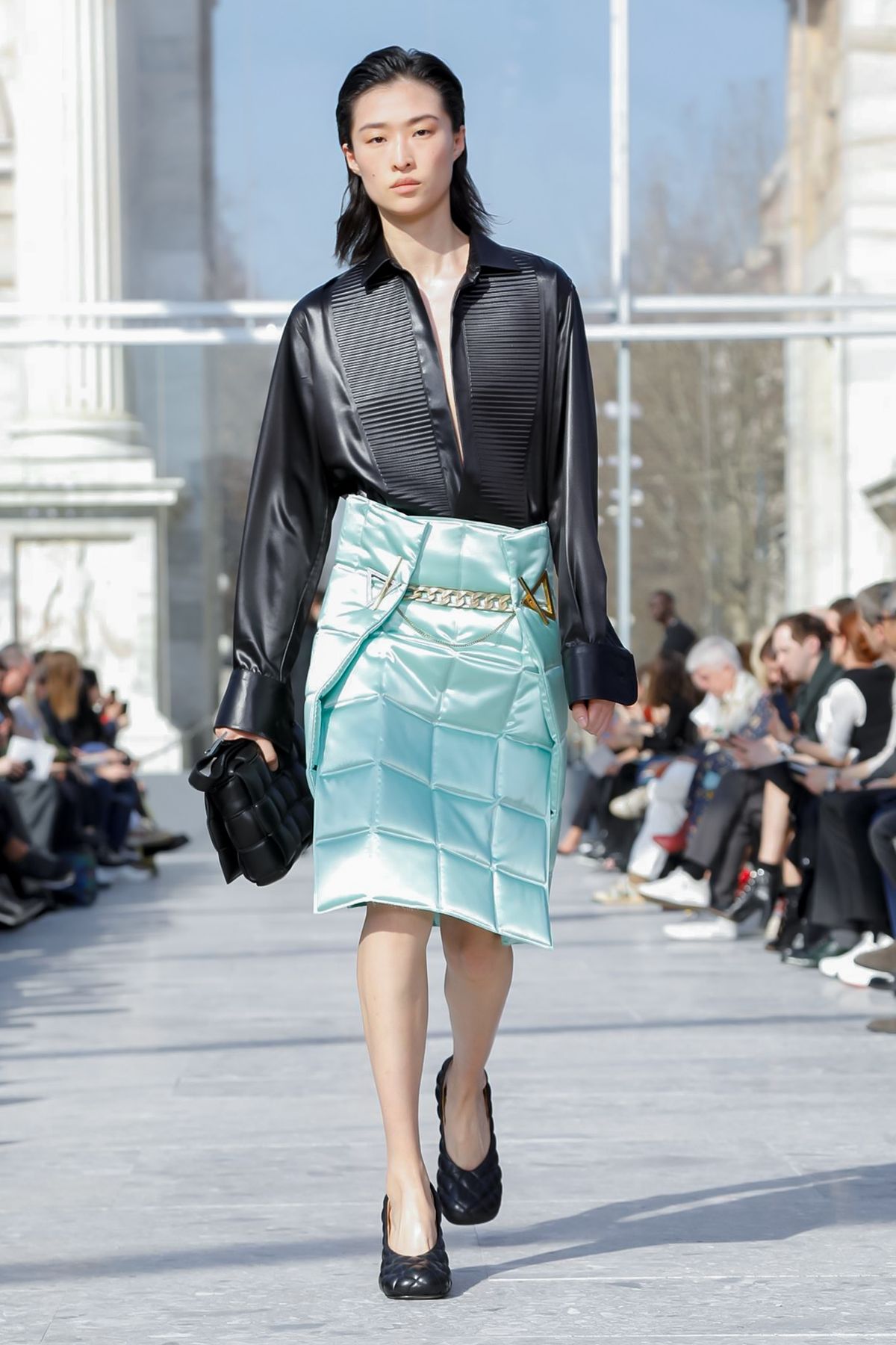 At Palazzo Archinto, for his first collection at the head of Bottega Veneta Daniel Lee showed a razor-sharp, almost futuristic collection, reinterpreting the house’s Intrecciato weave.