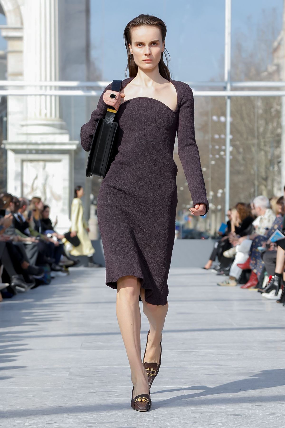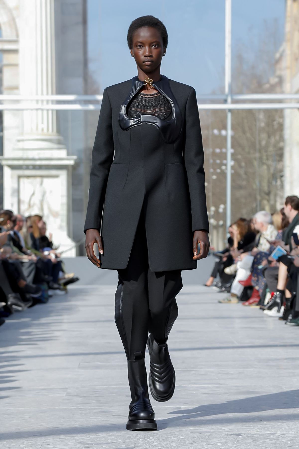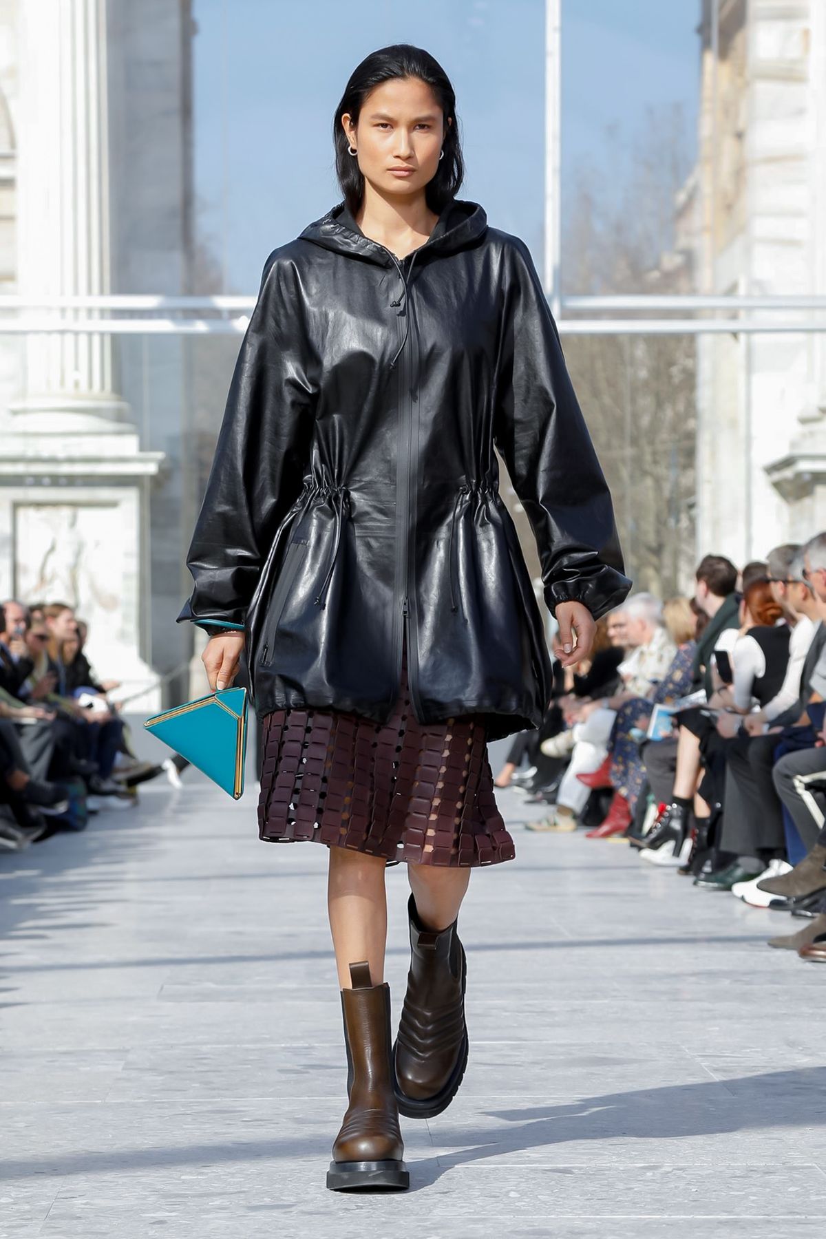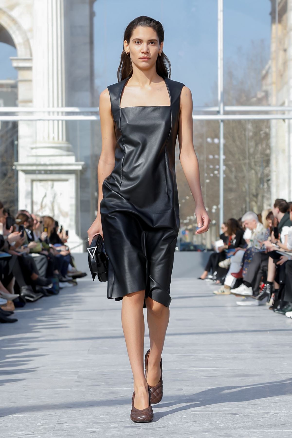 At Palazzo Archinto, for his first collection at the head of Bottega Veneta Daniel Lee showed a razor-sharp, almost futuristic collection, reinterpreting the house’s Intrecciato weave.