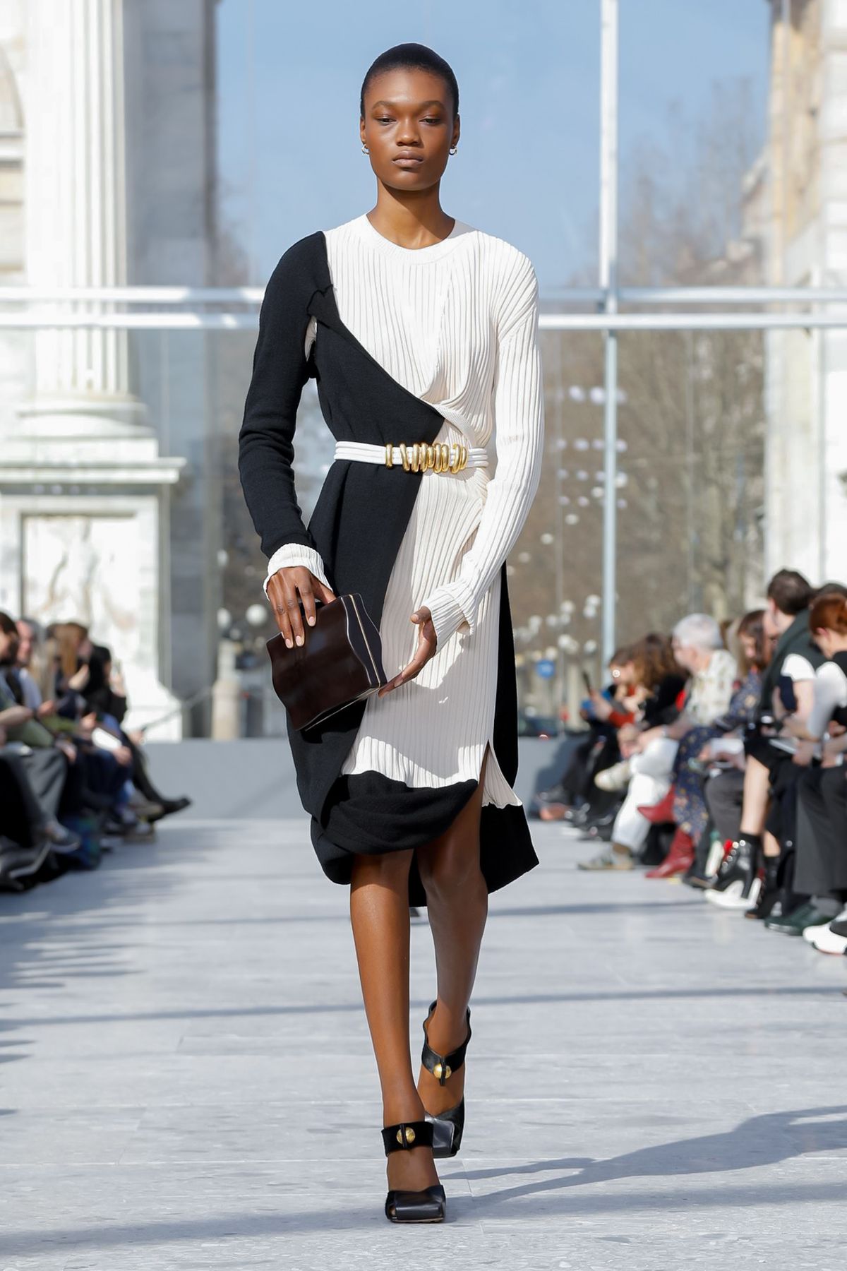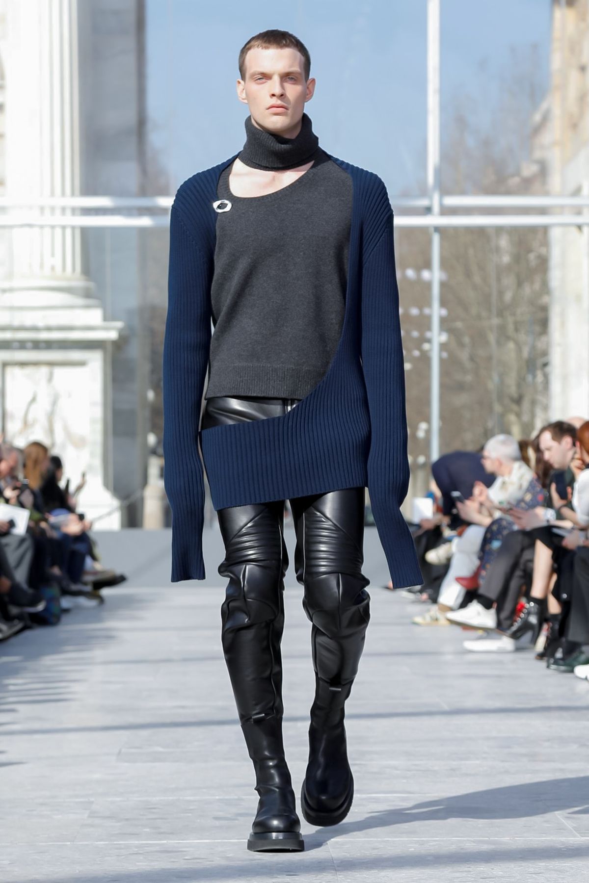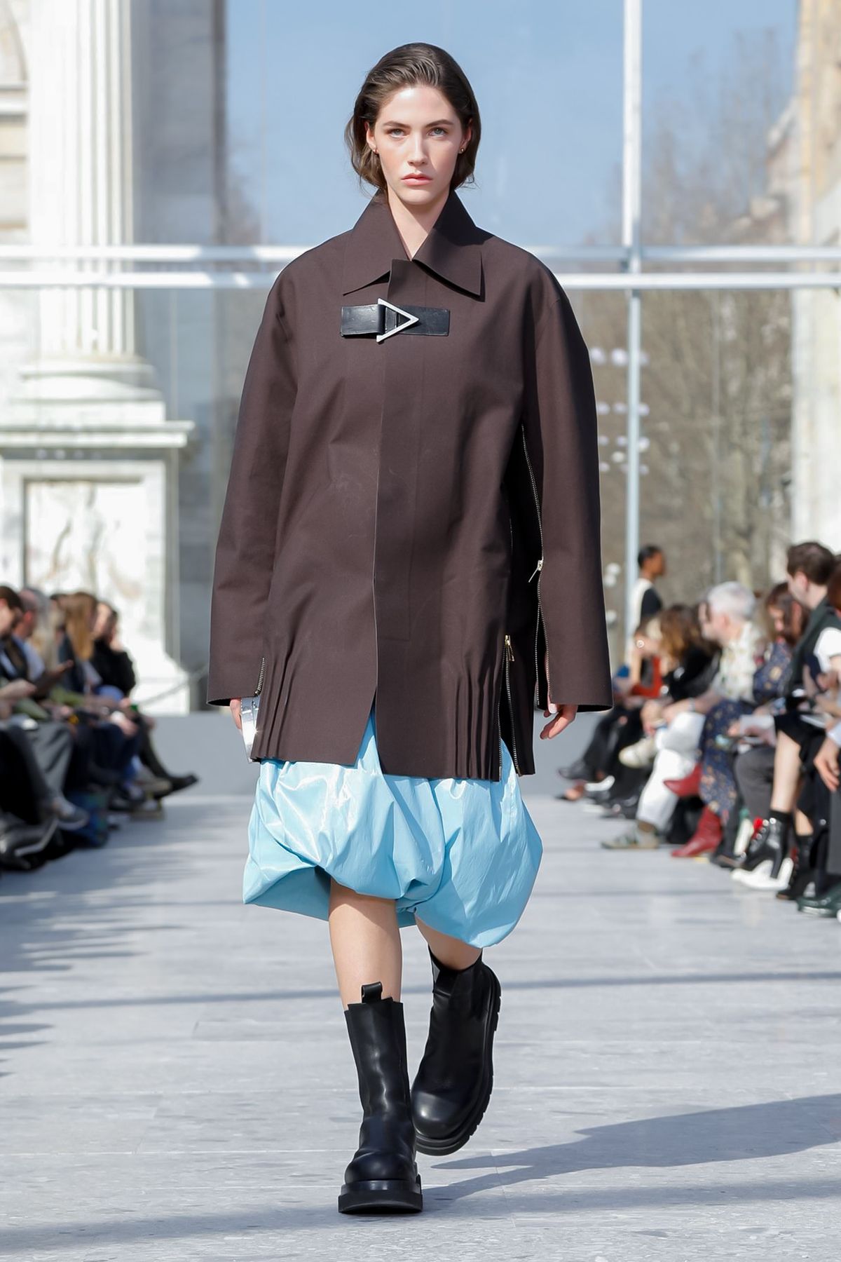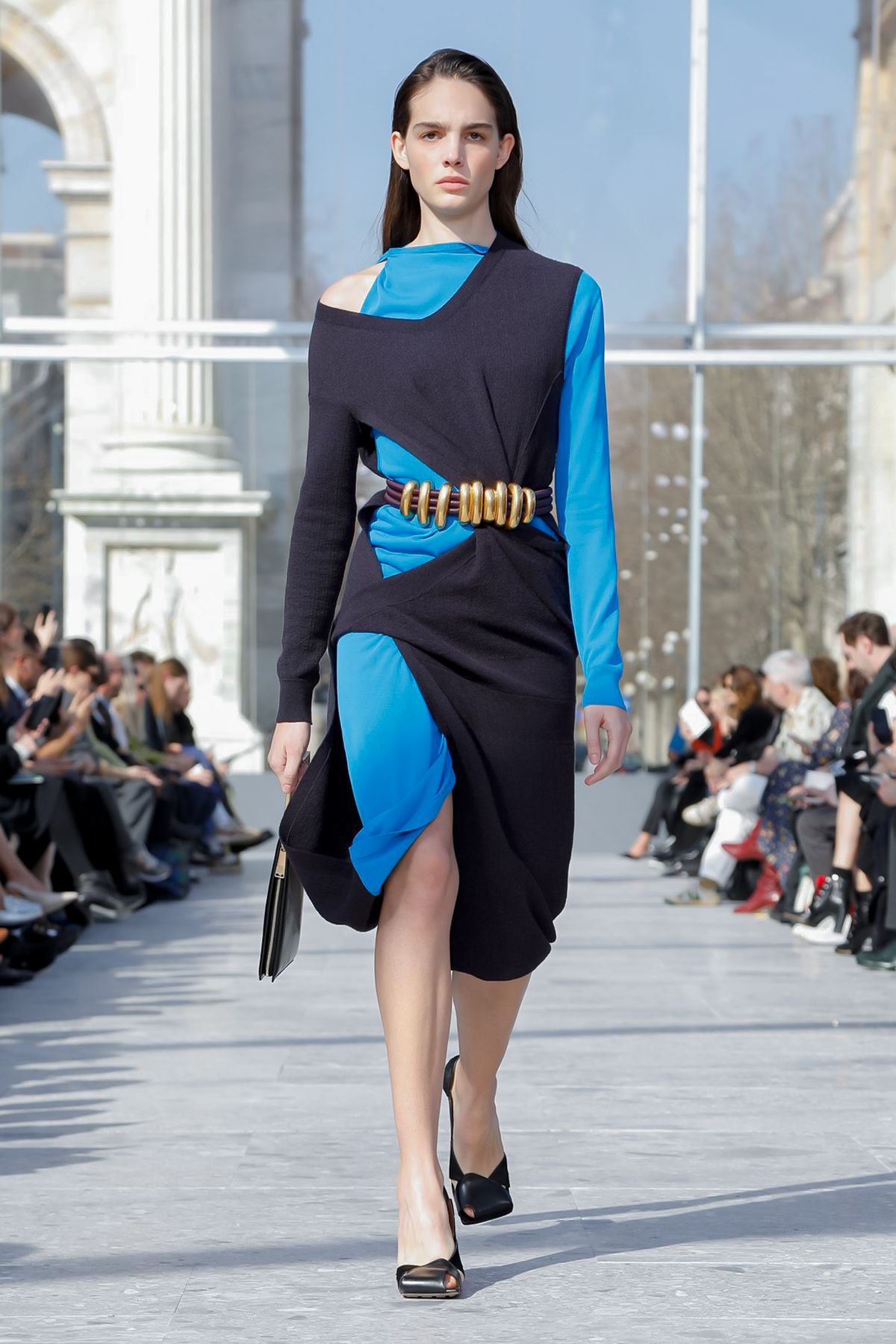 At Palazzo Archinto, for his first collection at the head of Bottega Veneta Daniel Lee showed a razor-sharp, almost futuristic collection, reinterpreting the house’s Intrecciato weave.