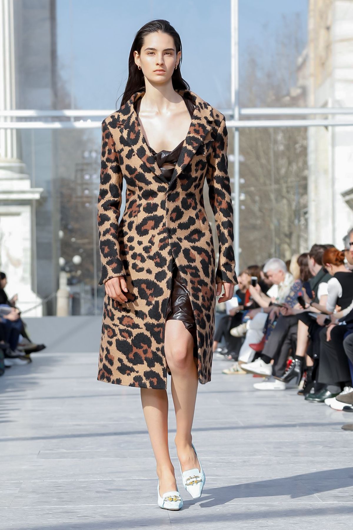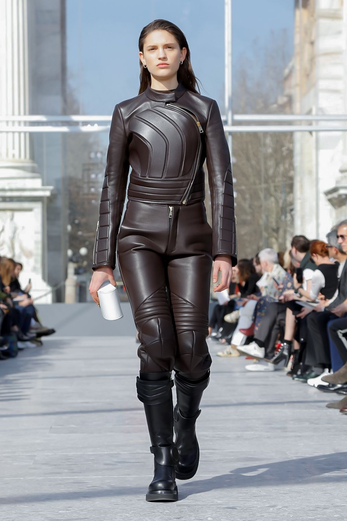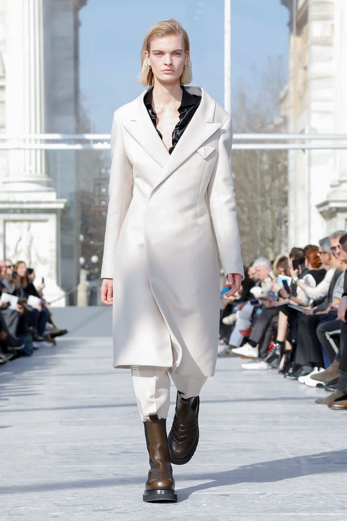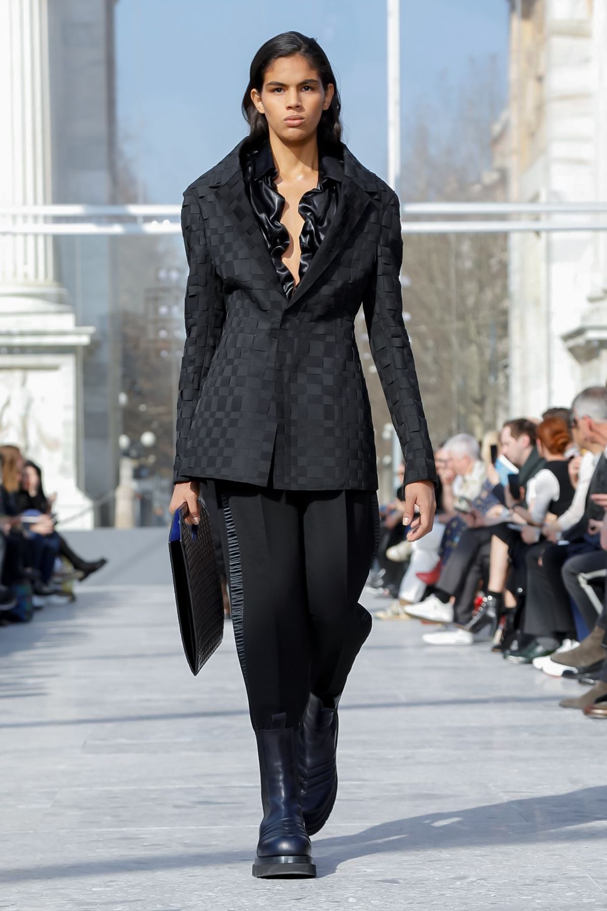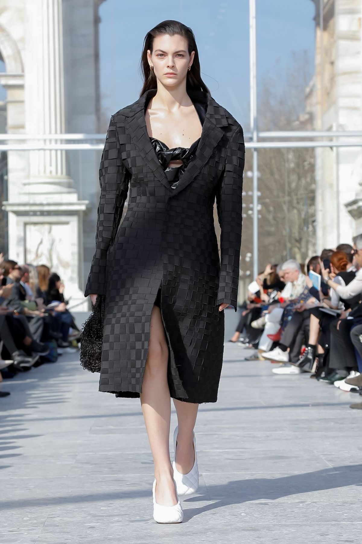 At Palazzo Archinto, for his first collection at the head of Bottega Veneta Daniel Lee showed a razor-sharp, almost futuristic collection, reinterpreting the house’s Intrecciato weave.