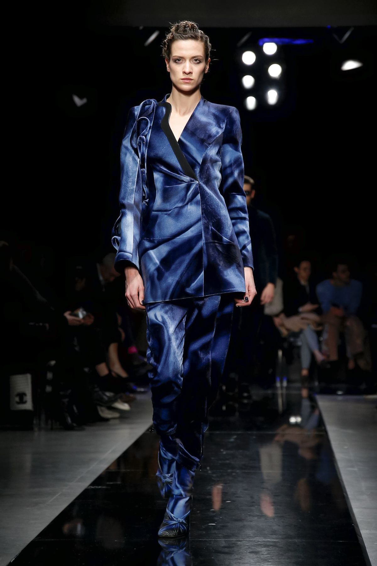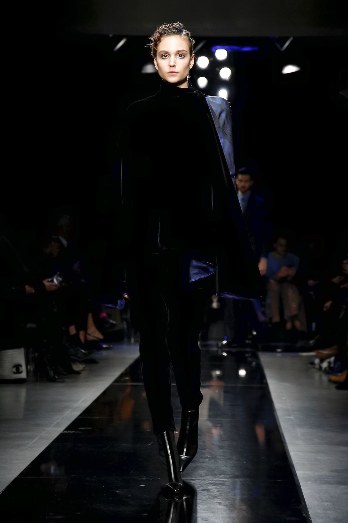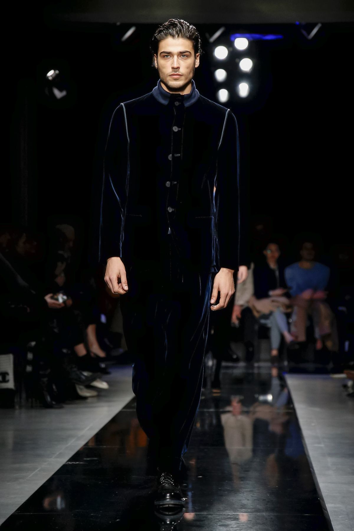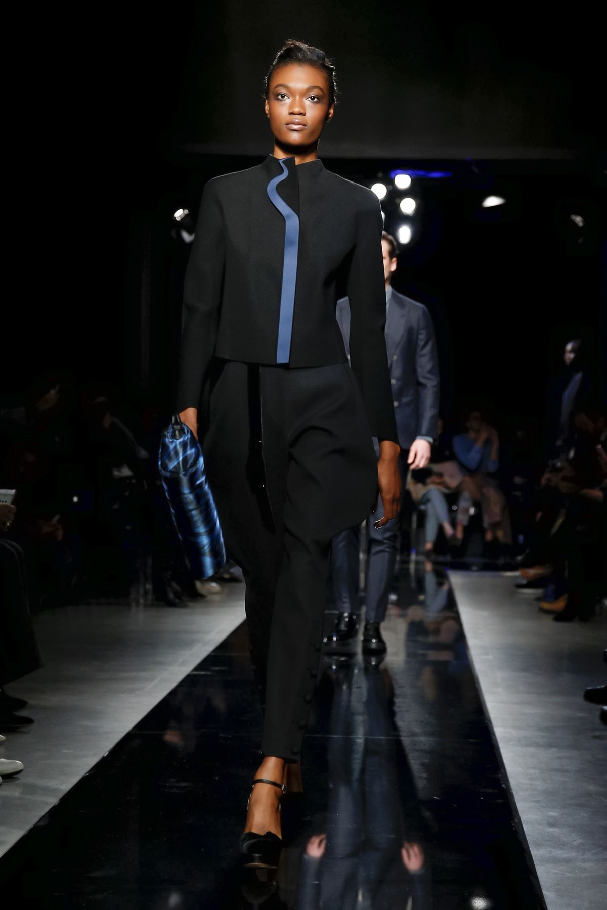 Maybe it was seeing the men and women on the runway together, united in 1,000 tones of blue and black, but there was a certain romantic lyricism to the way the collection unfolded, underscored by the smaller scale of the runway, which gave everyone orchestra seats to just what a hell of a cutter, draper and tailor the maestro still is.