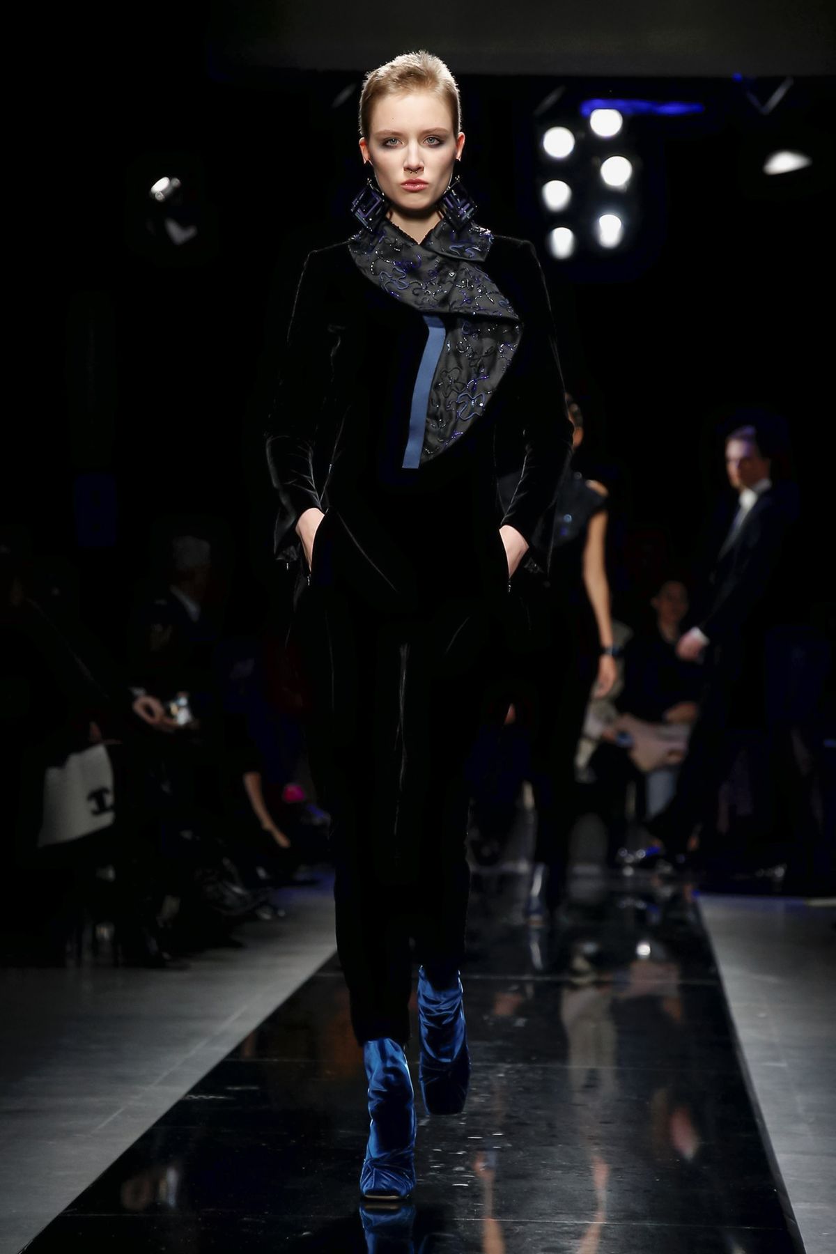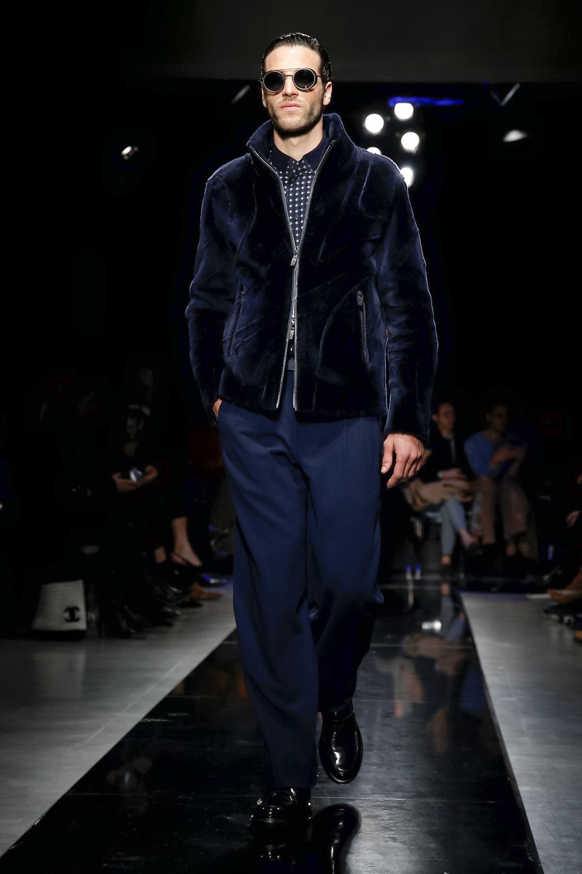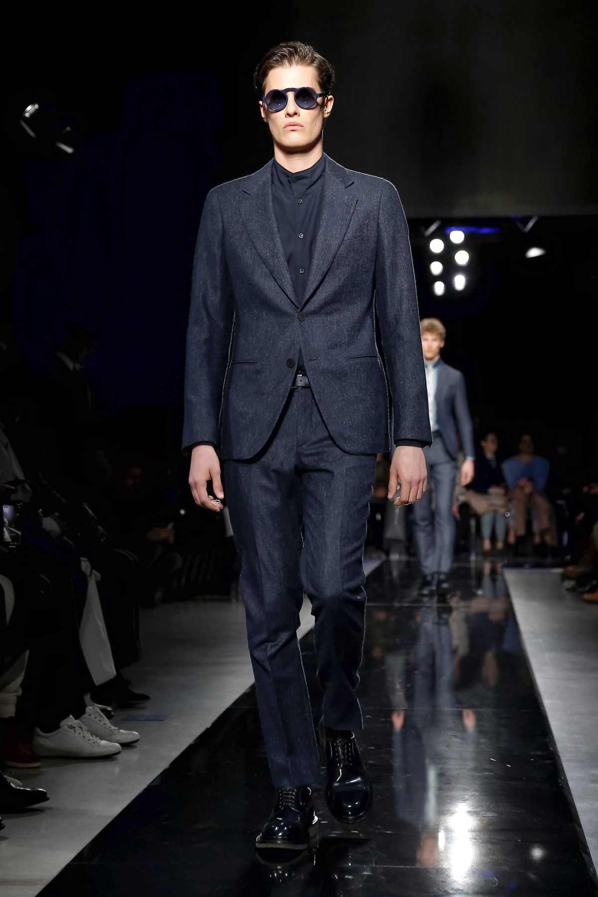 Maybe it was seeing the men and women on the runway together, united in 1,000 tones of blue and black, but there was a certain romantic lyricism to the way the collection unfolded, underscored by the smaller scale of the runway, which gave everyone orchestra seats to just what a hell of a cutter, draper and tailor the maestro still is.
