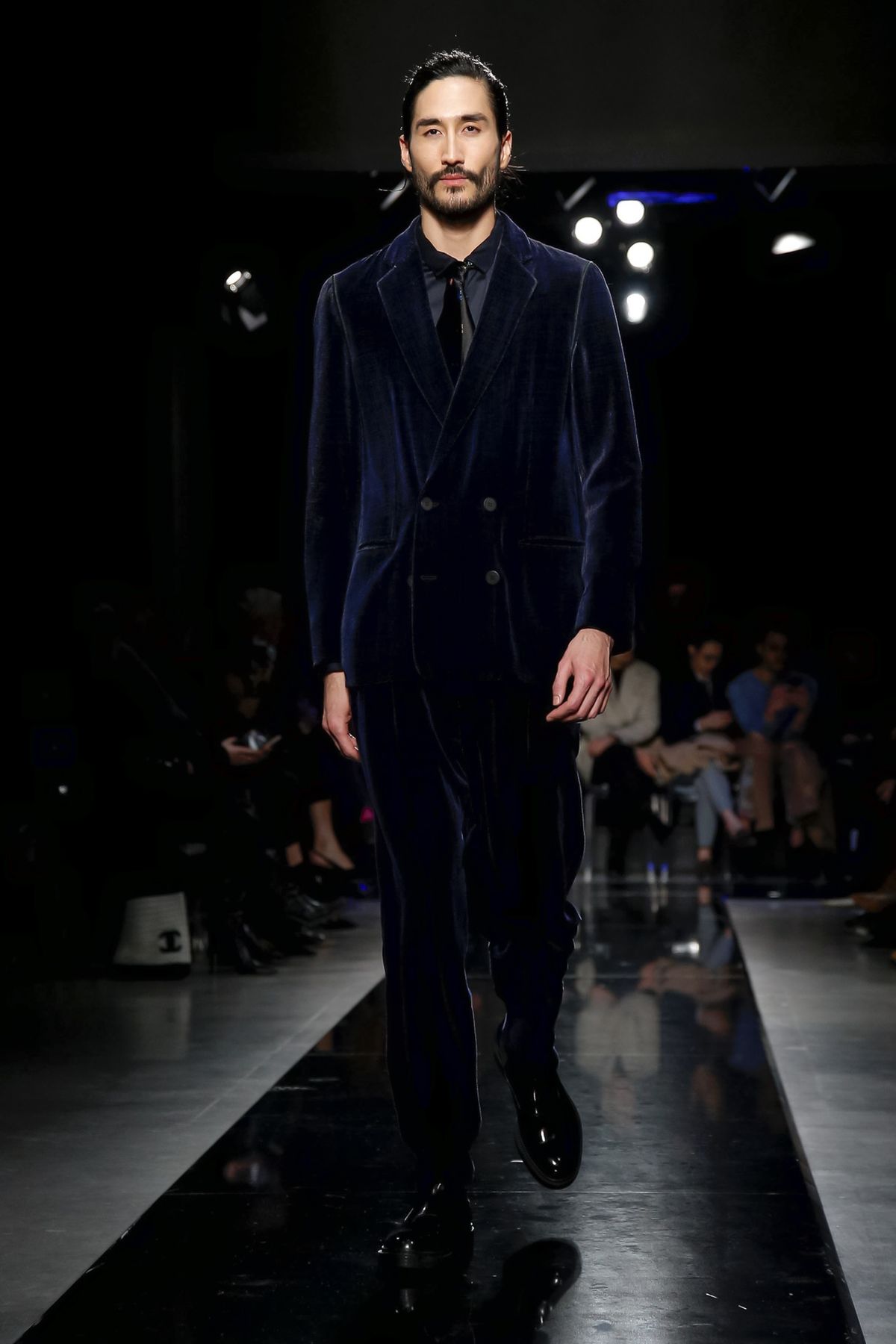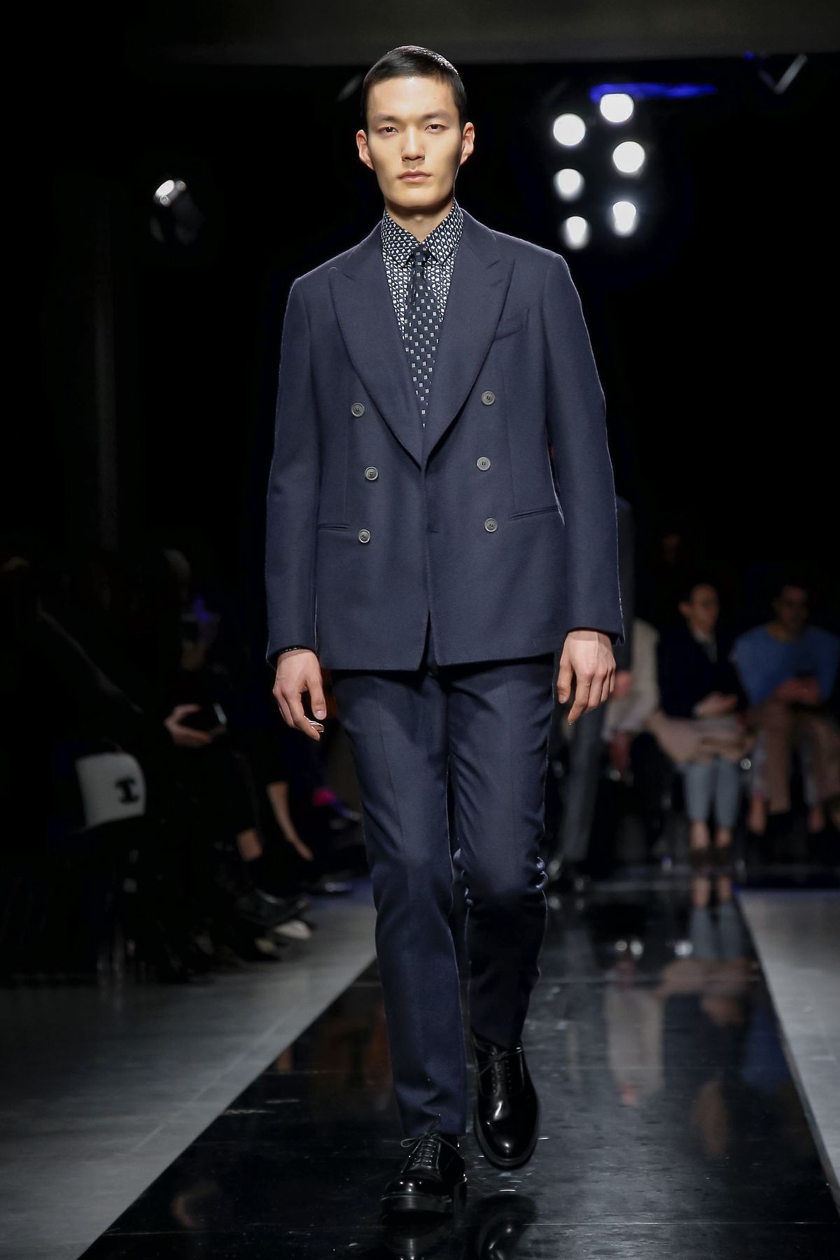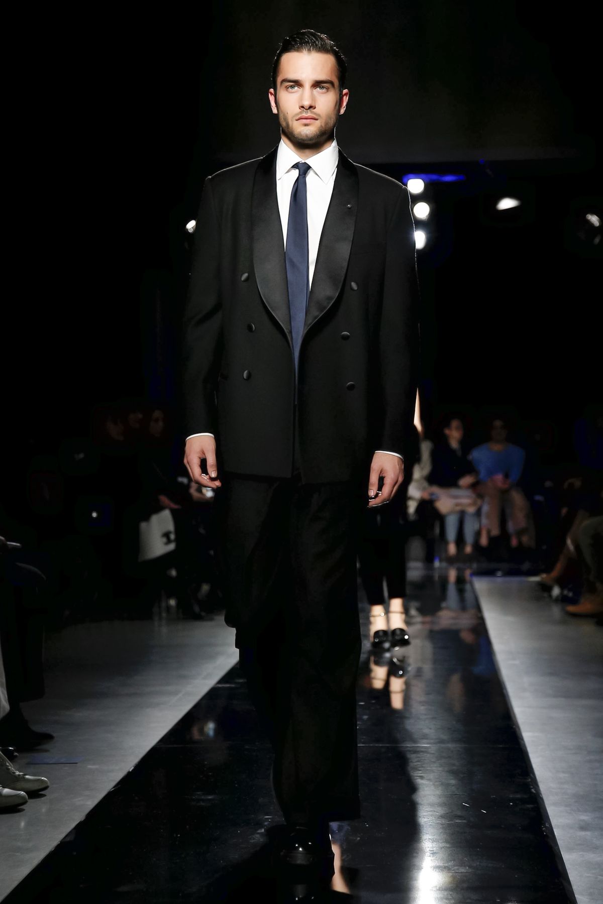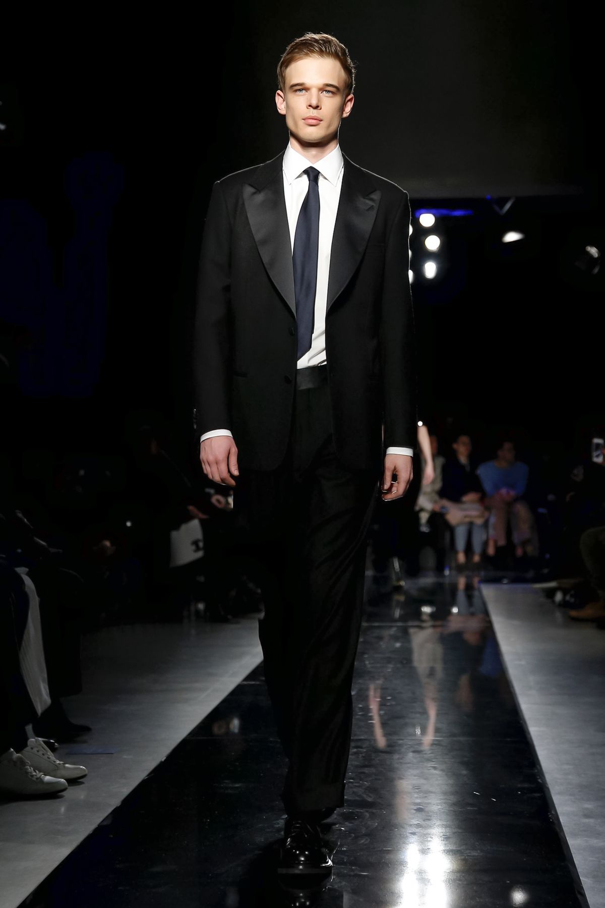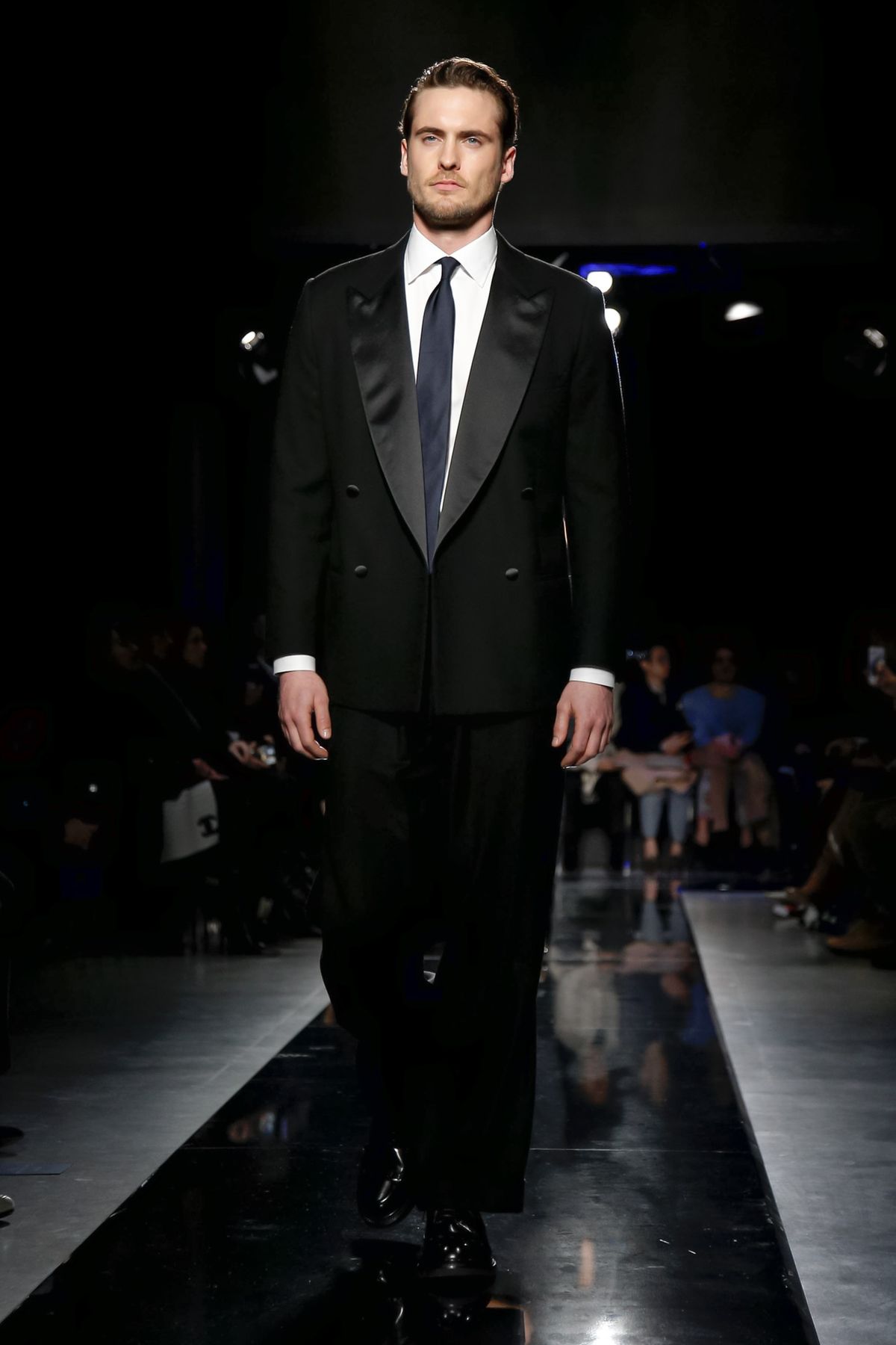 On the night before the Oscars, where Armani’s star always shines bright on the red carpet, the designer staged a cinematic work of his own in Milan: his first coed runway show at his Silos museum. It was a most elegant affair, a “Rhapsody in Blue” as he called it after the Gershwin song, in an intimate, couture-like setting that amplified the house’s signature refrain of fluid tailoring with some jazzy new flourishes.