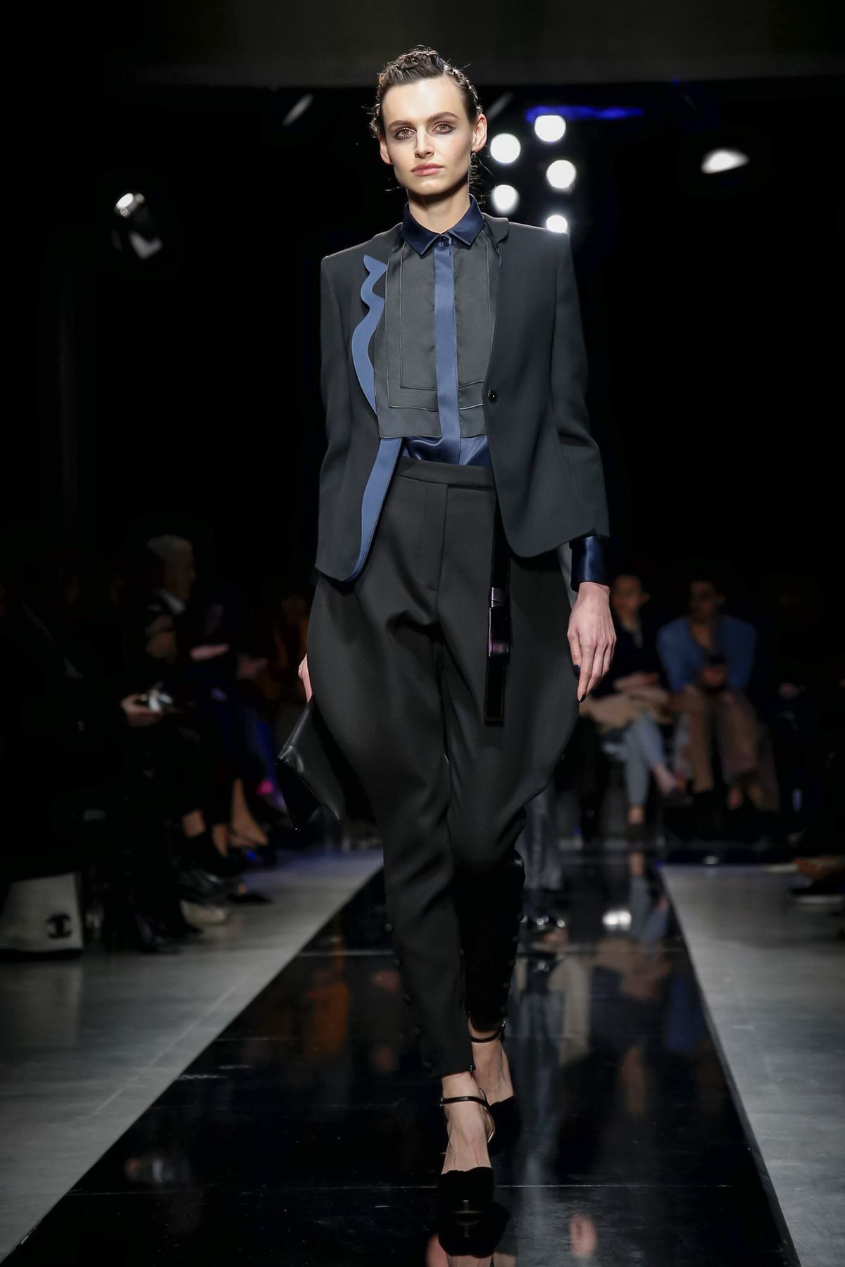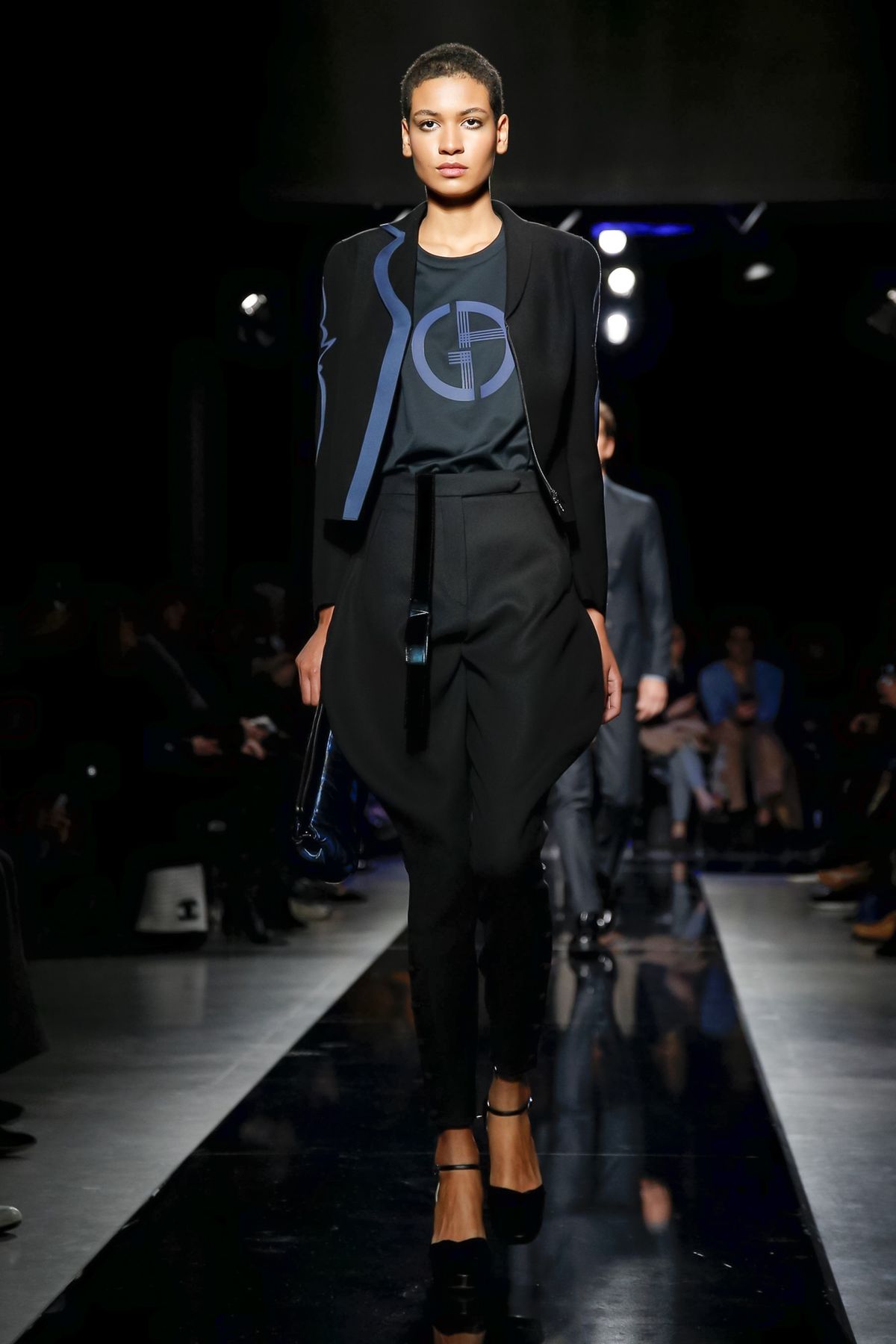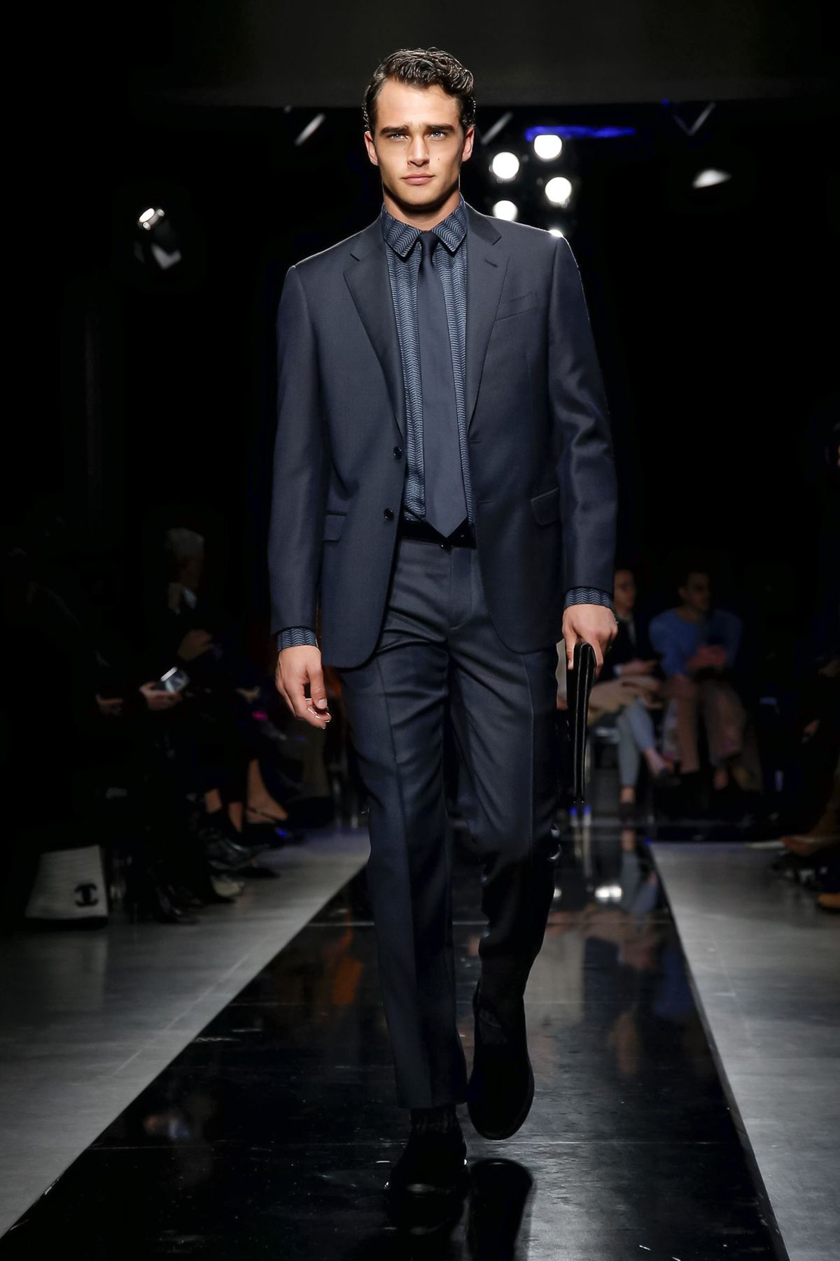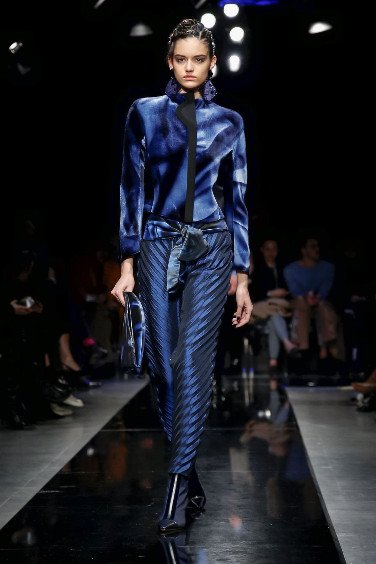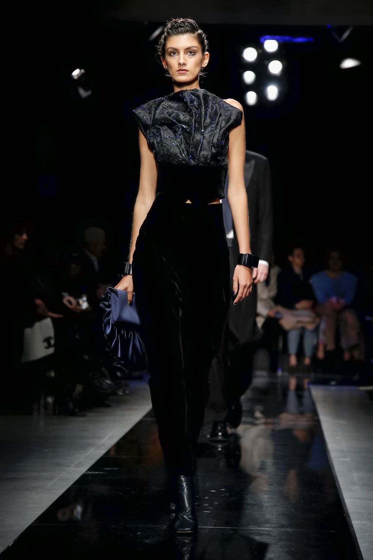 On the night before the Oscars, where Armani’s star always shines bright on the red carpet, the designer staged a cinematic work of his own in Milan: his first coed runway show at his Silos museum. It was a most elegant affair, a “Rhapsody in Blue” as he called it after the Gershwin song, in an intimate, couture-like setting that amplified the house’s signature refrain of fluid tailoring with some jazzy new flourishes.
